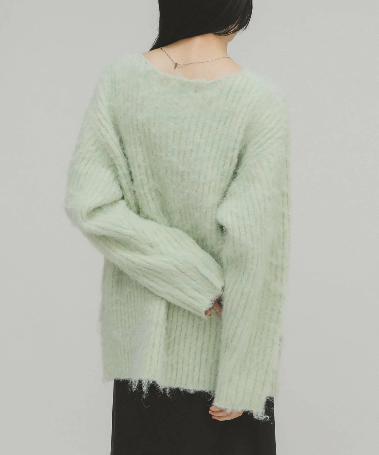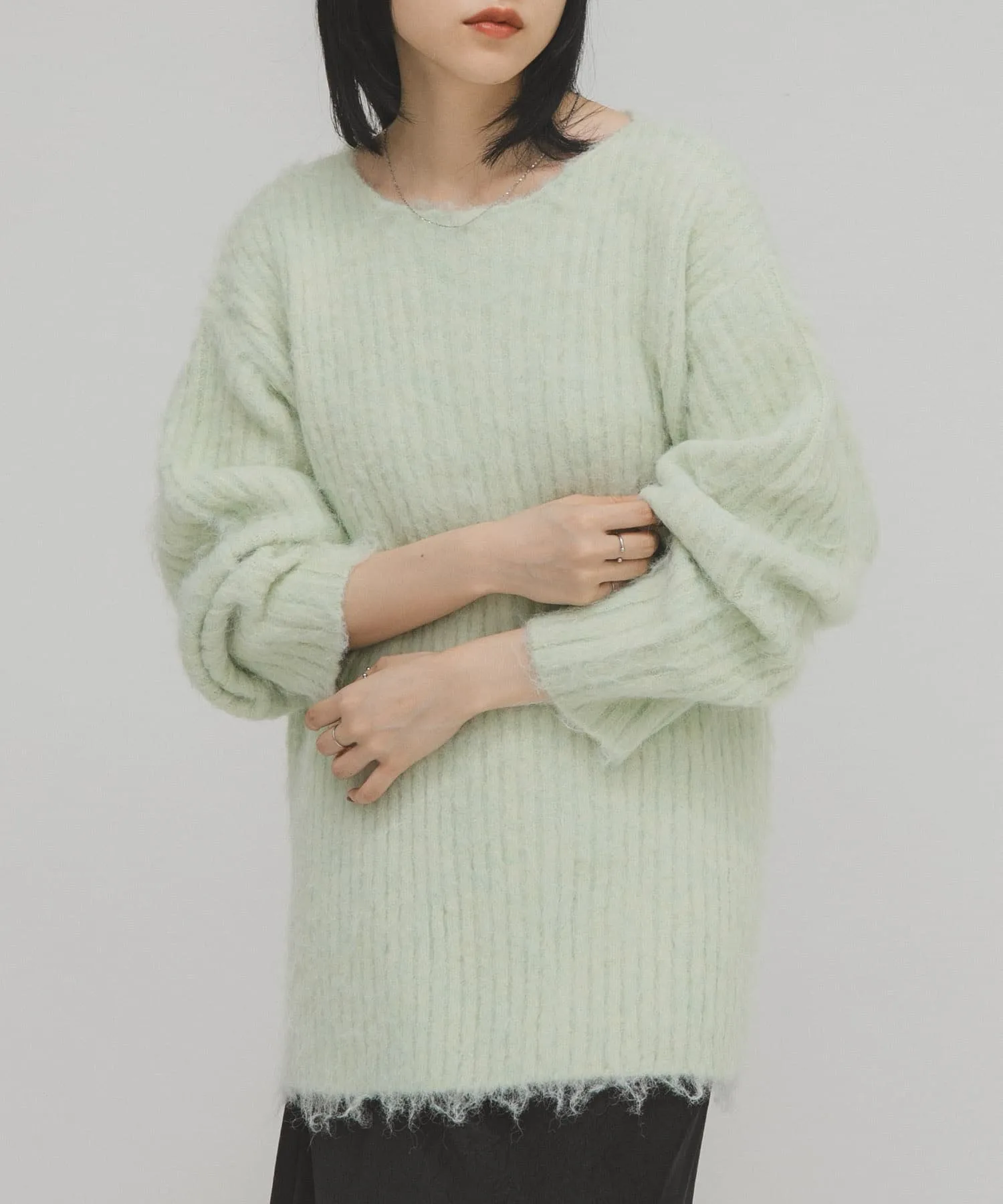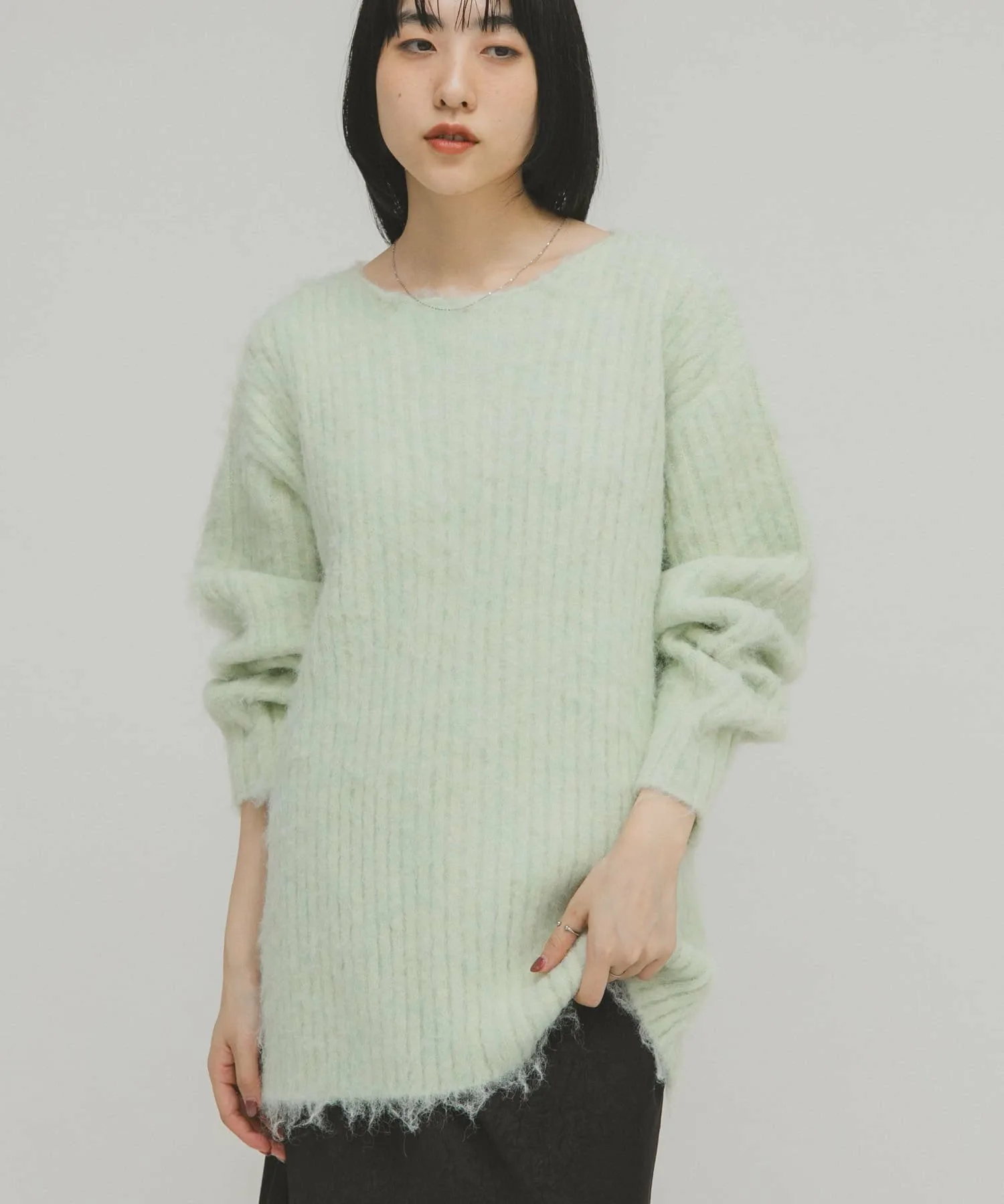 Женственный трикотаж с пушистой поверхностью и мягким на ощупь. Хотя ворсистые трикотажные изделия обычно выглядят объемными, ребристая вязка подчеркивает вертикальные линии, а вырез-лодочка создает женственный, расслабленный образ. Длина, закрывающая талию, и свободный силуэт также являются ключевыми особенностями.