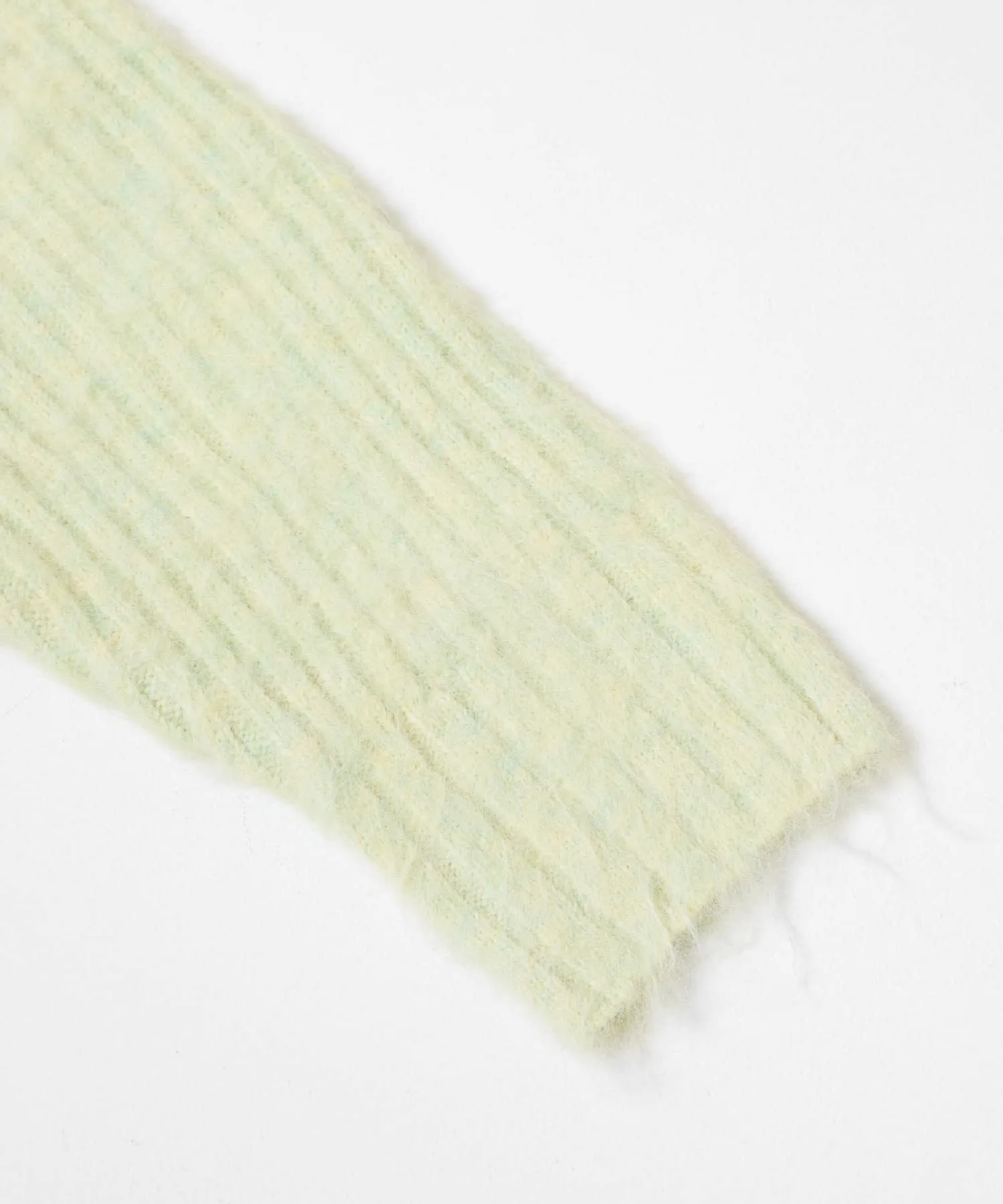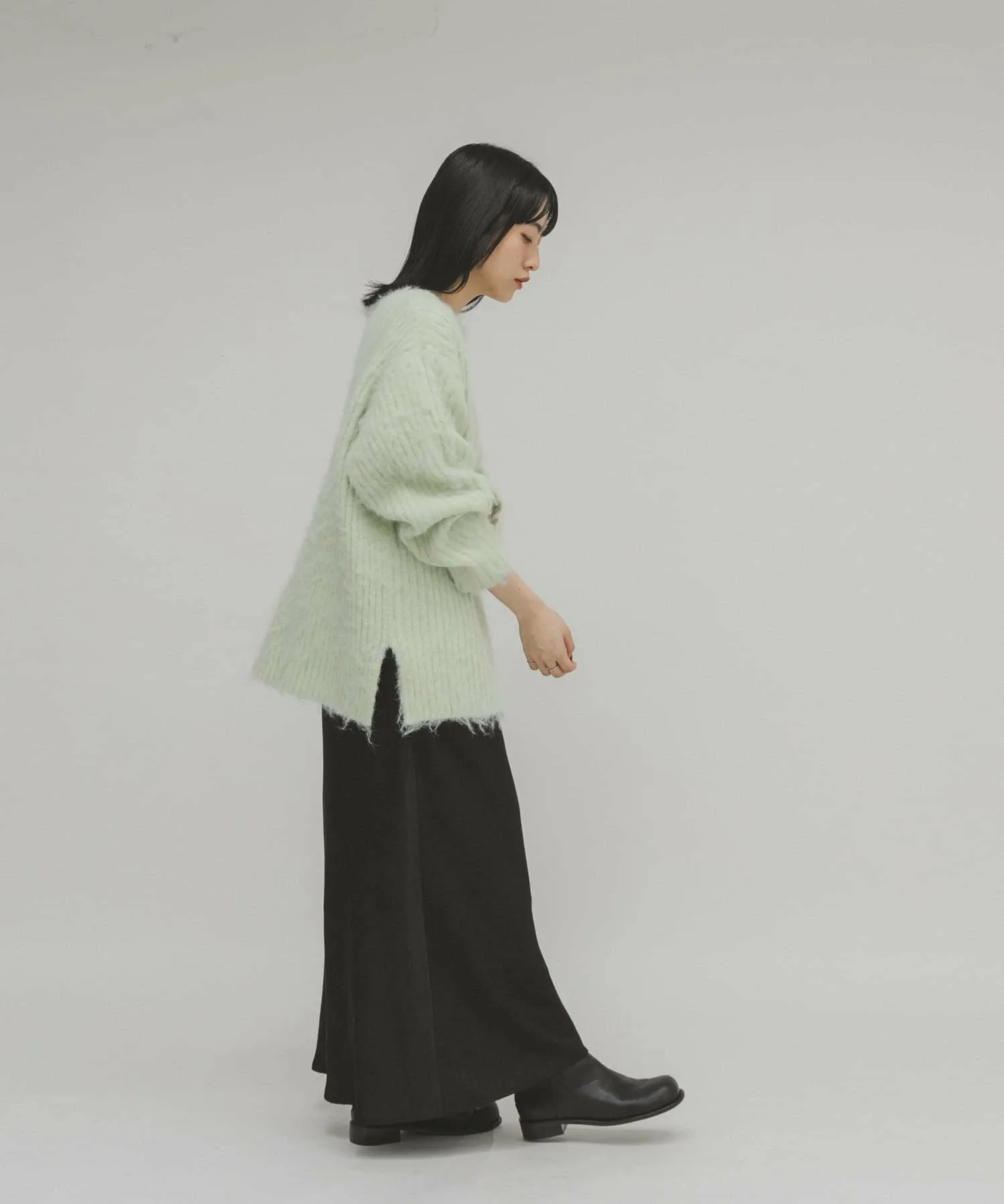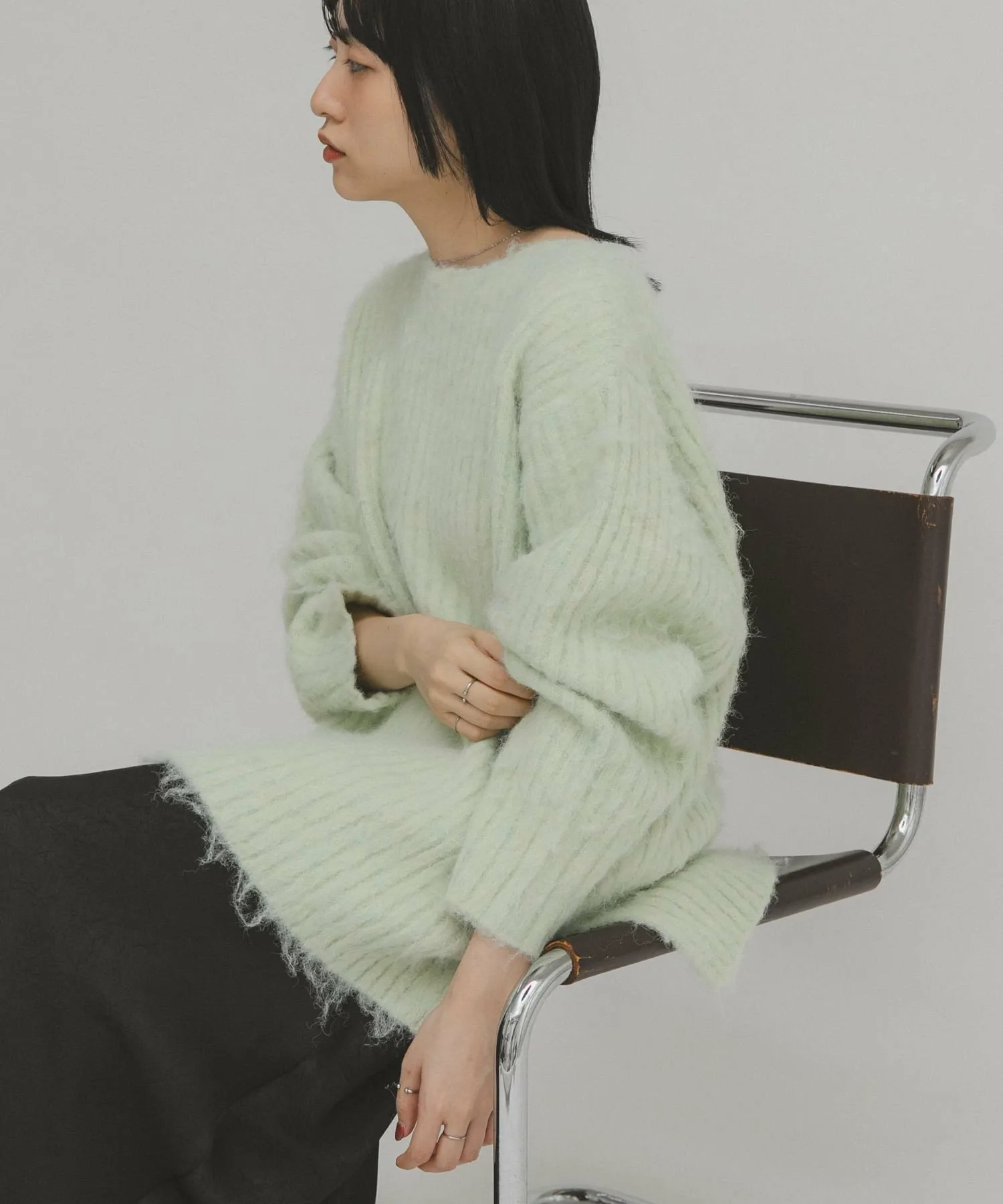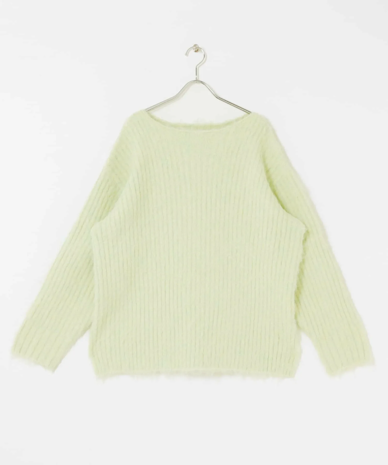 Женственный трикотаж с пушистой поверхностью и мягким на ощупь. Хотя ворсистые трикотажные изделия обычно выглядят объемными, ребристая вязка подчеркивает вертикальные линии, а вырез-лодочка создает женственный, расслабленный образ. Длина, закрывающая талию, и свободный силуэт также являются ключевыми особенностями.
