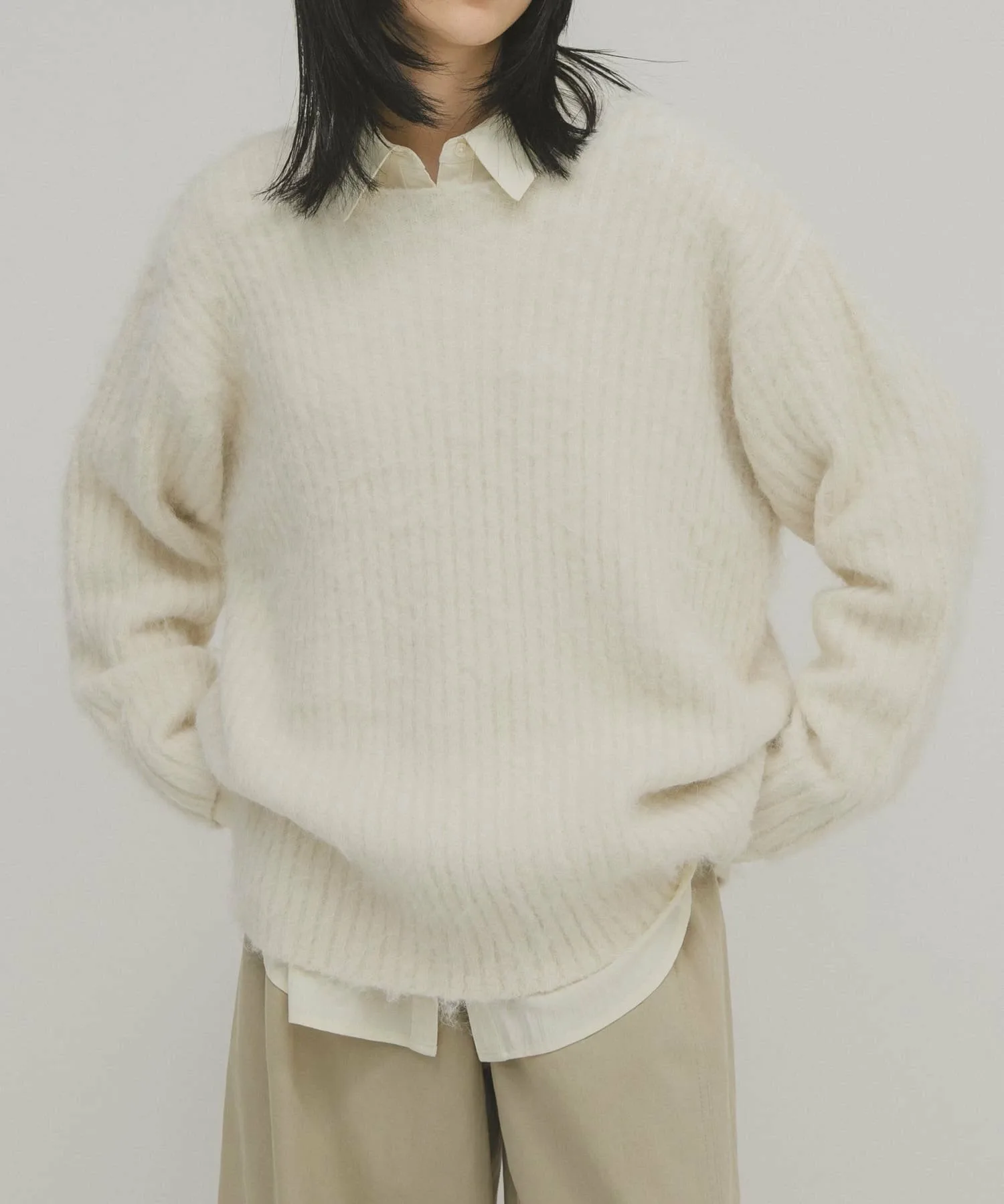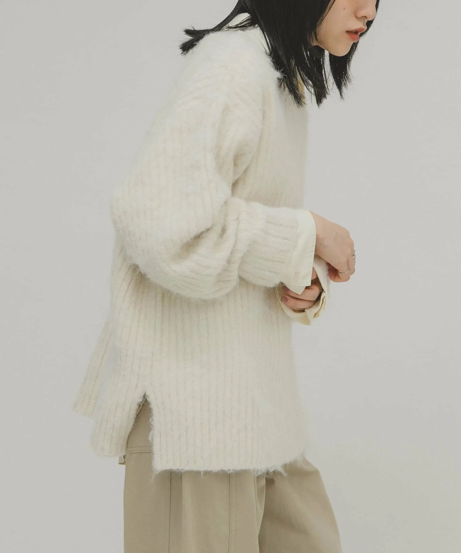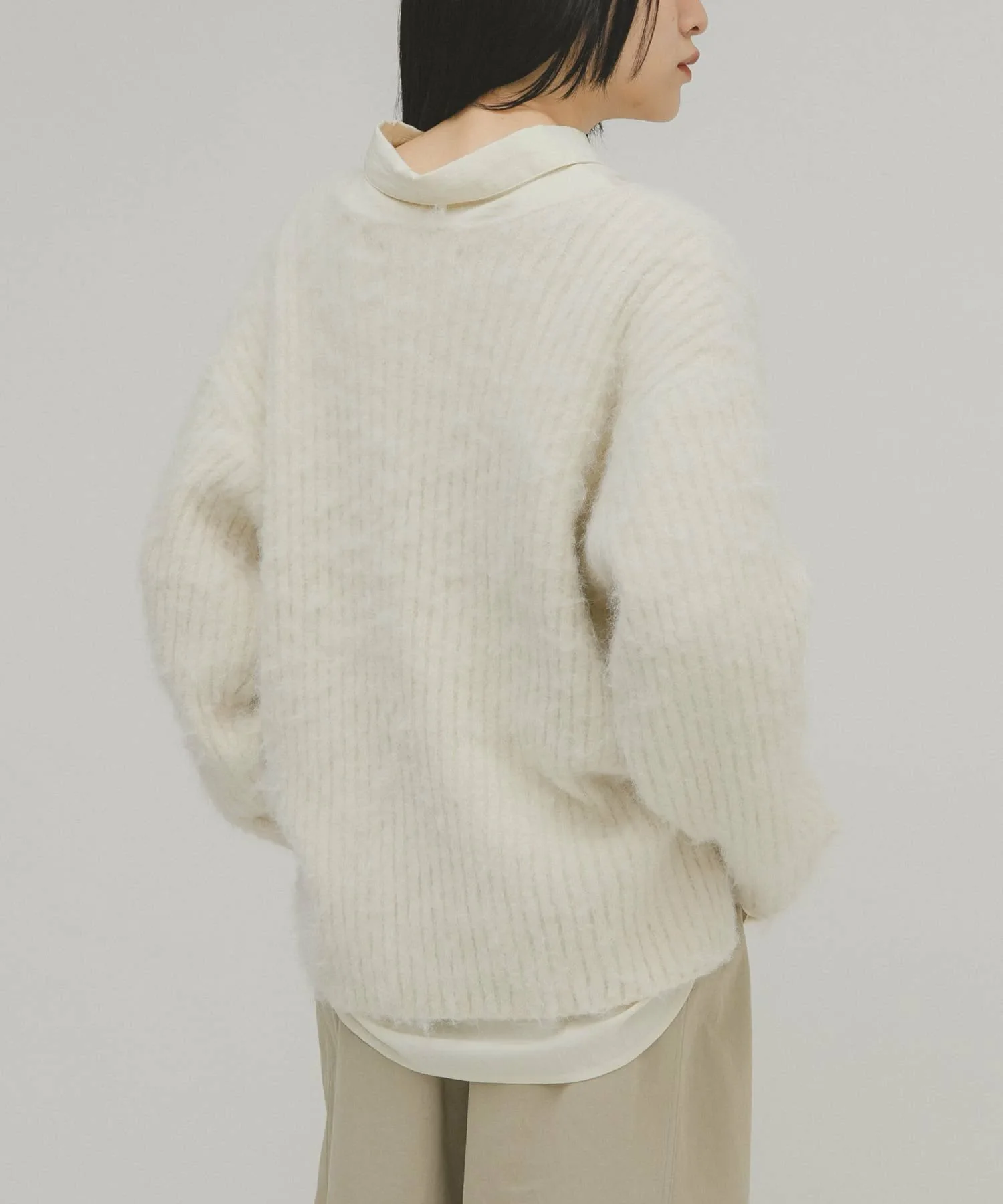 Женственный трикотаж с пушистой поверхностью и мягким на ощупь. Хотя ворсистые трикотажные изделия обычно выглядят объемными, ребристая вязка подчеркивает вертикальные линии, а вырез-лодочка создает женственный, расслабленный образ. Длина, закрывающая талию, и свободный силуэт также являются ключевыми особенностями.