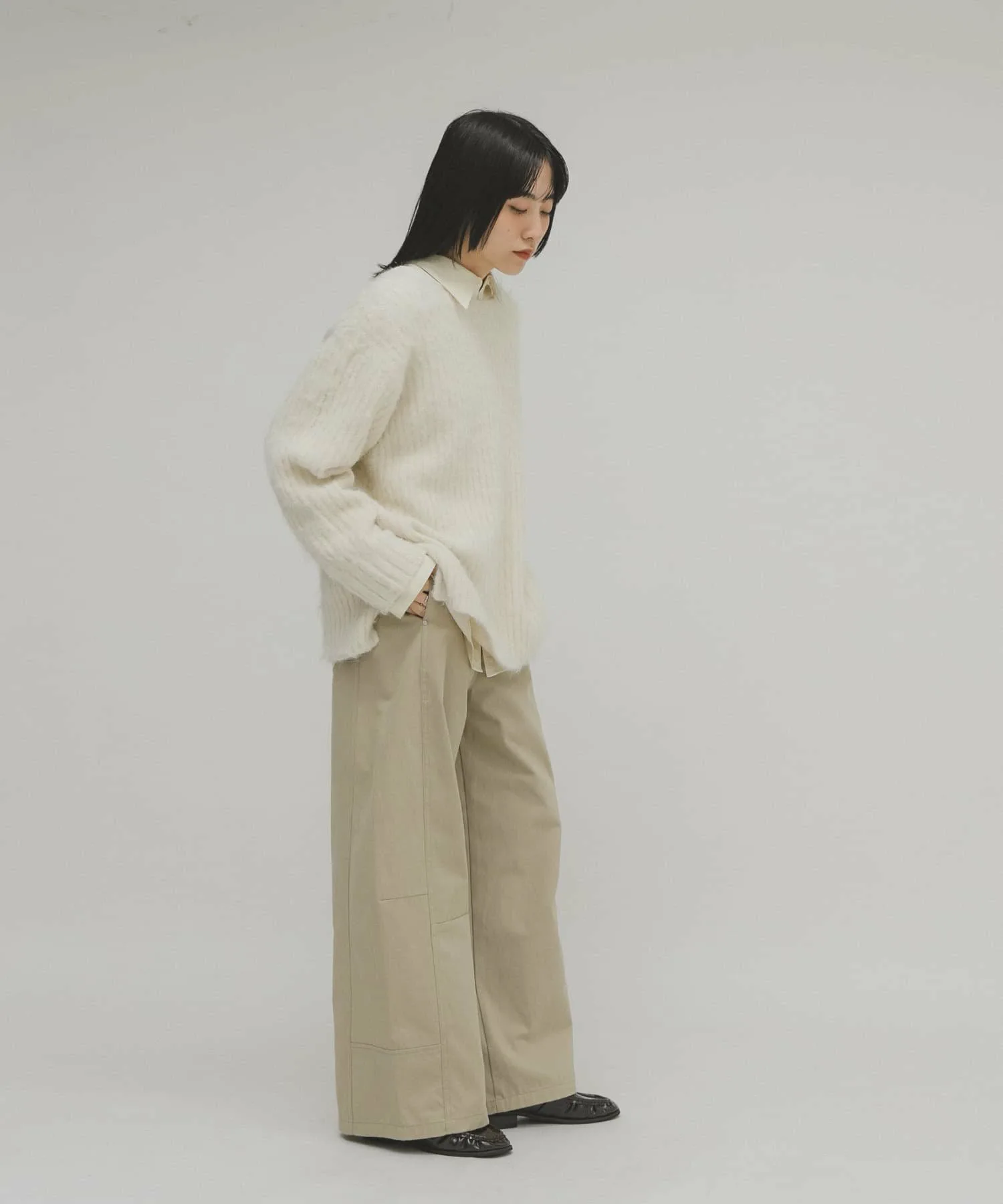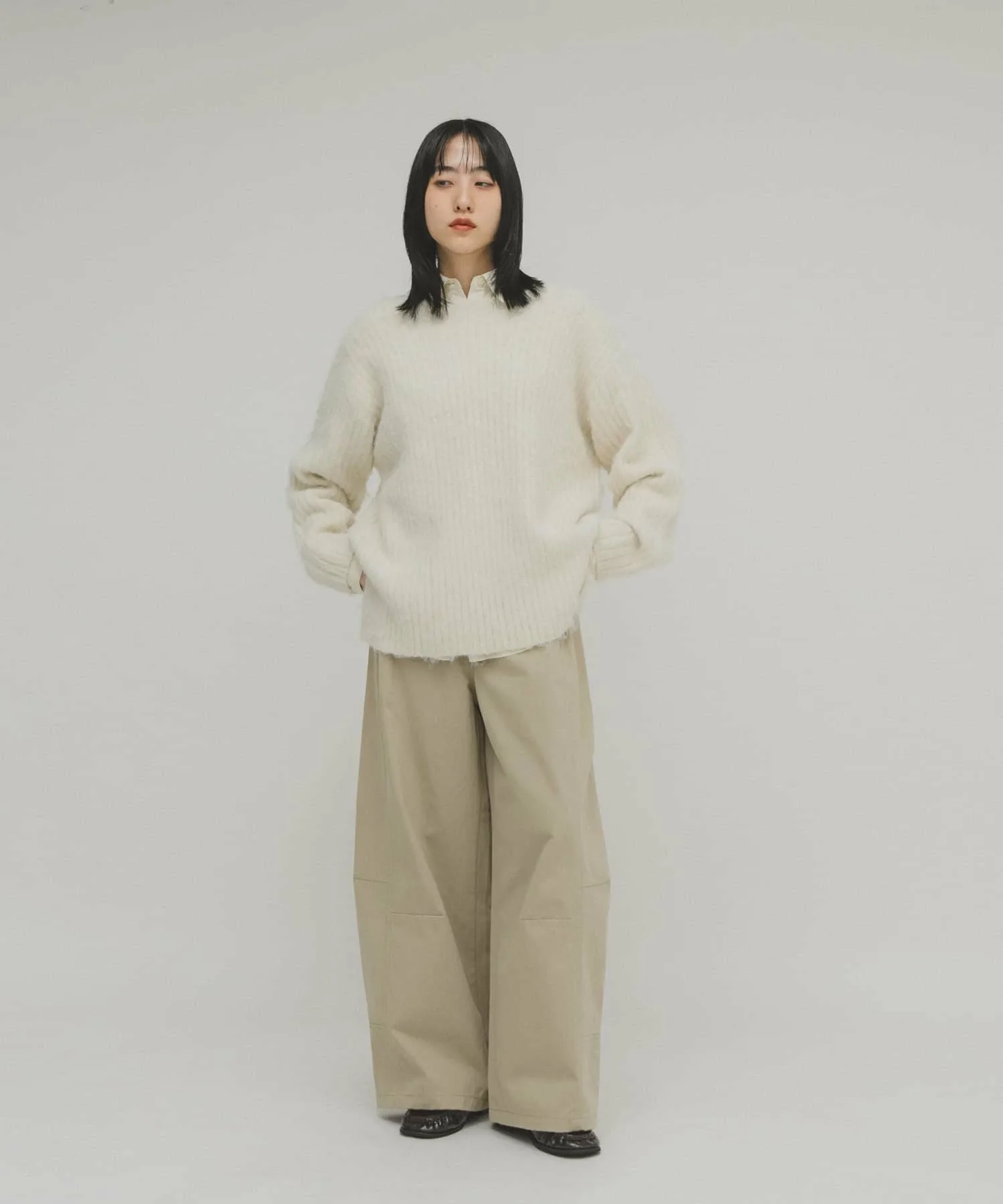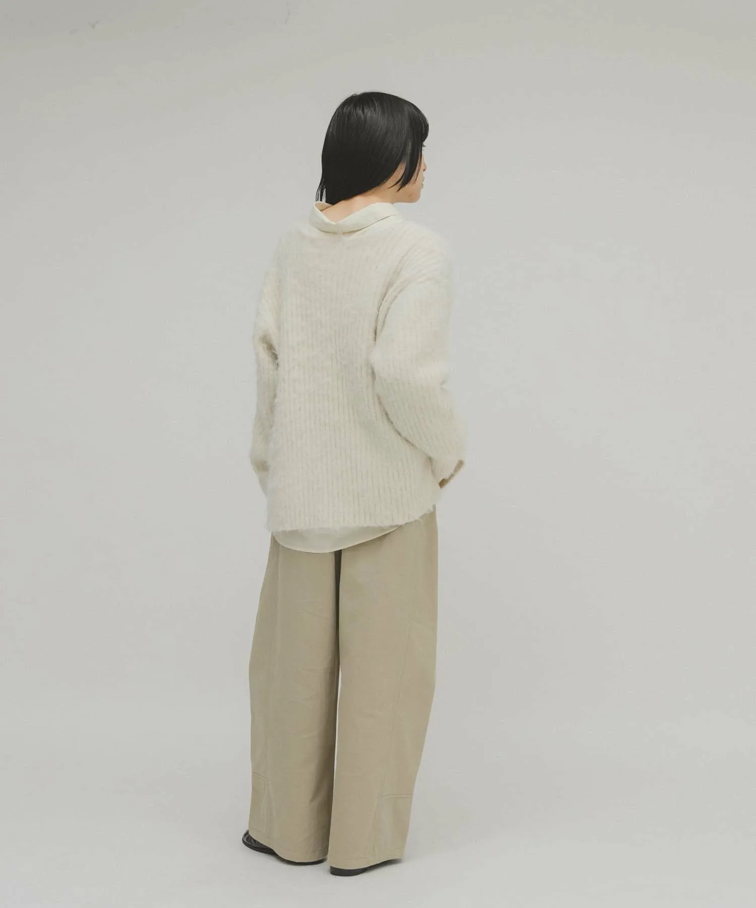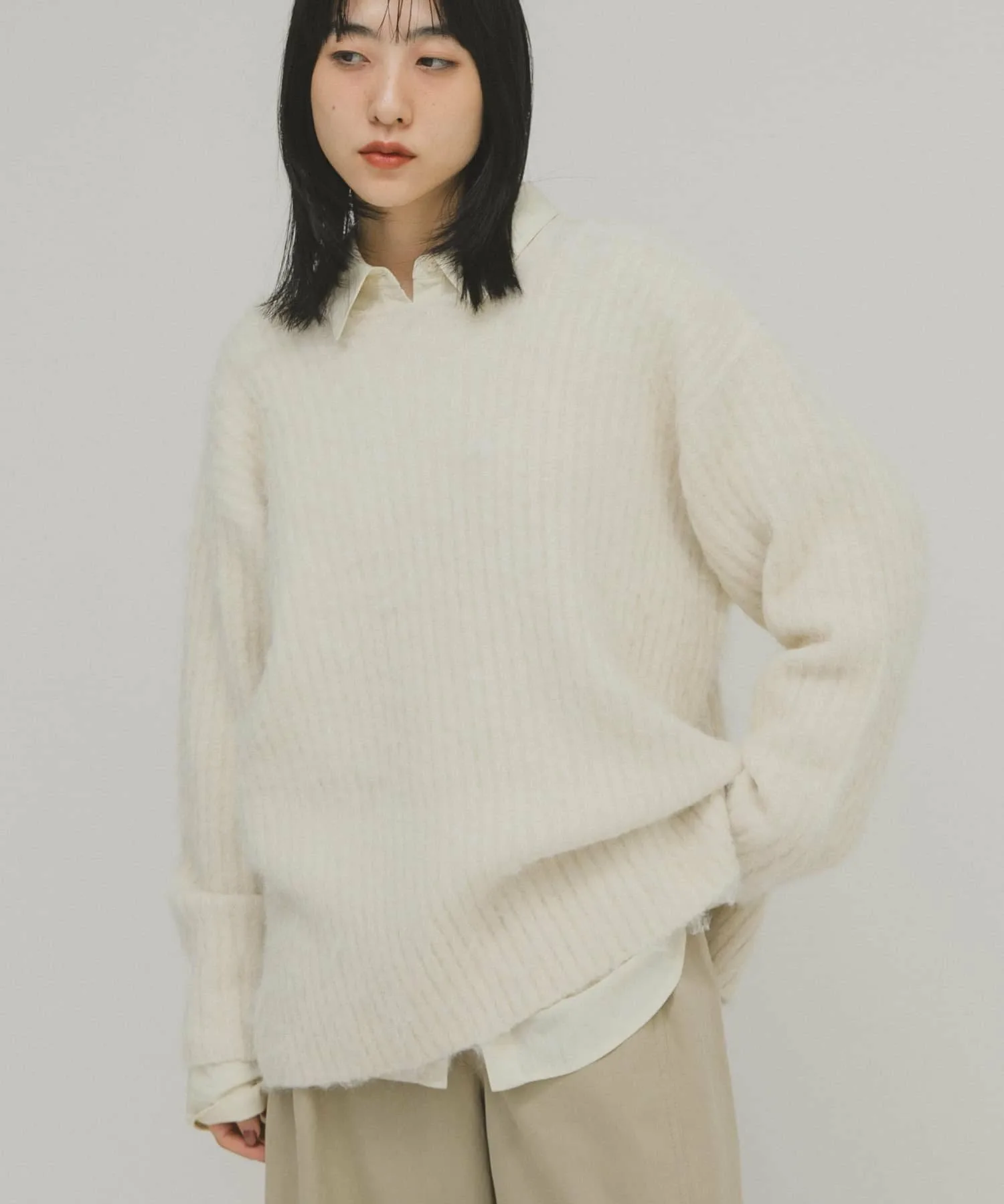 Женственный трикотаж с пушистой поверхностью и мягким на ощупь. Хотя ворсистые трикотажные изделия обычно выглядят объемными, ребристая вязка подчеркивает вертикальные линии, а вырез-лодочка создает женственный, расслабленный образ. Длина, закрывающая талию, и свободный силуэт также являются ключевыми особенностями.