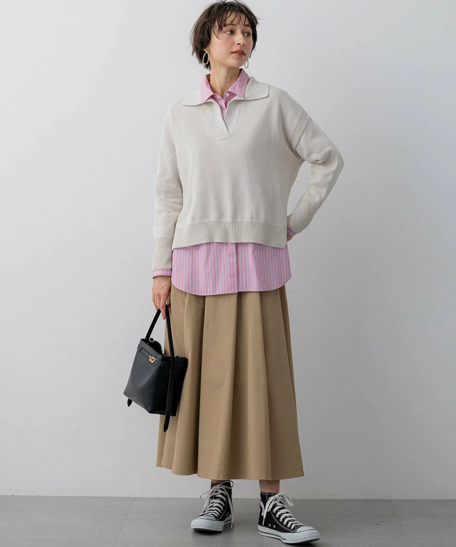 Этот пуловер с воротником-стойкой — эффектная вещь. Связанный из трикотажа, он отличается простым дизайном, но тщательно подобранный размер делает его идеальным как для самостоятельного ношения, так и для сочетания с рубашкой или футболкой для создания сбалансированного образа. Боковые разрезы позволяют легко создать утонченный и элегантный образ, слегка заправив передний край и оставив воротник расстегнутым. Эта вещь излучает утонченный и непринужденный стиль, идеально подходящий для женщин зрелого возраста. Доступен в трех цветах: белый (#001), классический цвет, который идеально сочетается с любым стилем; бежевый (#033), изысканный, тонкий цвет, создающий нежное и мягкое впечатление; и темно-синий (#075), шикарный цвет, идеально подходящий для взрослых, излучающий интеллектуальную и утонченную атмосферу.