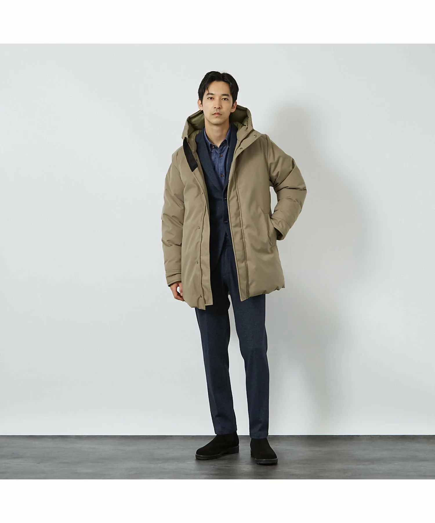Плечи и рукава имеют трехмерную форму для обеспечения комфорта при ношении поверх костюма или пиджака, а длина достаточно большая.