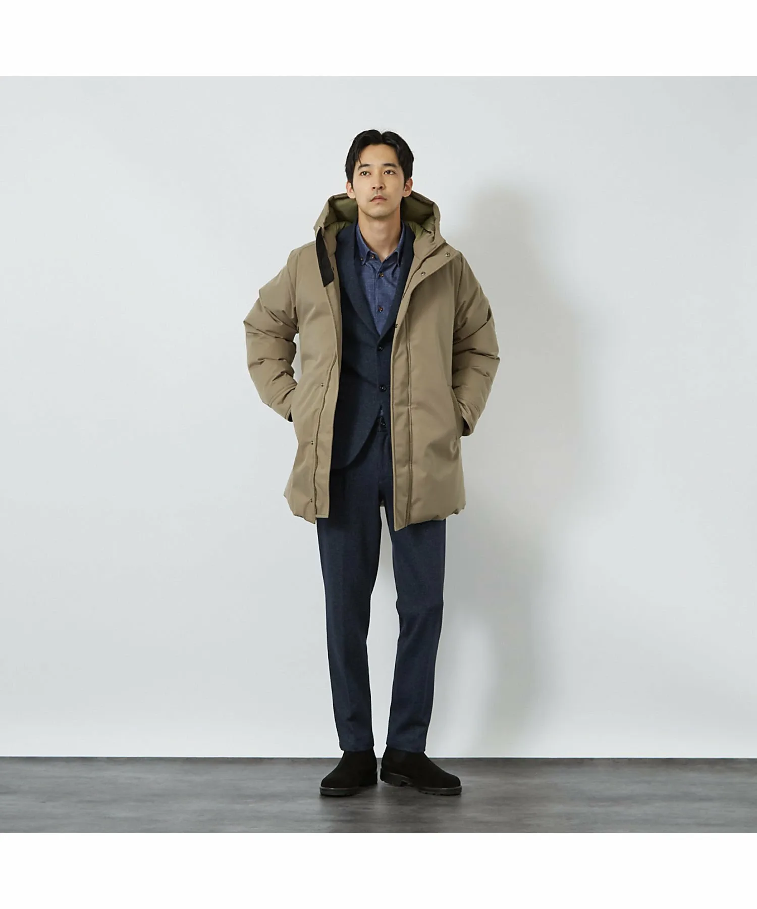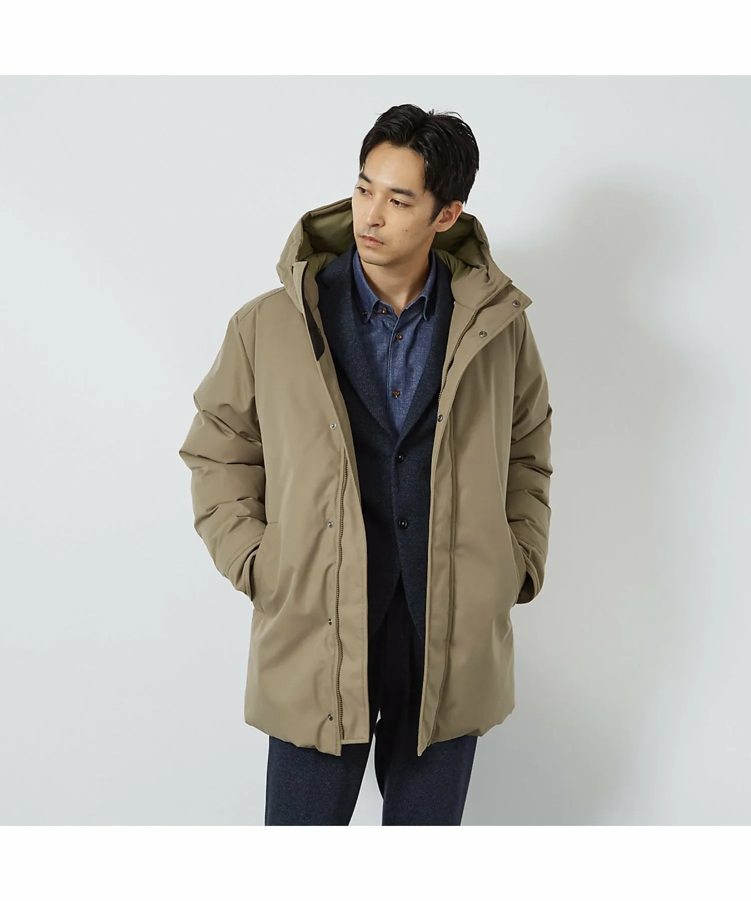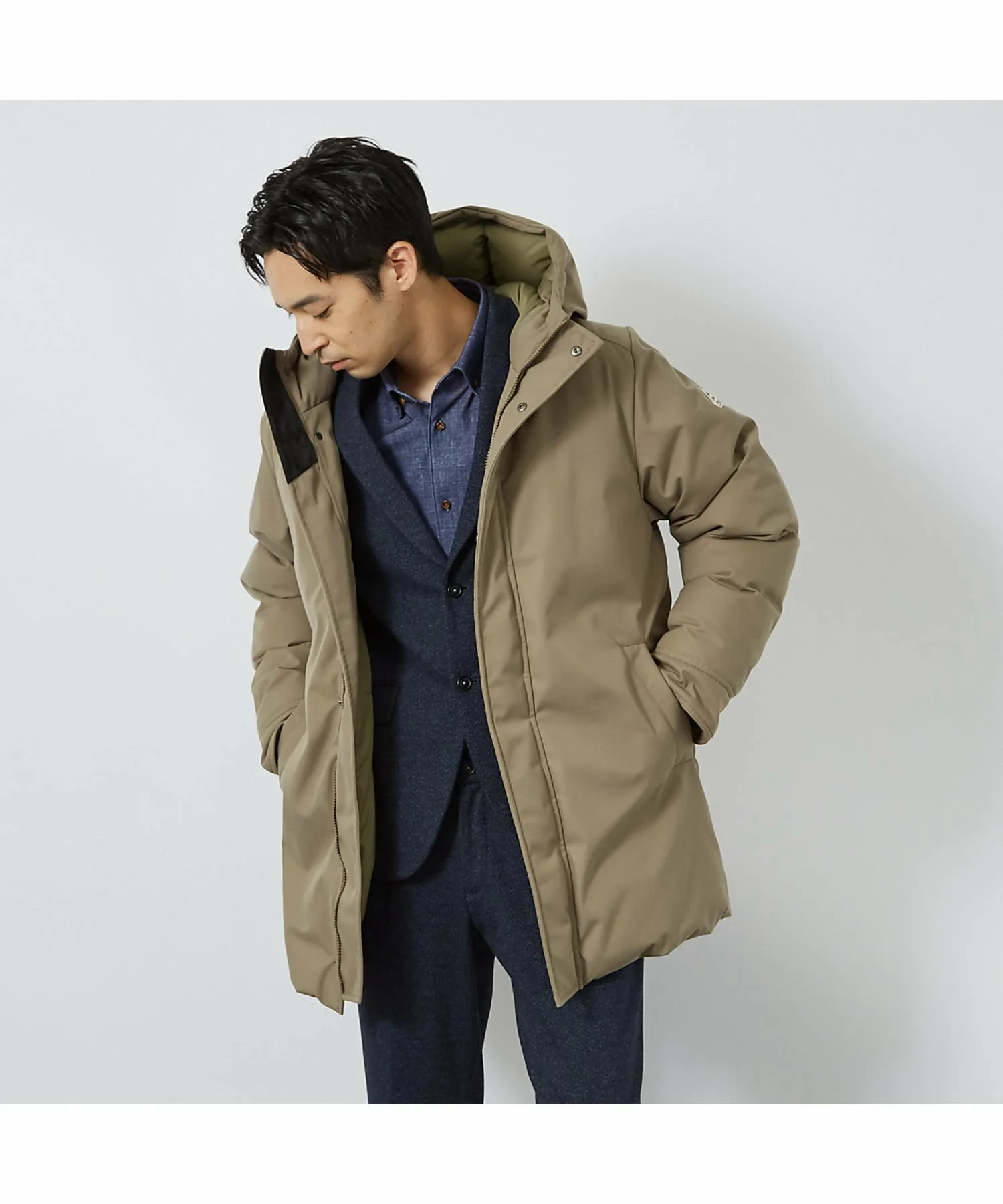 Плечи и рукава имеют трехмерную форму для обеспечения комфорта при ношении поверх костюма или пиджака, а длина достаточно большая.