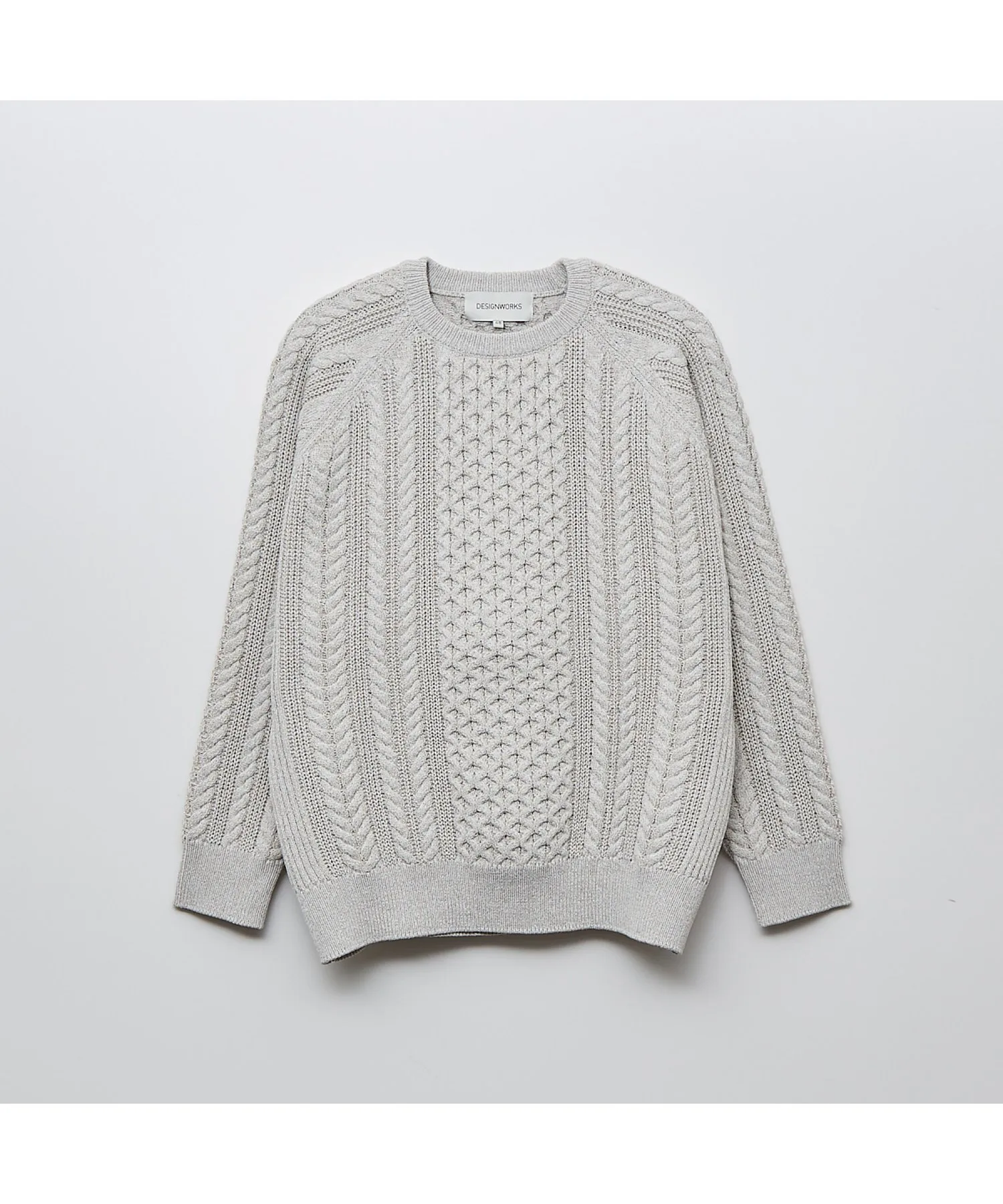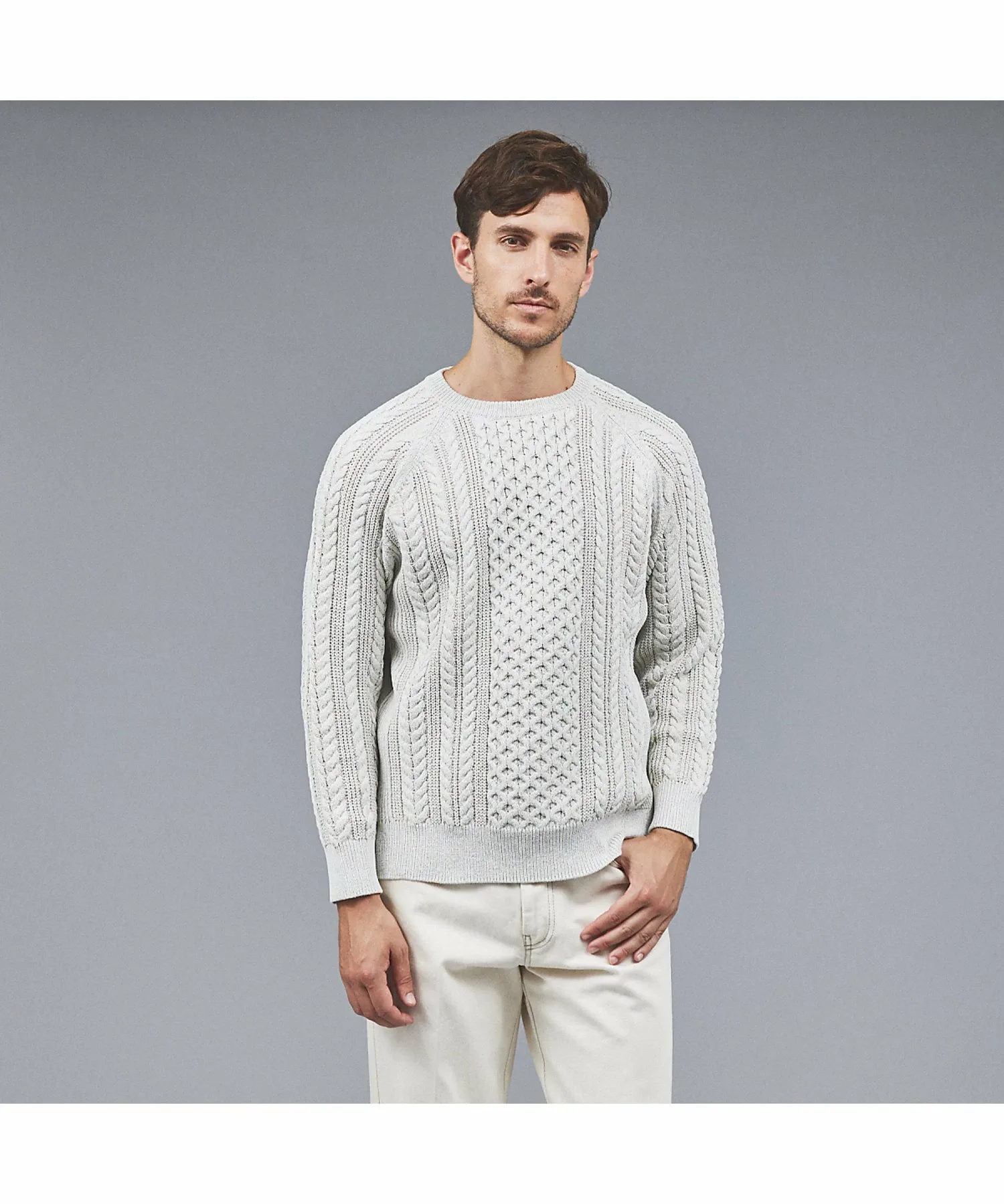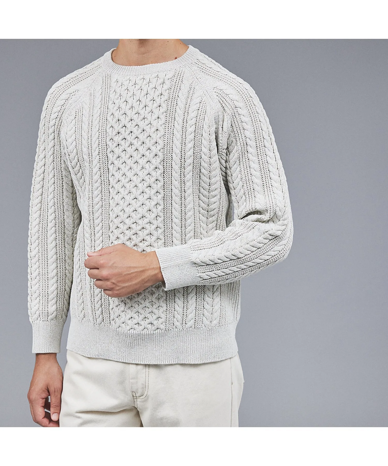 Оригинальный узор «Аран» имеет ребристую отделку по бокам и под рукавами для слегка резкого силуэта, а также рукава реглан для слегка свободной посадки.
