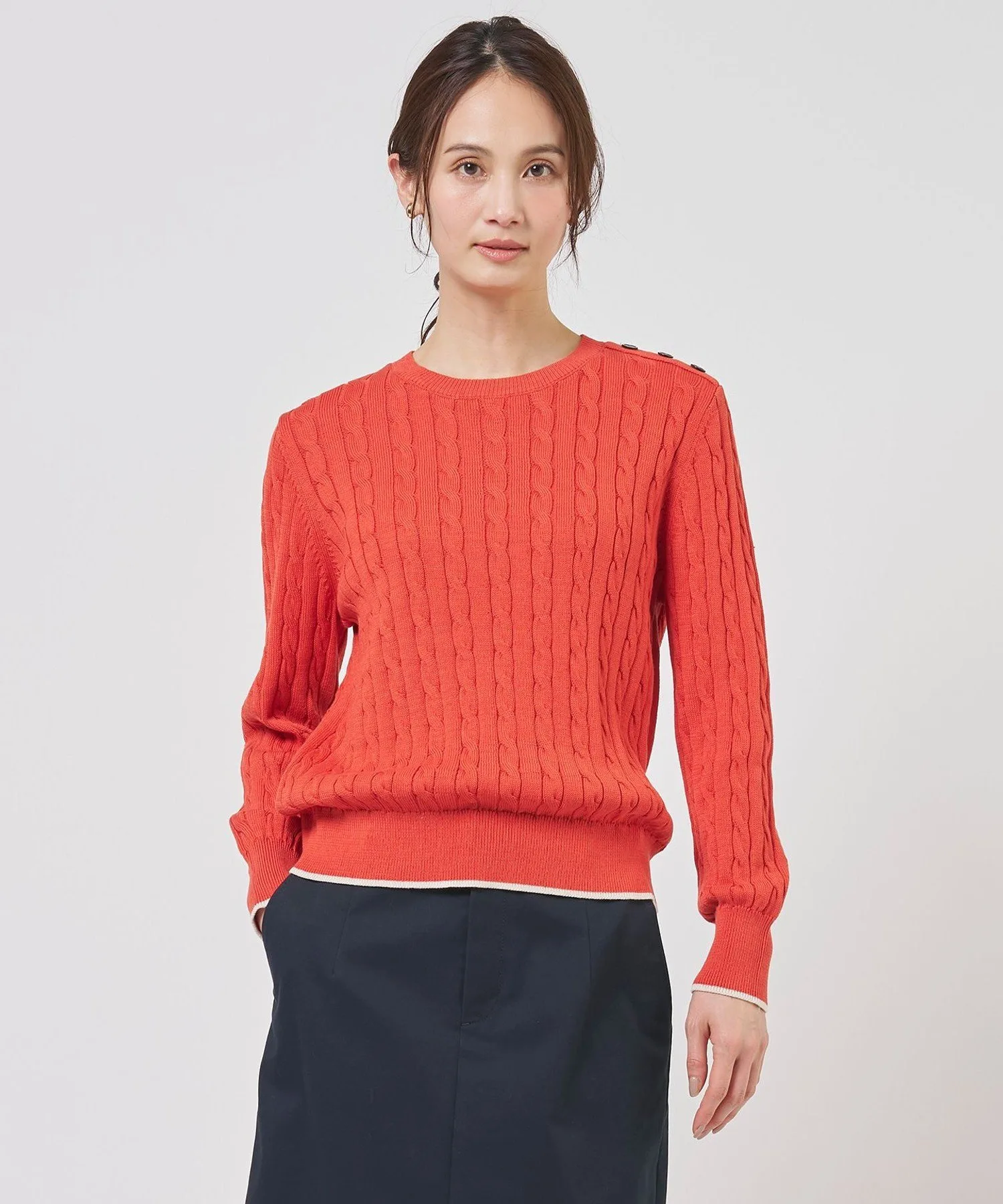 Этот трикотаж отличается классической вязкой «косичка». В этом году мы обновили ее, используя более тонкую пряжу, чтобы уменьшить объем и создать более элегантный и изысканный вид. Пуговицы на плечах добавляют нотку стиля, а сдержанная цветовая палитра – нотку элегантности. Это выдающаяся вещь, идеально подходящая для перехода между сезонами, для создания изысканного и утонченного повседневного образа. Доступен в пяти цветах: нежно-розовый (#012), яркий кроваво-оранжевый (#020), элегантный и мягкий светло-бежевый (#033), освежающий весенний дымчато-мятный (#062) и чистый, интеллектуальный синий (#070).