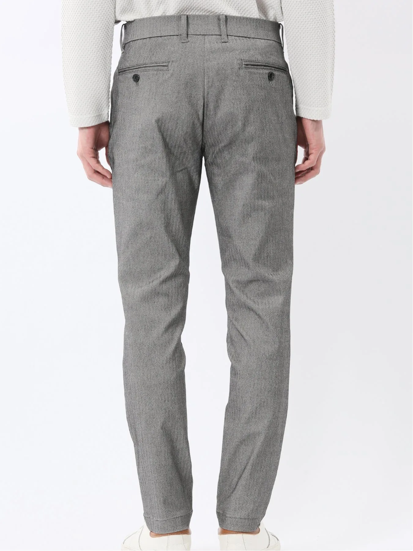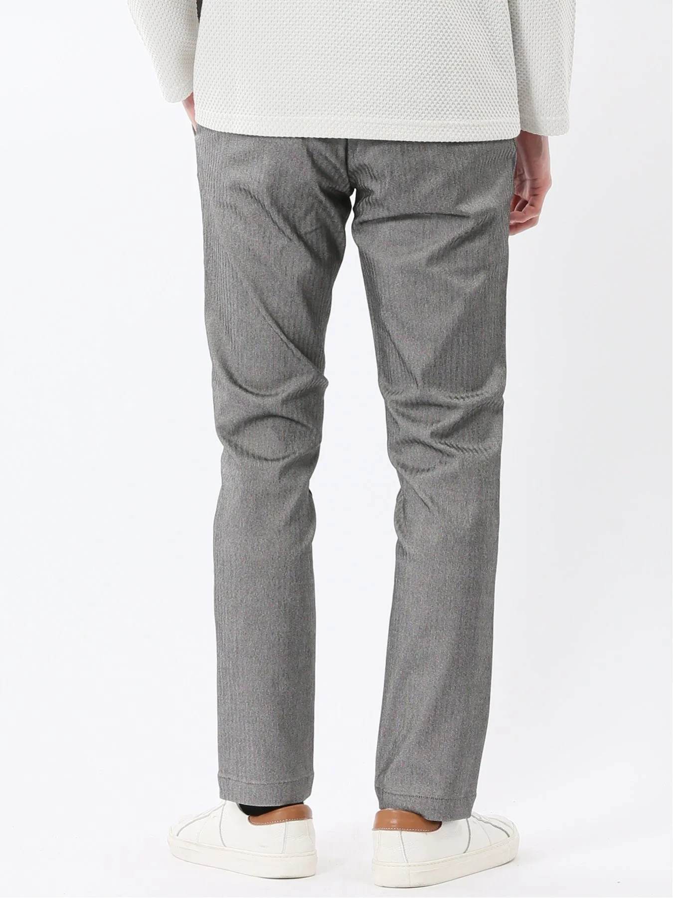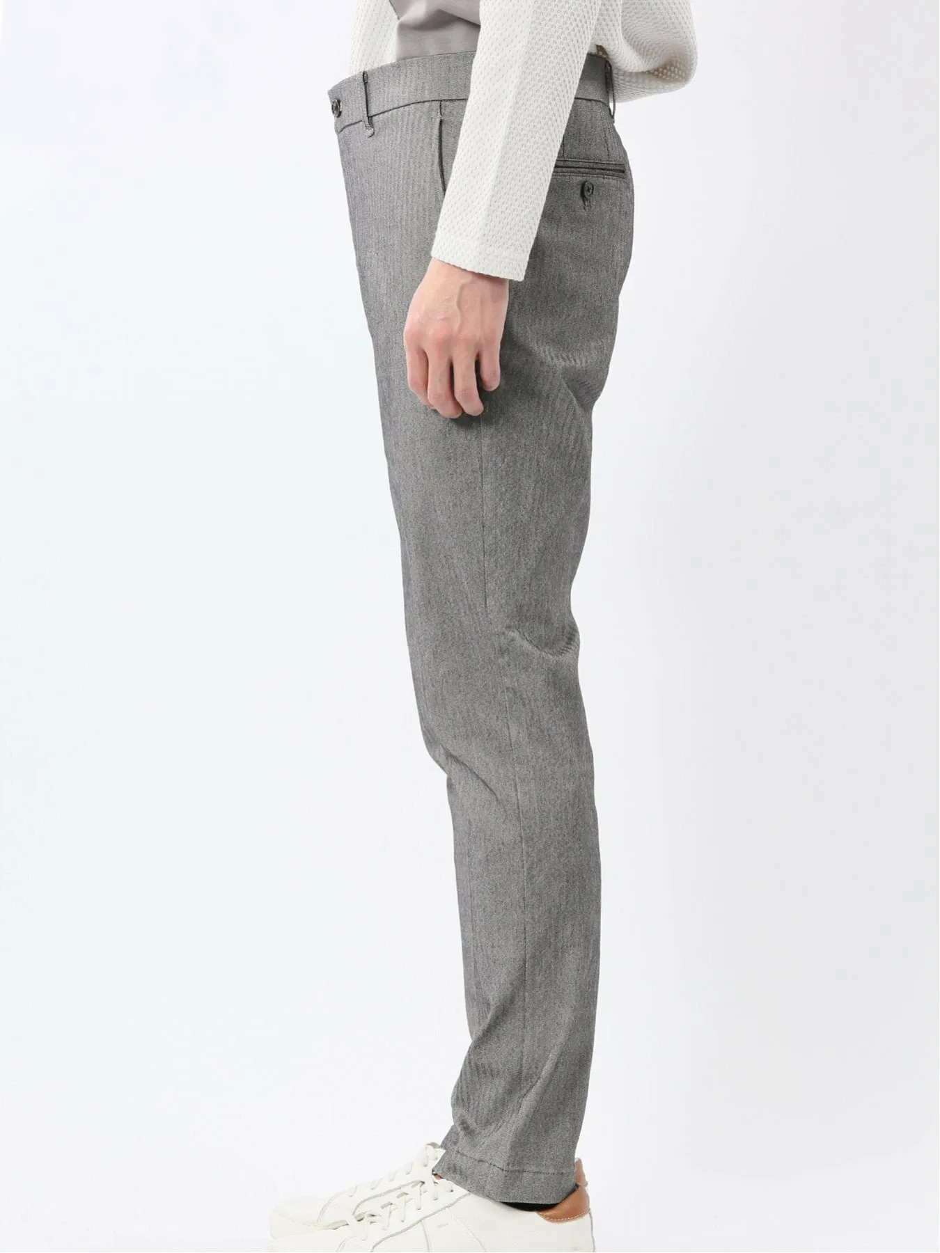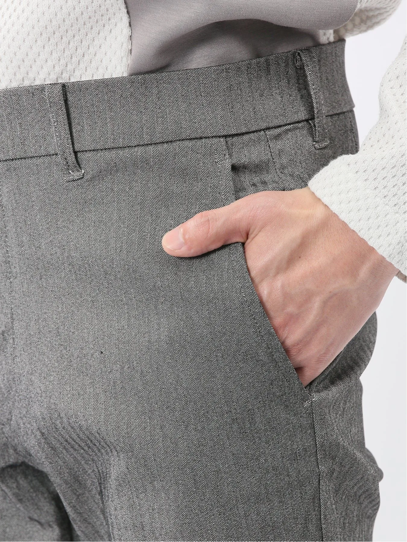 Материал "Cross Stretch" свободно растягивается, обеспечивая свободу движений, что делает его удобным и стильным. Он изготовлен из смеси вискозы, нейлона и полиуретана. Узор «елочка», в котором чередуются левостороннее и правостороннее саржевое переплетение, создает текстурированную поверхность.