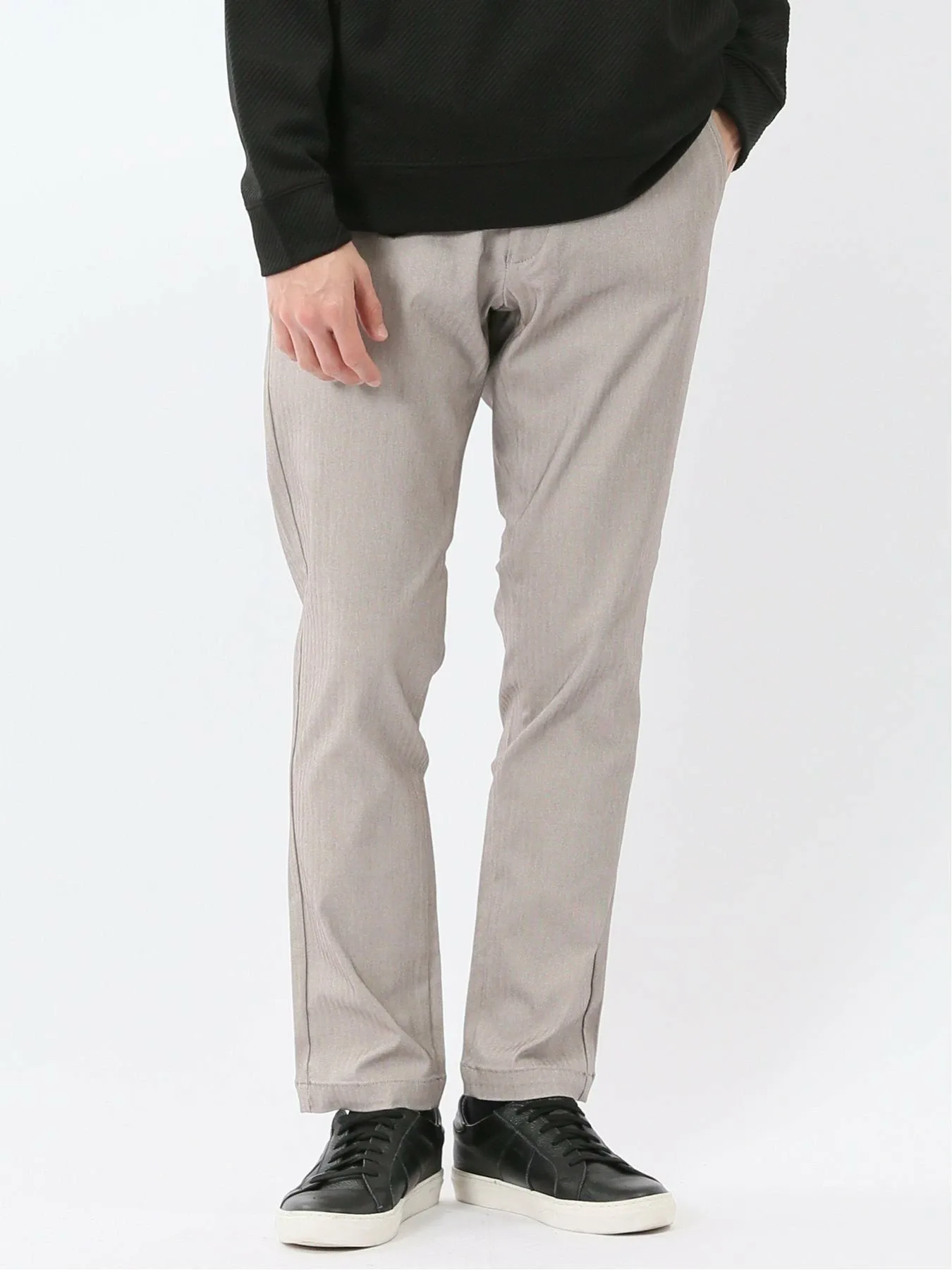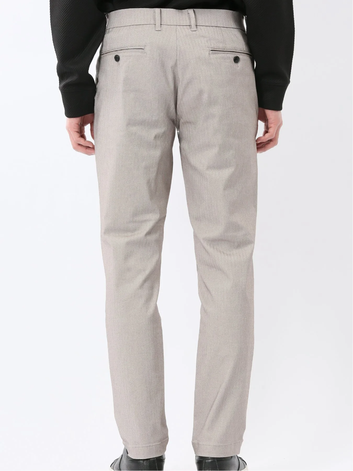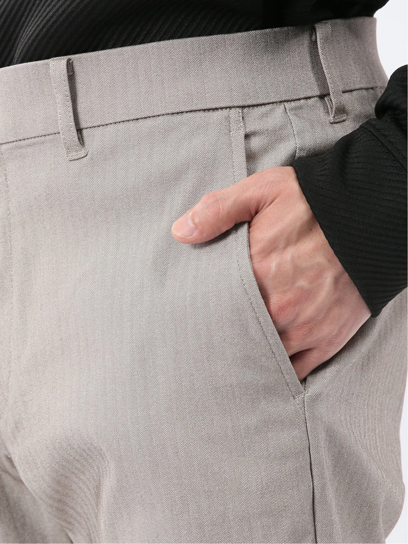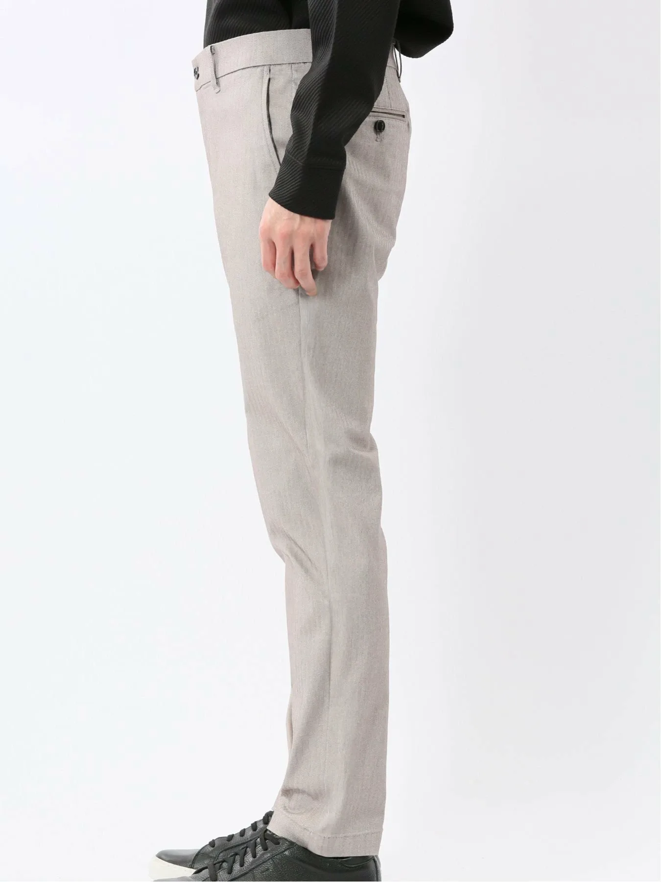 Материал "Cross Stretch" свободно растягивается, обеспечивая свободу движений, что делает его удобным и стильным. Он изготовлен из смеси вискозы, нейлона и полиуретана. Узор «елочка», в котором чередуются левостороннее и правостороннее саржевое переплетение, создает текстурированную поверхность.
