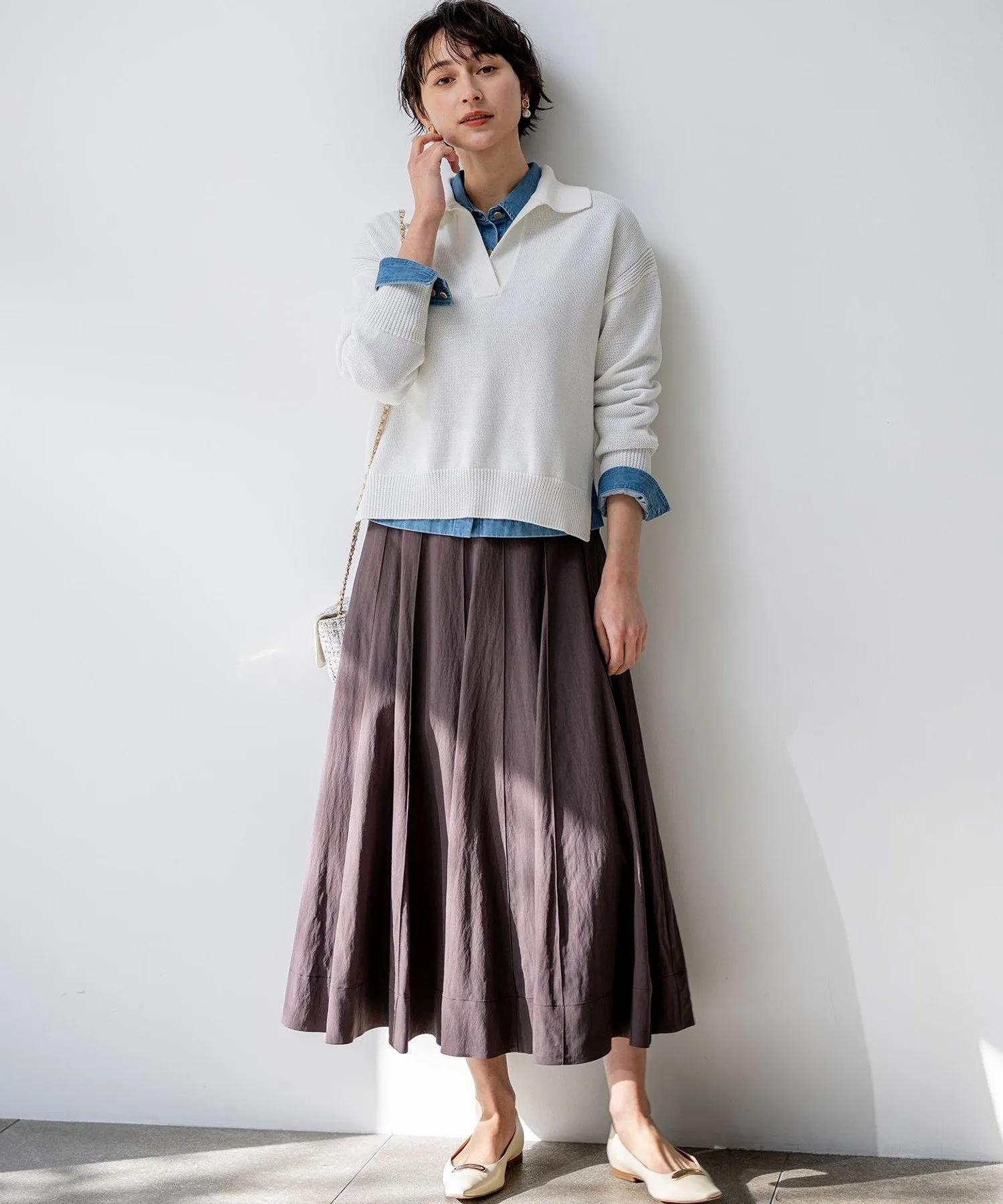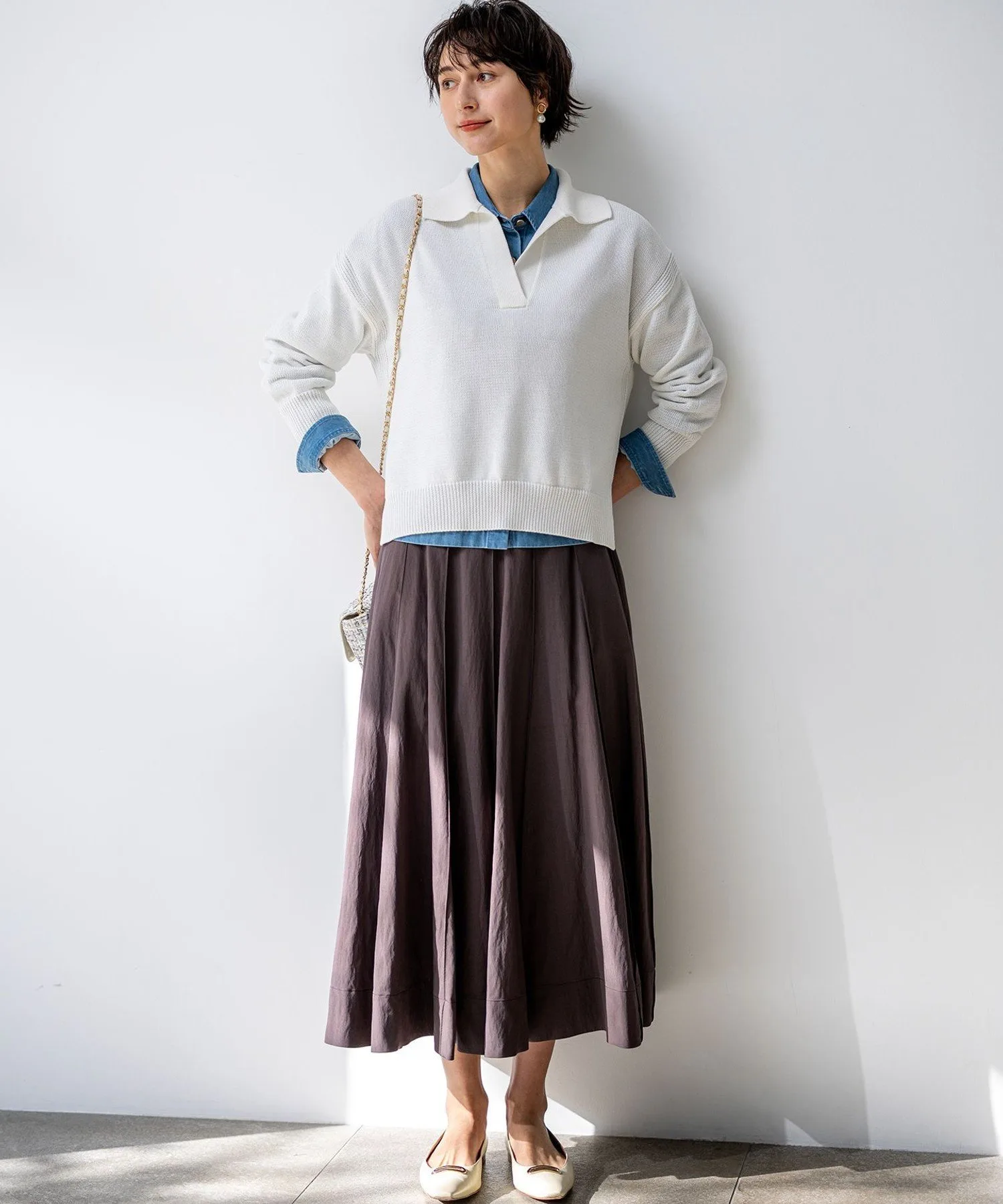 Этот пуловер с воротником-стойкой — эффектная вещь. Связанный из трикотажа, он отличается простым дизайном, но тщательно подобранный размер делает его идеальным как для самостоятельного ношения, так и для сочетания с рубашкой или футболкой для создания сбалансированного образа. Боковые разрезы позволяют легко создать утонченный и элегантный образ, слегка заправив передний край и оставив воротник расстегнутым. Эта вещь излучает утонченный и непринужденный стиль, идеально подходящий для женщин зрелого возраста. Доступен в трех цветах: белый (#001), классический цвет, который идеально сочетается с любым стилем; бежевый (#033), изысканный, тонкий цвет, создающий нежное и мягкое впечатление; и темно-синий (#075), шикарный цвет, идеально подходящий для взрослых, излучающий интеллектуальную и утонченную атмосферу.