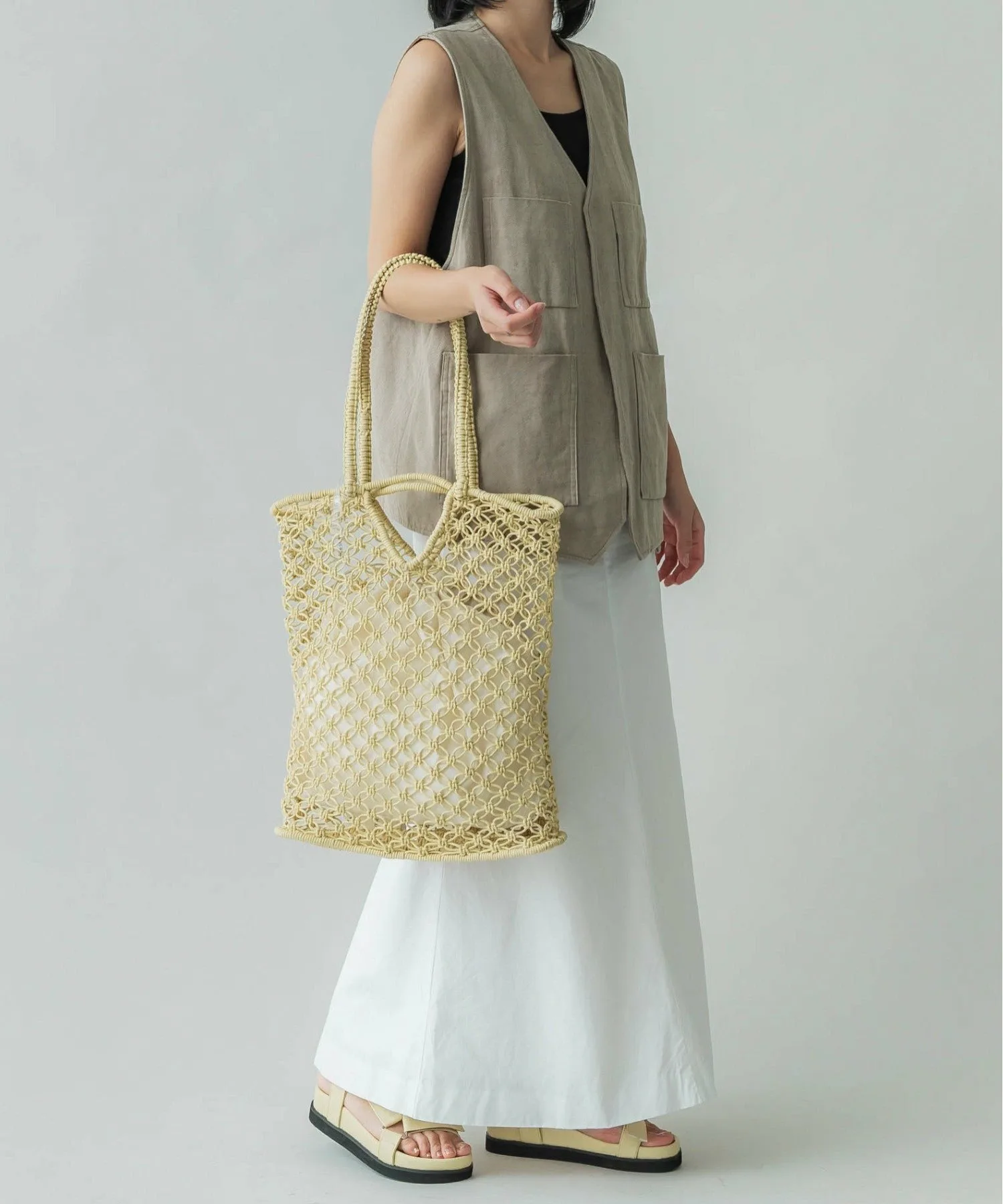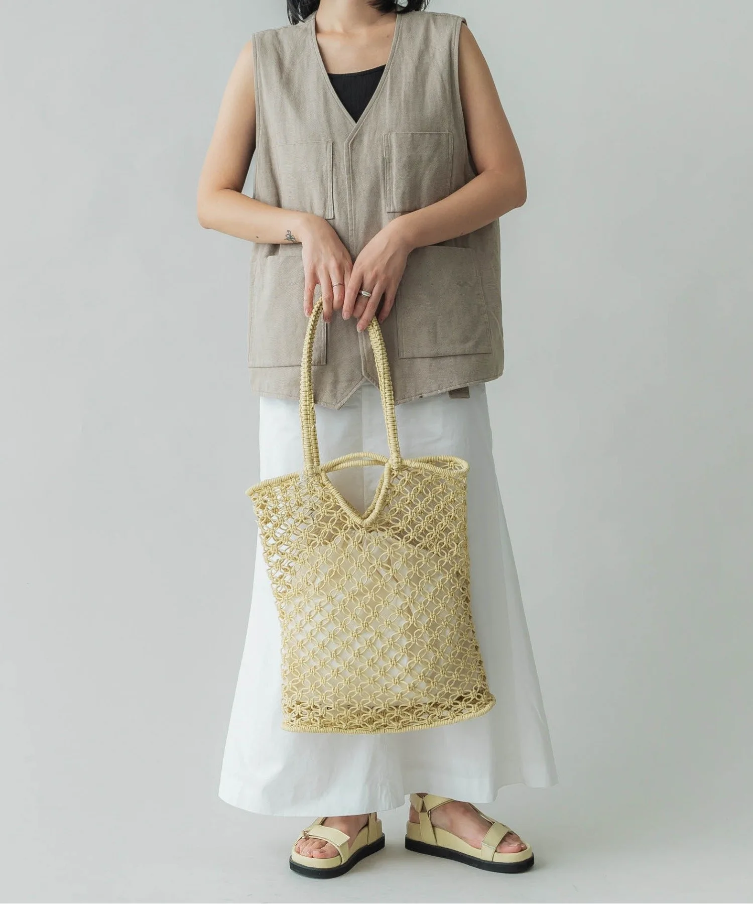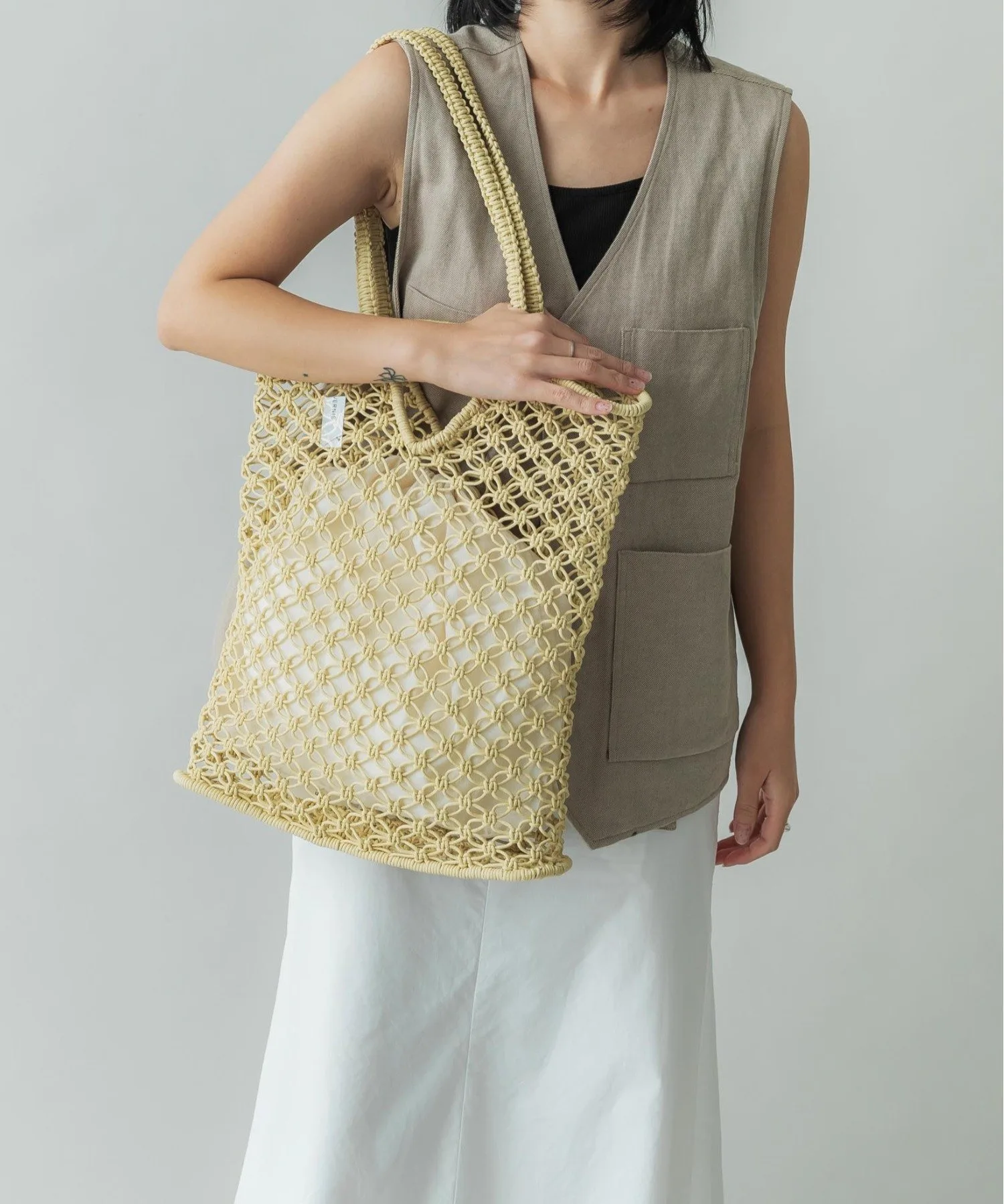 Инес — французское женское имя. Эта серия, отличающаяся вязаным крючком узором, представлена в вариантах из вощеного шнура и рафии. Это летняя вещь, идеально подходящая для повседневного использования в городе.