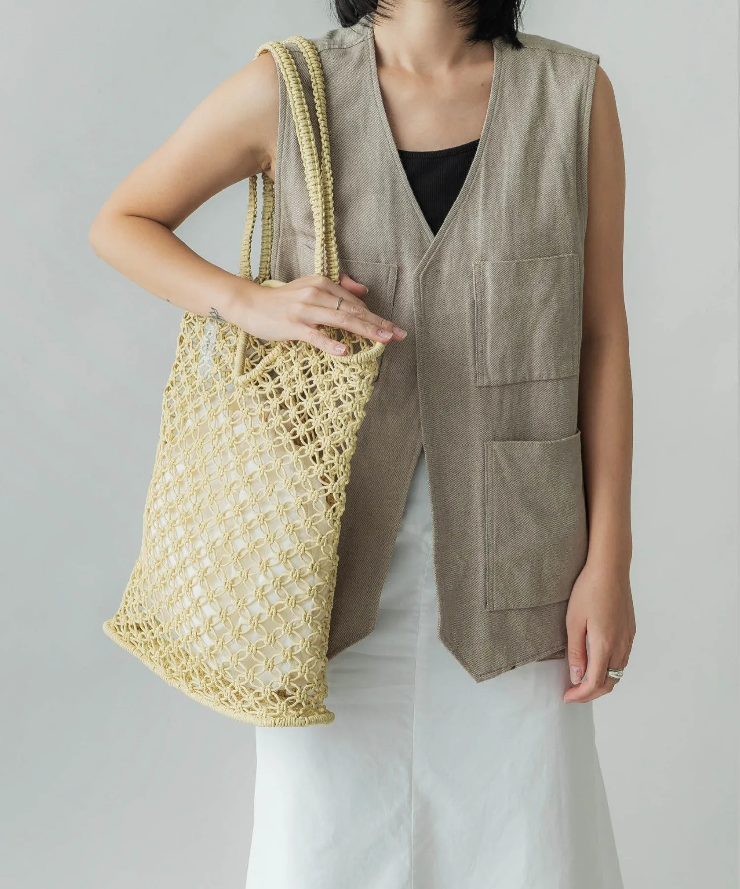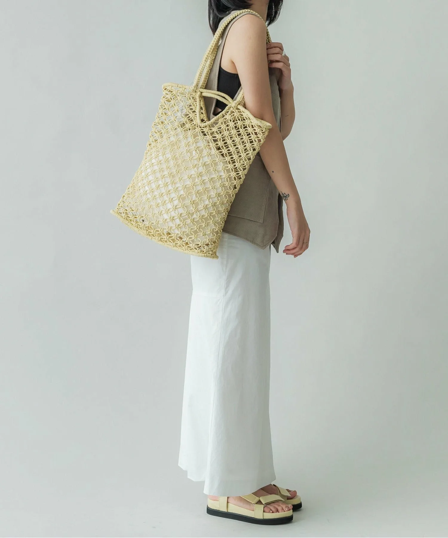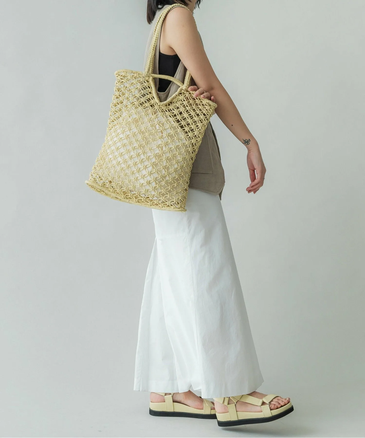 Инес — французское женское имя. Эта серия, отличающаяся вязаным крючком узором, представлена в вариантах из вощеного шнура и рафии. Это летняя вещь, идеально подходящая для повседневного использования в городе.