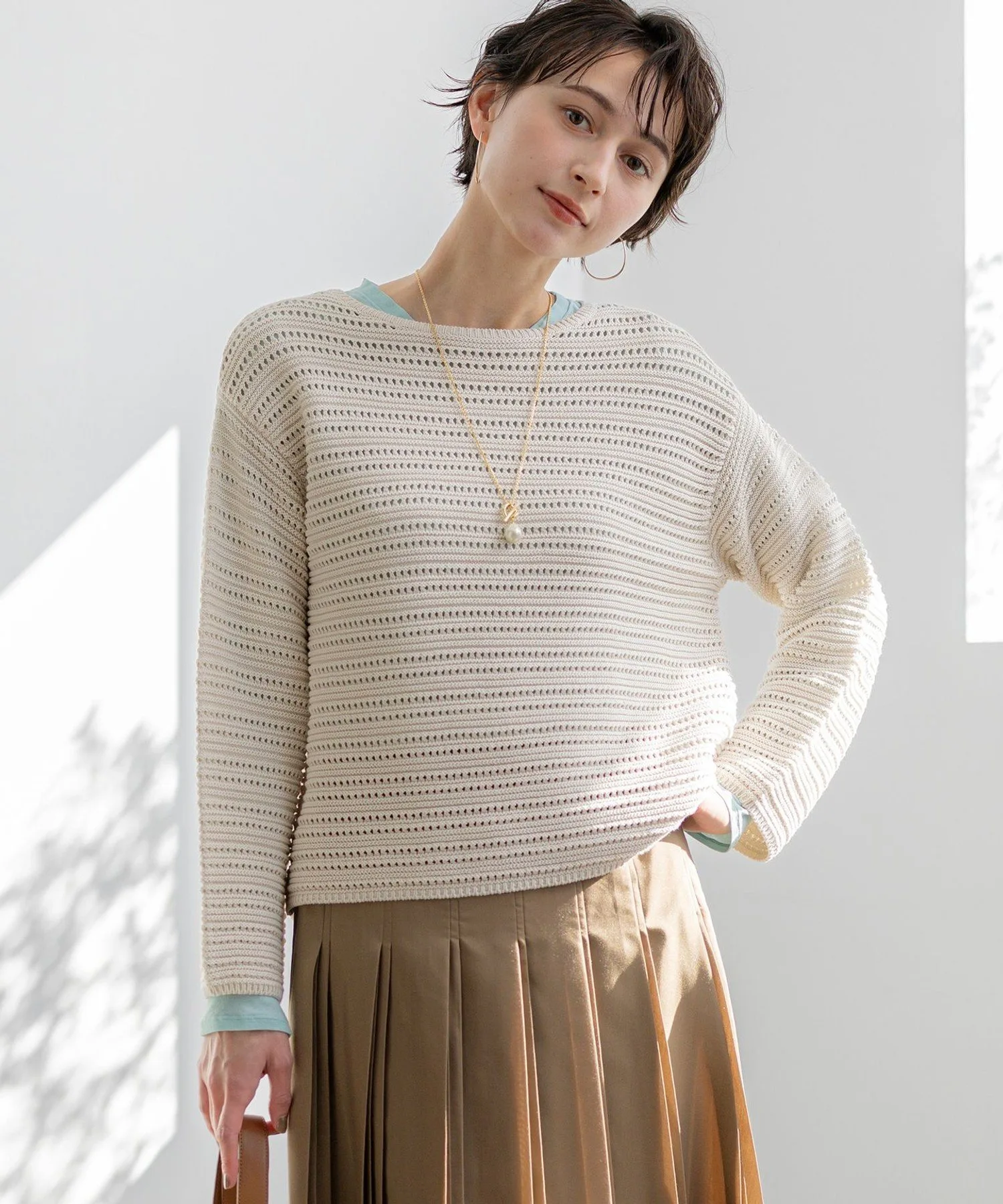 Этот трикотажный свитер с вырезом-лодочкой имеет легкий трикотажный узор, подчеркнутый ажурными элементами и естественным блеском. Изысканный крой обеспечивает достаточно свободы движений для создания обтекаемого силуэта, формируя утонченный, элегантный повседневный стиль. Носите его отдельно или сочетайте с рубашкой или топом для создания изысканного, утонченного образа. Доступен в четырех цветах: чистый белый (#001), элегантный и комфортный бежевый (#033), изысканный темно-синий (#075) и светло-желтый (#042) для более яркого образа.