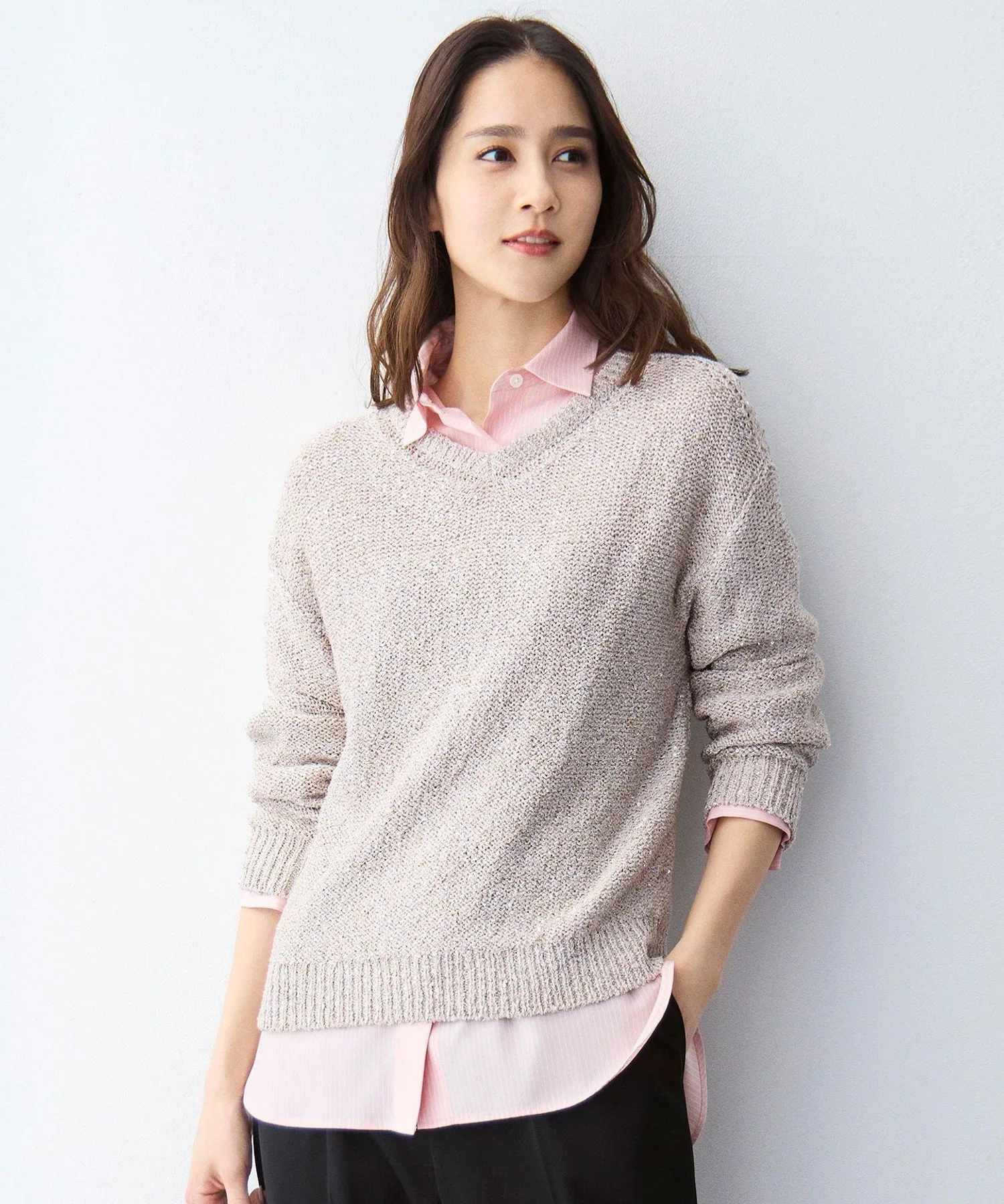 Изысканный вязаный дизайн, который великолепно смотрится даже в простом исполнении. Дизайн: Этот принтованный трикотаж средней плотности украшен блестками и пайетками в нужном количестве, создавая потрясающее впечатление даже в чистом виде. Он имеет свободный крой в области пройм и четкий, компактный силуэт в области талии. Свободный крой и сбалансированный размер позволяют носить его под пальто, не создавая лишнего объема. Хорошо сочетается с различными вариантами низа. Материал: Эта принтованная пряжа средней плотности сочетает в себе узелковые блестки и эффектные, слегка увеличенные пайетки. Основной материал — полиэстер с элегантным блеском, создающий легкую драпировку для изысканного образа.