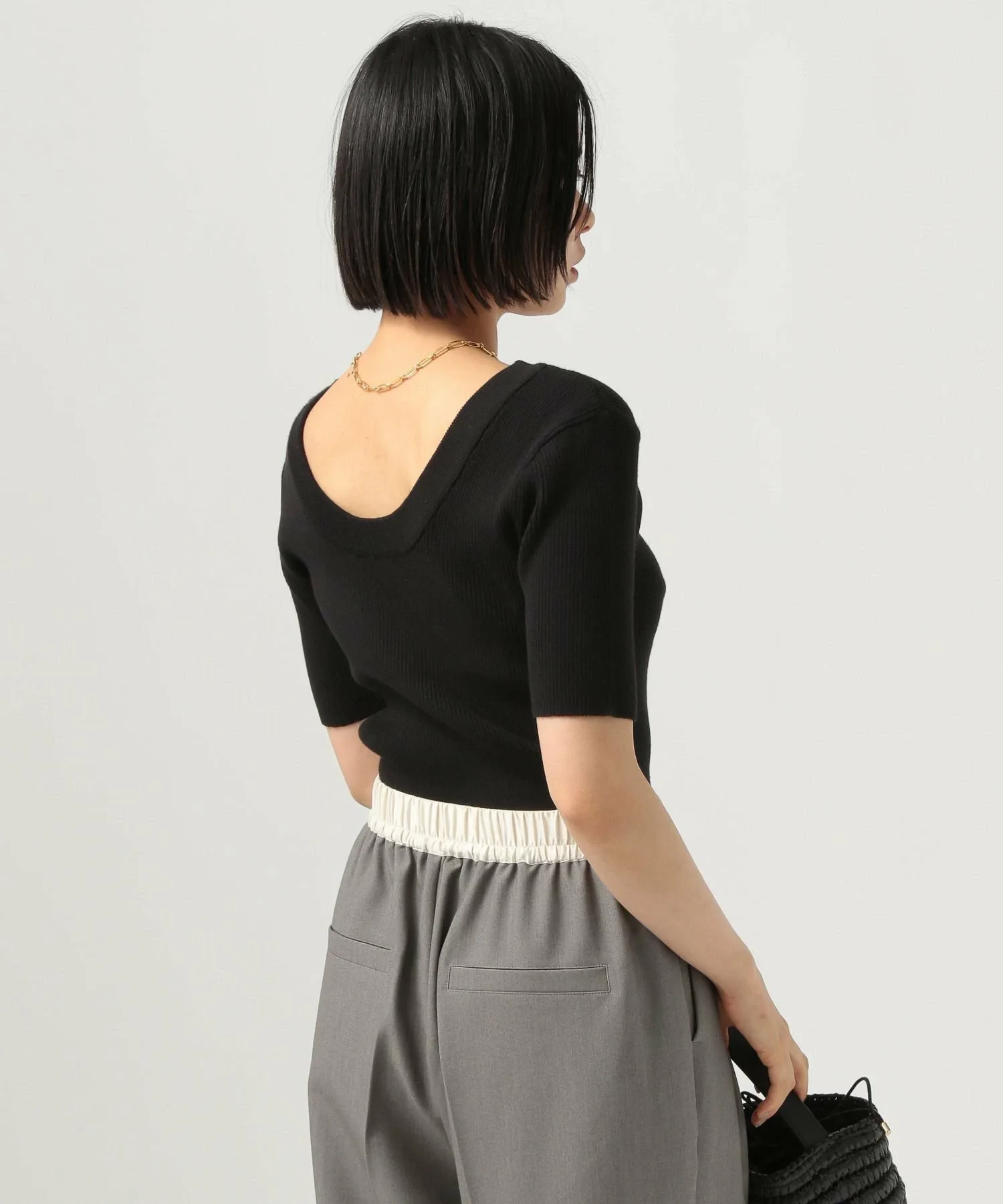 Глубокий вырез на спине придает этой вещи расслабленный, взрослый базовый вязаный вид.