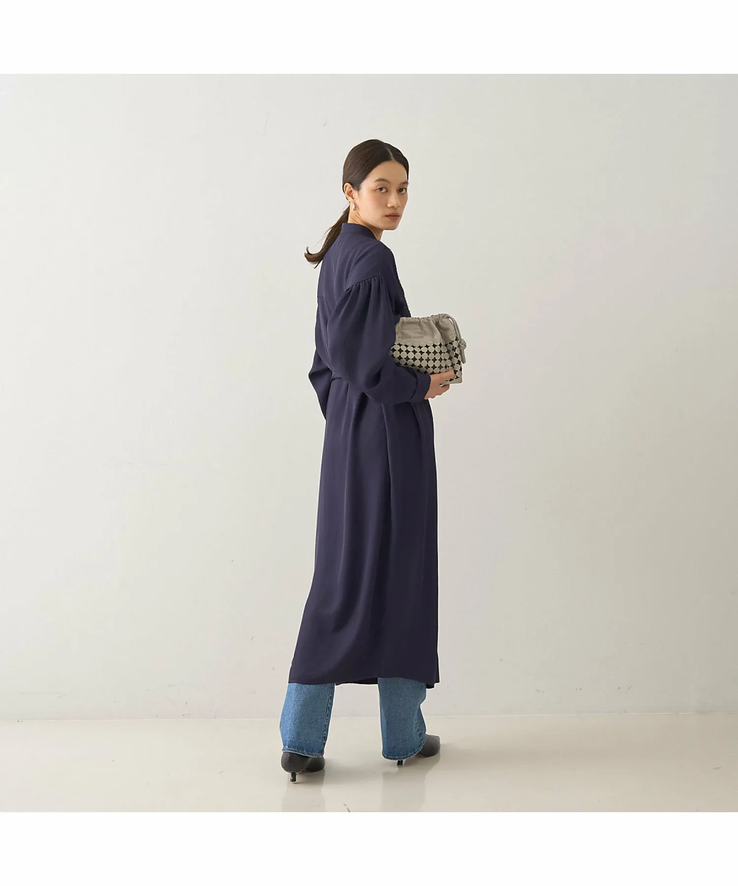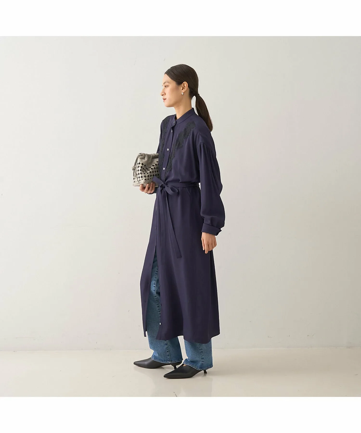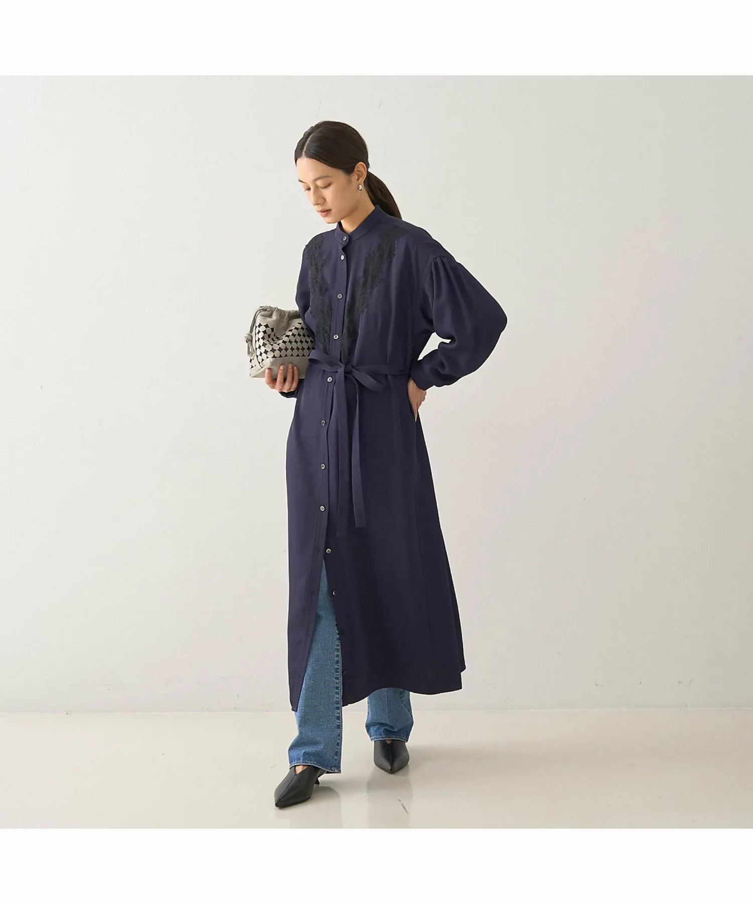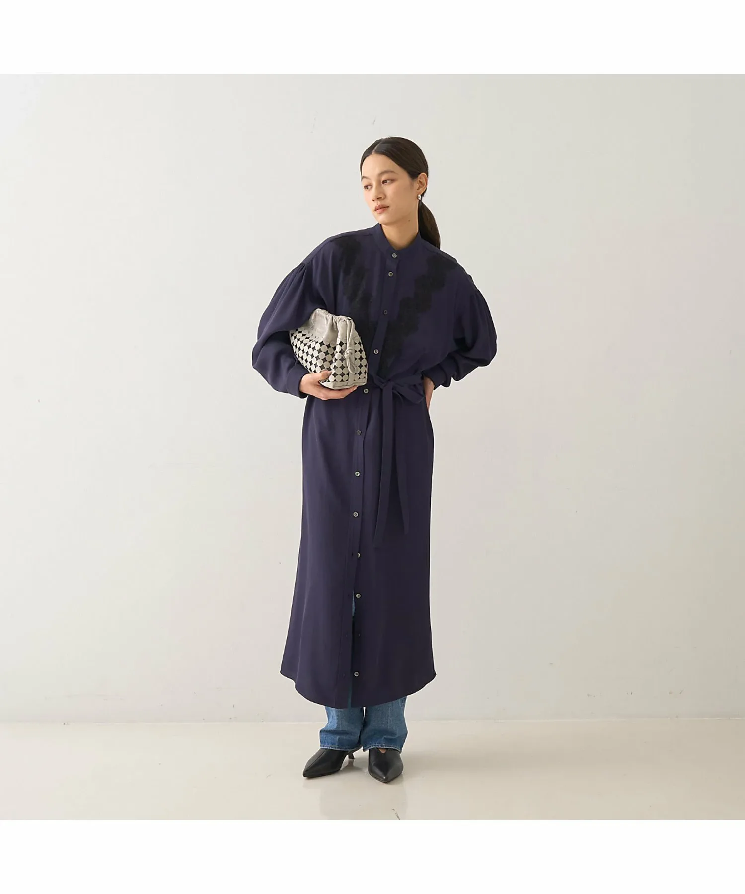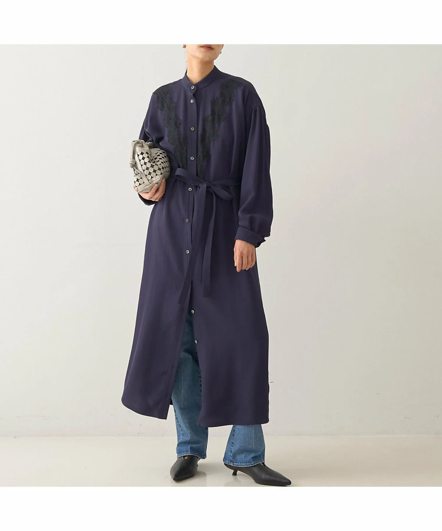 что делает его подходящим как для ношения в качестве платья-стойки, так и в качестве жакета. Подчеркивание талии поясом из той же ткани создает более выразительный силуэт.