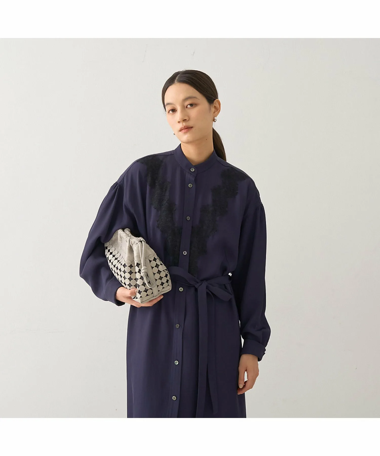 Платье-рубашка с изысканным и утонченным дизайном, украшенное нежным кружевом того же цвета на груди.