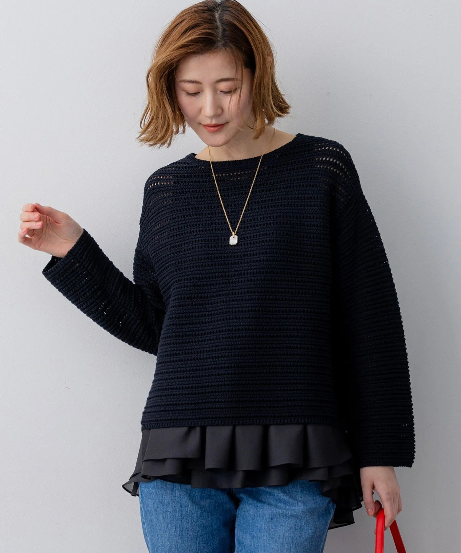 Этот трикотажный свитер с вырезом-лодочкой имеет легкий трикотажный узор, подчеркнутый ажурными элементами и естественным блеском. Изысканный крой обеспечивает достаточно свободы движений для создания обтекаемого силуэта, формируя утонченный, элегантный повседневный стиль. Носите его отдельно или сочетайте с рубашкой или топом для создания изысканного, утонченного образа. Доступен в четырех цветах: чистый белый (#001), элегантный и комфортный бежевый (#033), изысканный темно-синий (#075) и светло-желтый (#042) для более яркого образа.