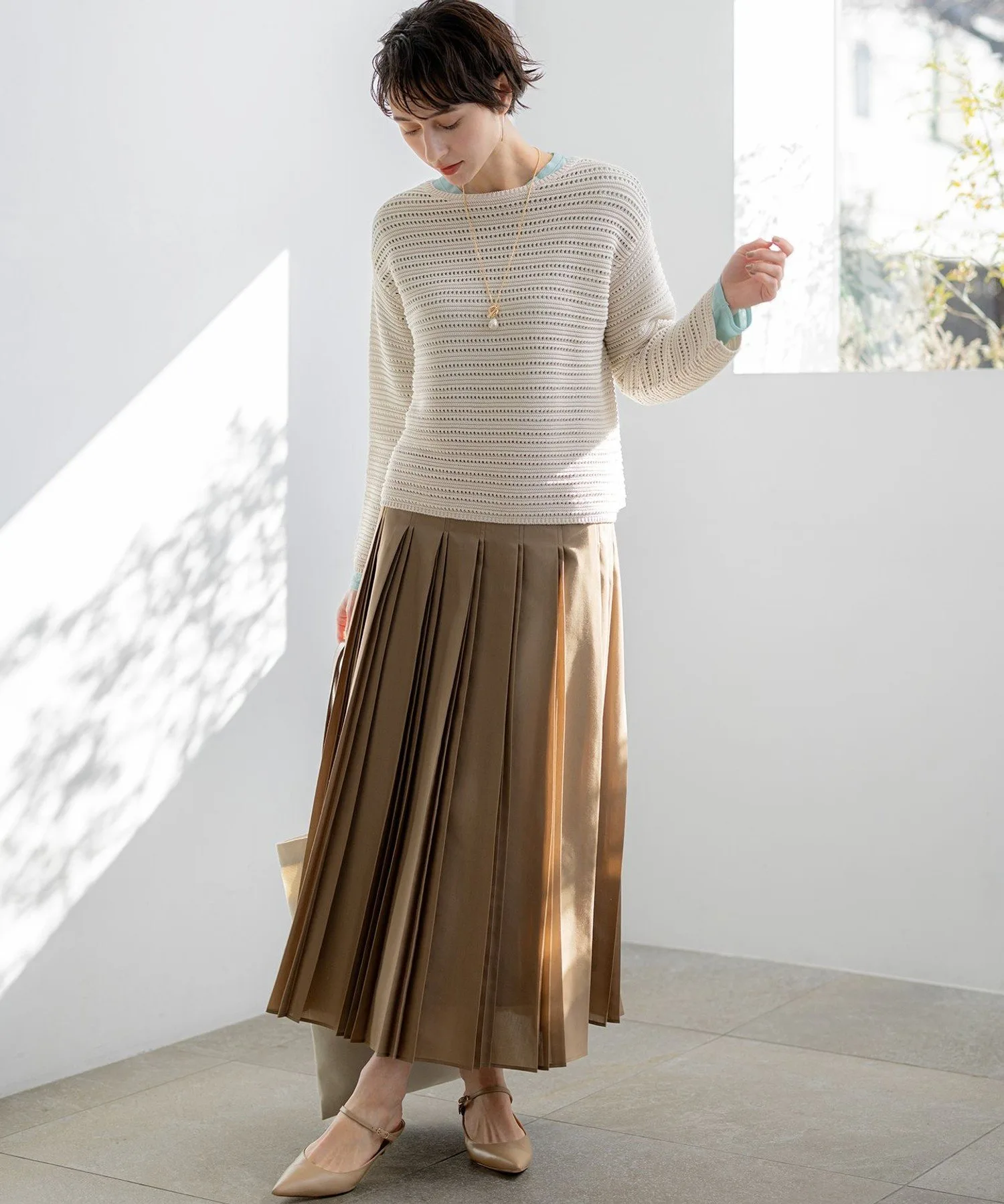 Этот трикотажный свитер с вырезом-лодочкой имеет легкий трикотажный узор, подчеркнутый ажурными элементами и естественным блеском. Изысканный крой обеспечивает достаточно свободы движений для создания обтекаемого силуэта, формируя утонченный, элегантный повседневный стиль. Носите его отдельно или сочетайте с рубашкой или топом для создания изысканного, утонченного образа. Доступен в четырех цветах: чистый белый (#001), элегантный и комфортный бежевый (#033), изысканный темно-синий (#075) и светло-желтый (#042) для более яркого образа.