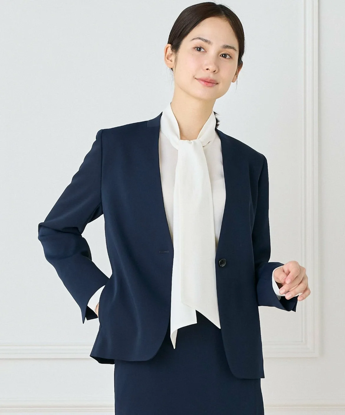 Этот жакет без воротника имеет красивый, аккуратный V-образный вырез. Однопуговичная застежка делает его идеальным для повседневной носки. Естественная эластичность в двух направлениях делает его подходящим для всех сезонов. Его можно носить как в комплекте с брюками или юбкой из того же материала, так и как самостоятельный жакет, что делает его универсальным предметом гардероба. Он подходит не только для деловых встреч, но и для торжественных и официальных мероприятий.