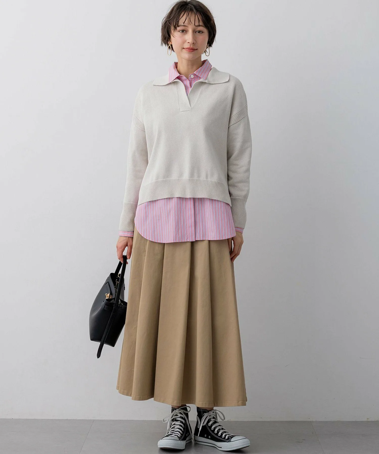 Этот пуловер с воротником-стойкой — эффектная вещь. Связанный из трикотажа, он отличается простым дизайном, но тщательно подобранный размер делает его идеальным как для самостоятельного ношения, так и для сочетания с рубашкой или футболкой для создания сбалансированного образа. Боковые разрезы позволяют легко создать утонченный и элегантный образ, слегка заправив передний край и оставив воротник расстегнутым. Эта вещь излучает утонченный и непринужденный стиль, идеально подходящий для женщин зрелого возраста. Доступен в трех цветах: белый (#001), классический цвет, который идеально сочетается с любым стилем; бежевый (#033), изысканный, тонкий цвет, создающий нежное и мягкое впечатление; и темно-синий (#075), шикарный цвет, идеально подходящий для взрослых, излучающий интеллектуальную и утонченную атмосферу.