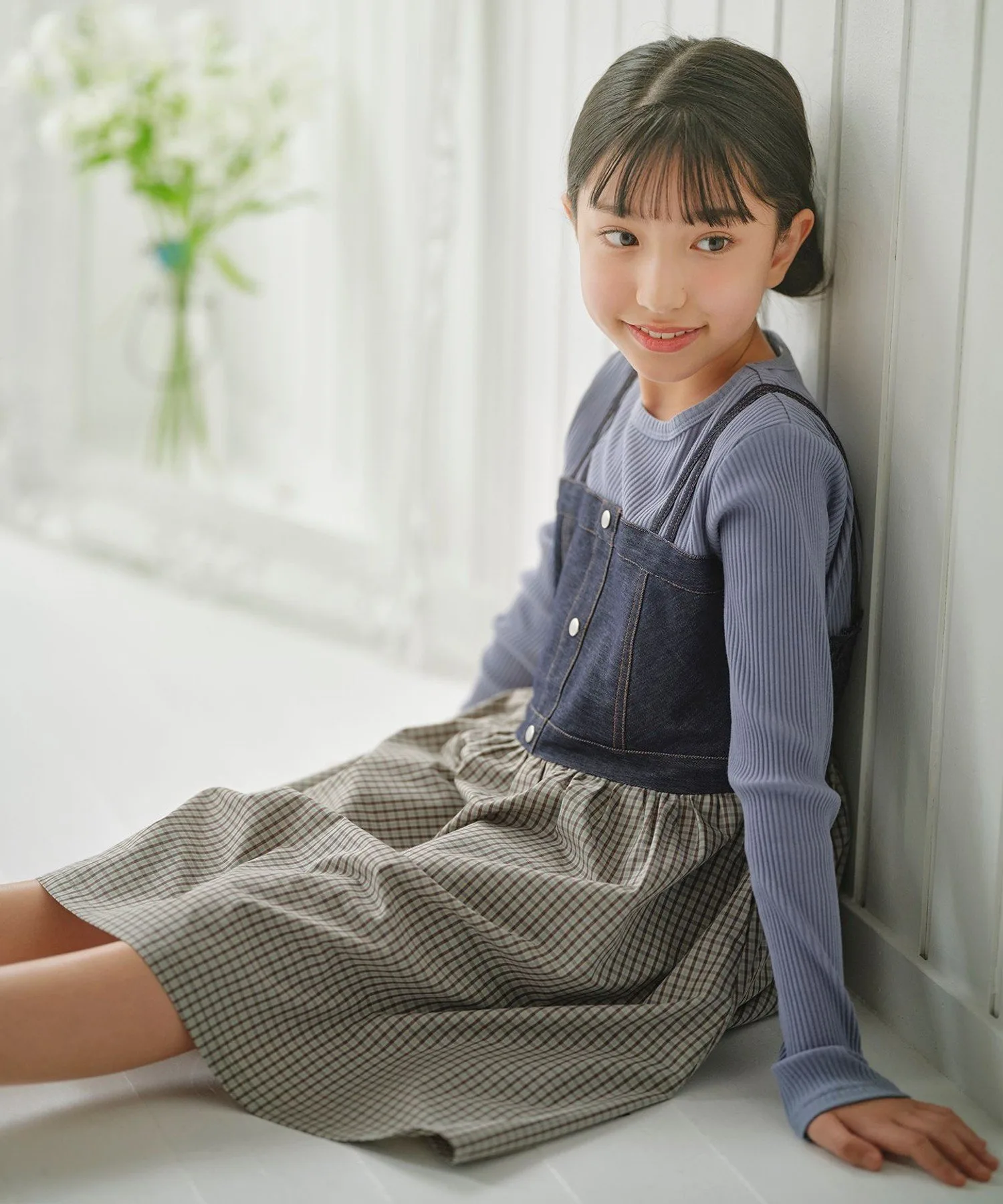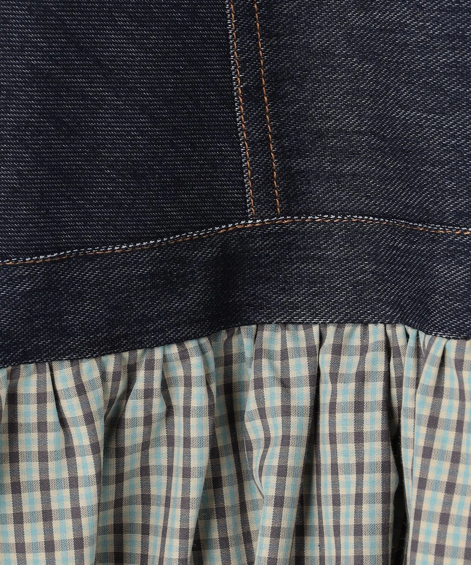 Ребристый верх и джинсовая ткань выполнены из сшитого материала, обеспечивающего свободу движений, а юбка изготовлена из полиэстеровой и вискозной ткани в мелкую клетку, которая не мнется даже при длительном ношении.