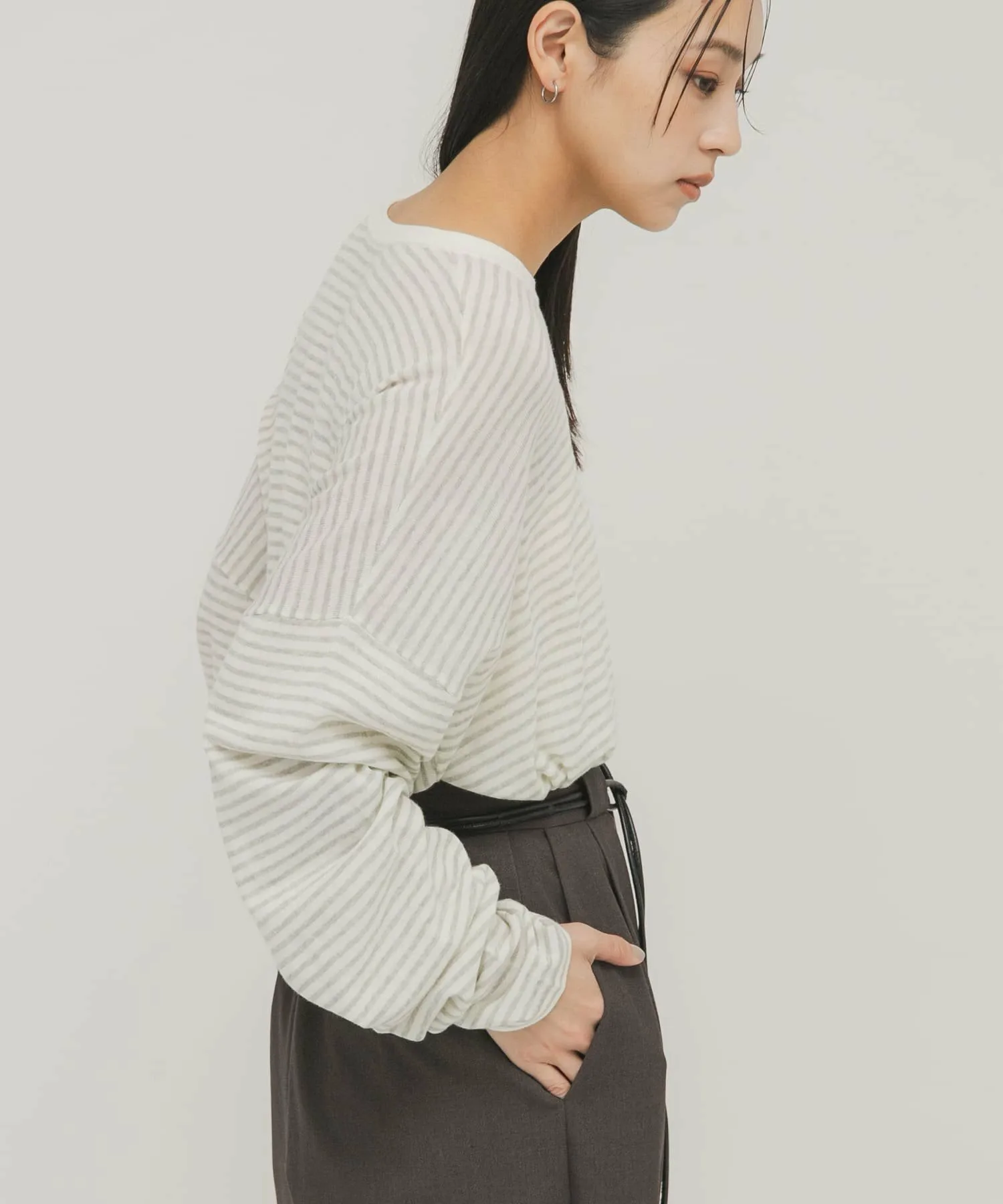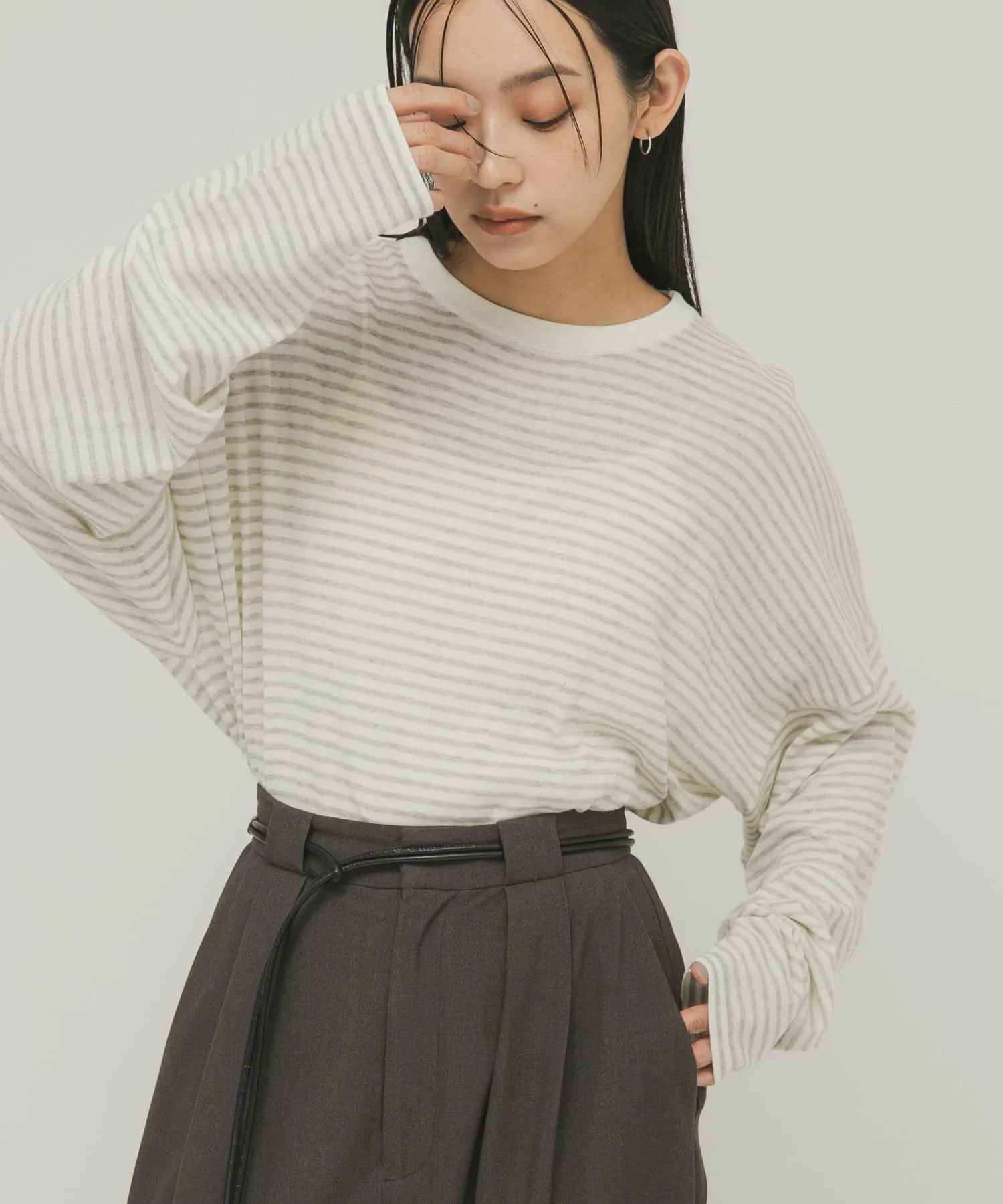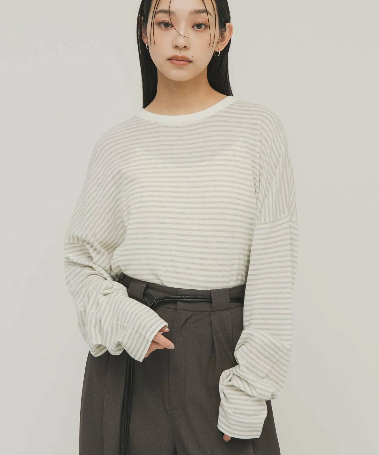 Этот полосатый топ имеет свободный, мужественный силуэт и удобен в ношении. Немного удлиненная длина и рукава создают расслабленный образ. Прозрачный материал и оригинальная многоцветная окантовка также являются ключевыми особенностями. Он хорошо сочетается с любыми брюками и идеально подходит в качестве нижнего слоя под куртку.
