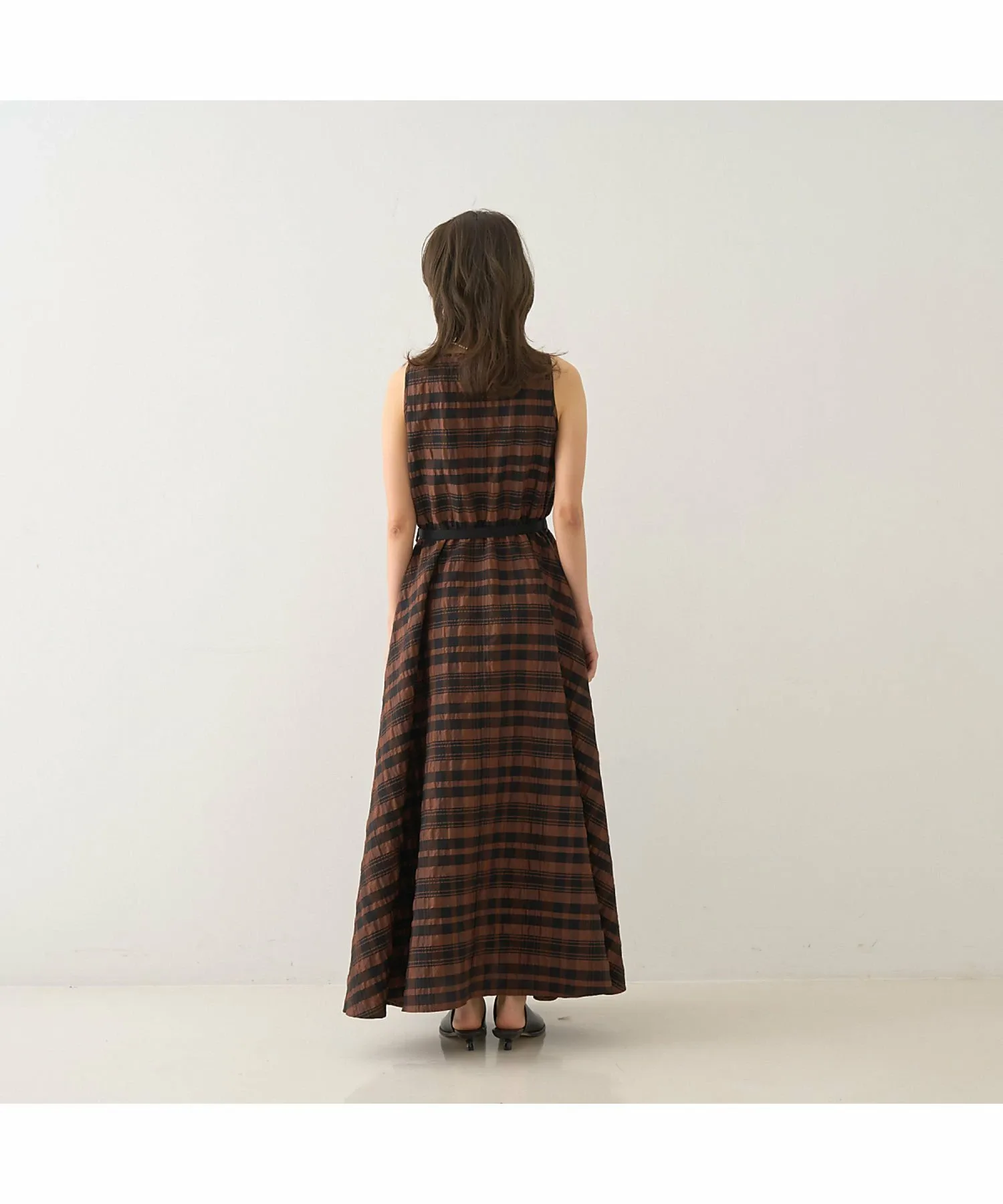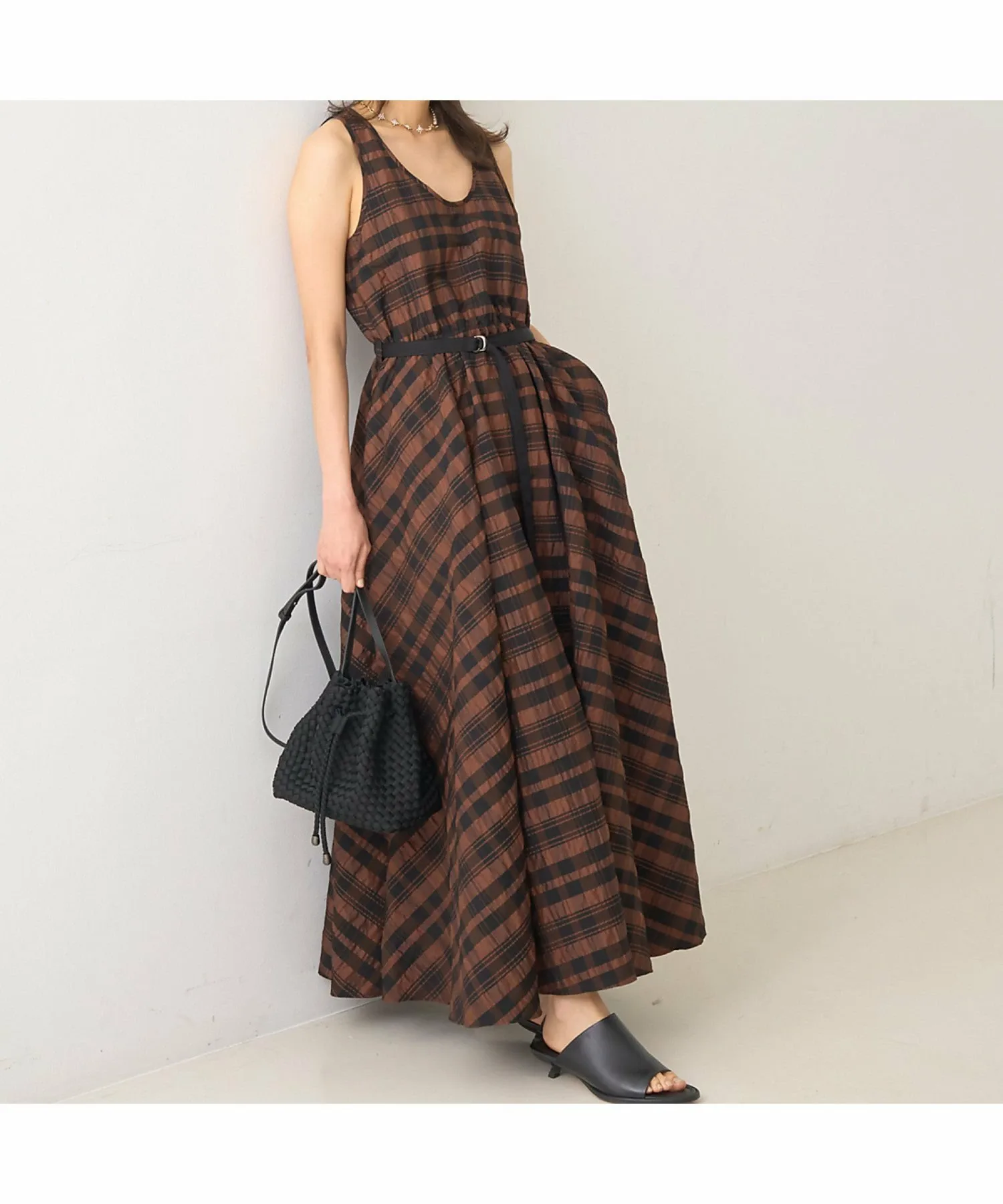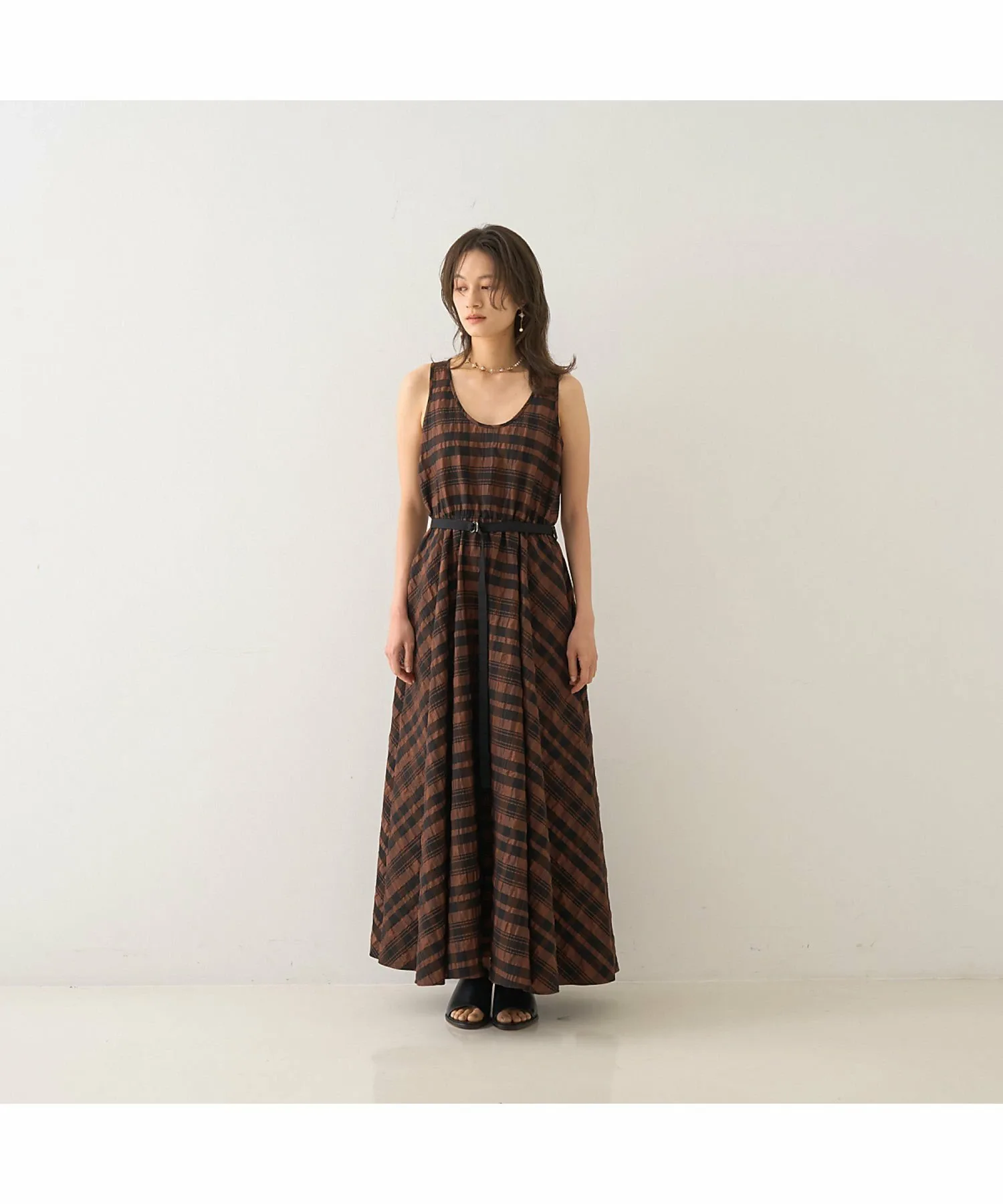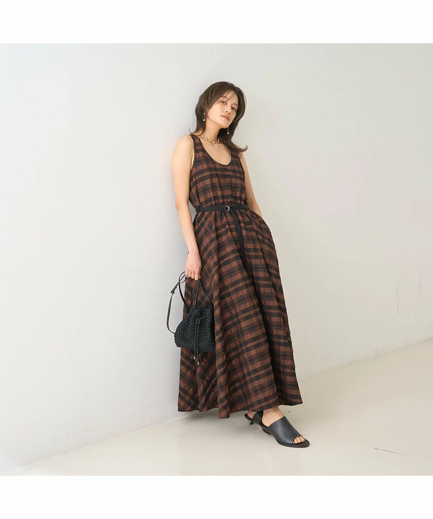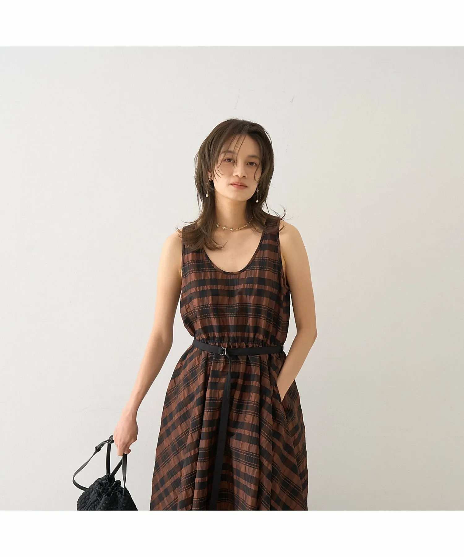 Это летнее платье украшено эффектным крупным клетчатым узором в стиле сирсакер, создающим освежающий летний образ. Текстурированный материал не прилипает к коже, обеспечивая ощущение легкости и прохлады. Красивый силуэт, плавно переходящий от облегающего, компактного верха к пышной юбке, создает впечатляющий эффект при каждом движении. Входящий в комплект пояс подчеркивает талию, делая ее более выразительной. Это изысканное летнее платье идеально подходит для обедов в выходные, отдыха на курорте или неформальных встреч. [Примечания] Изображения товара могут отличаться от реального цвета в зависимости от условий освещения и настроек вашего компьютера. Благодарим за понимание. Показанный товар является образцом.