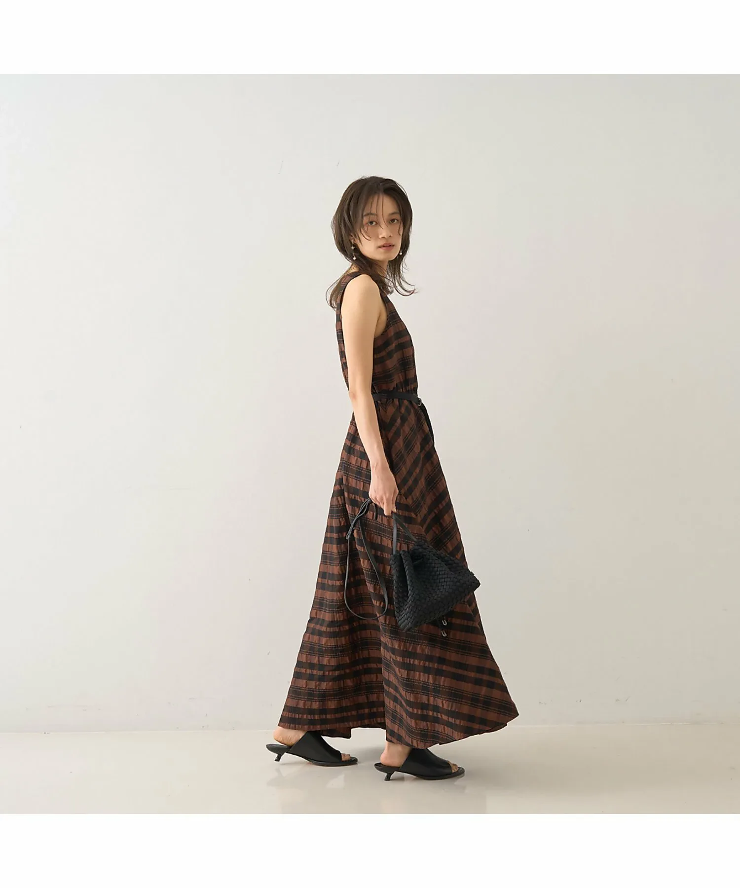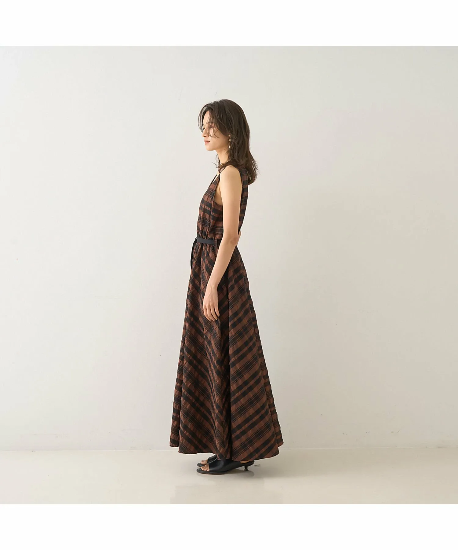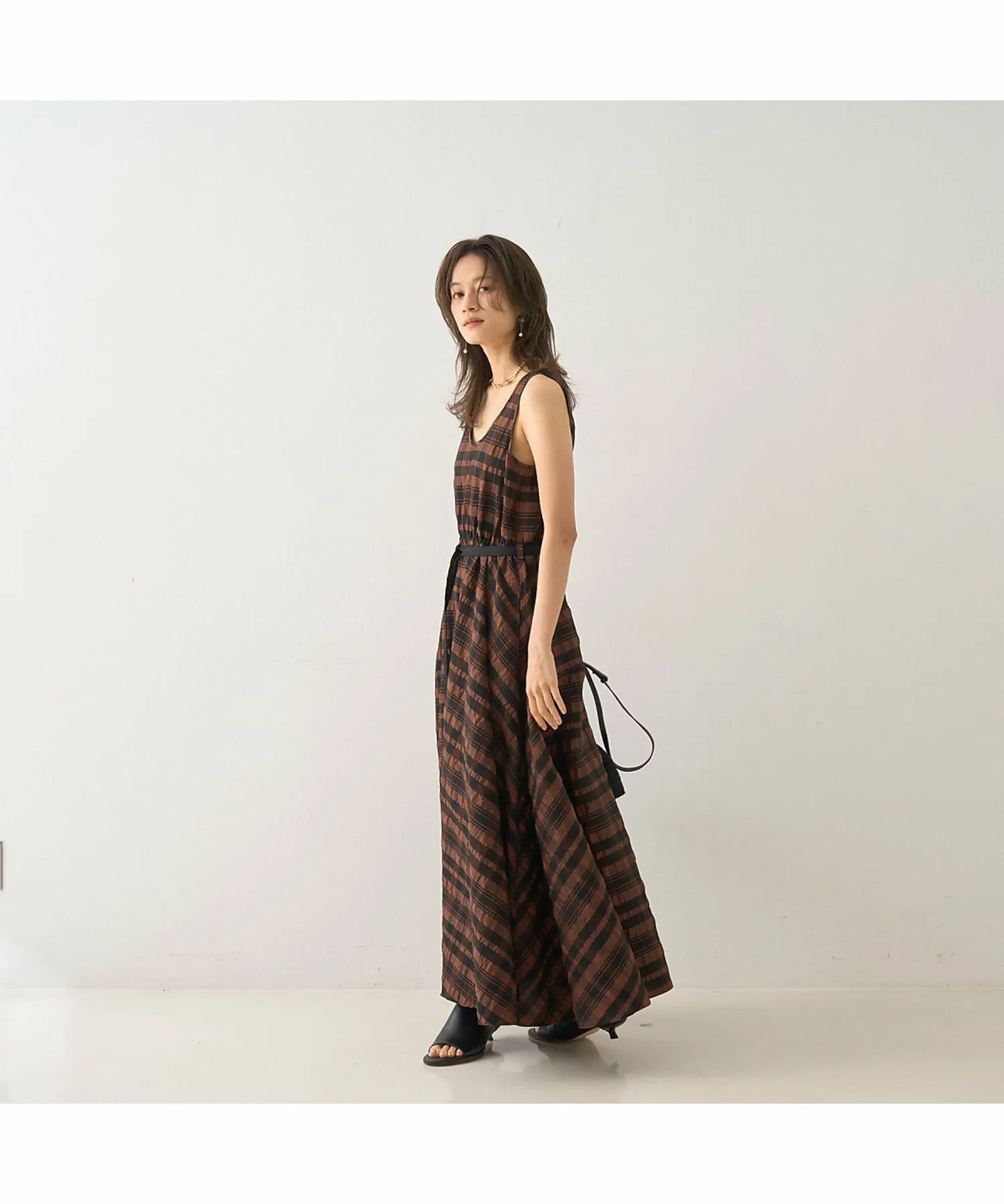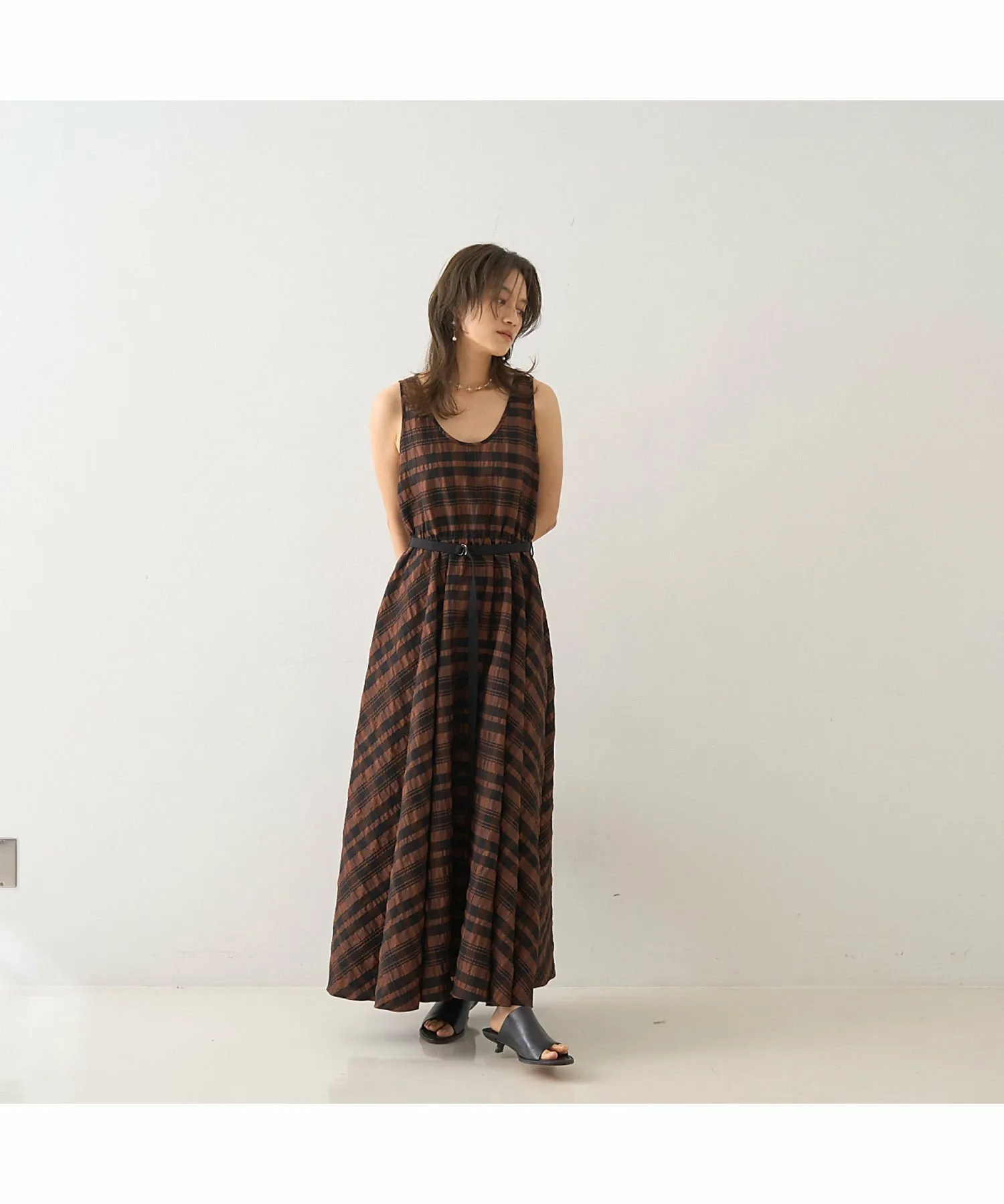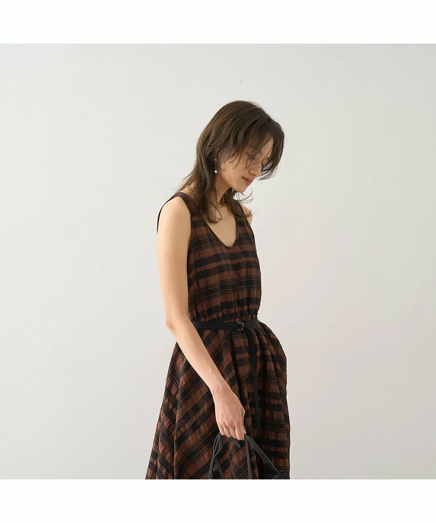 Это летнее платье украшено эффектным крупным клетчатым узором в стиле сирсакер, создающим освежающий летний образ. Текстурированный материал не прилипает к коже, обеспечивая ощущение легкости и прохлады. Красивый силуэт, плавно переходящий от облегающего, компактного верха к пышной юбке, создает впечатляющий эффект при каждом движении. Входящий в комплект пояс подчеркивает талию, делая ее более выразительной. Это изысканное летнее платье идеально подходит для обедов в выходные, отдыха на курорте или неформальных встреч. [Примечания] Изображения товара могут отличаться от реального цвета в зависимости от условий освещения и настроек вашего компьютера. Благодарим за понимание. Показанный товар является образцом.