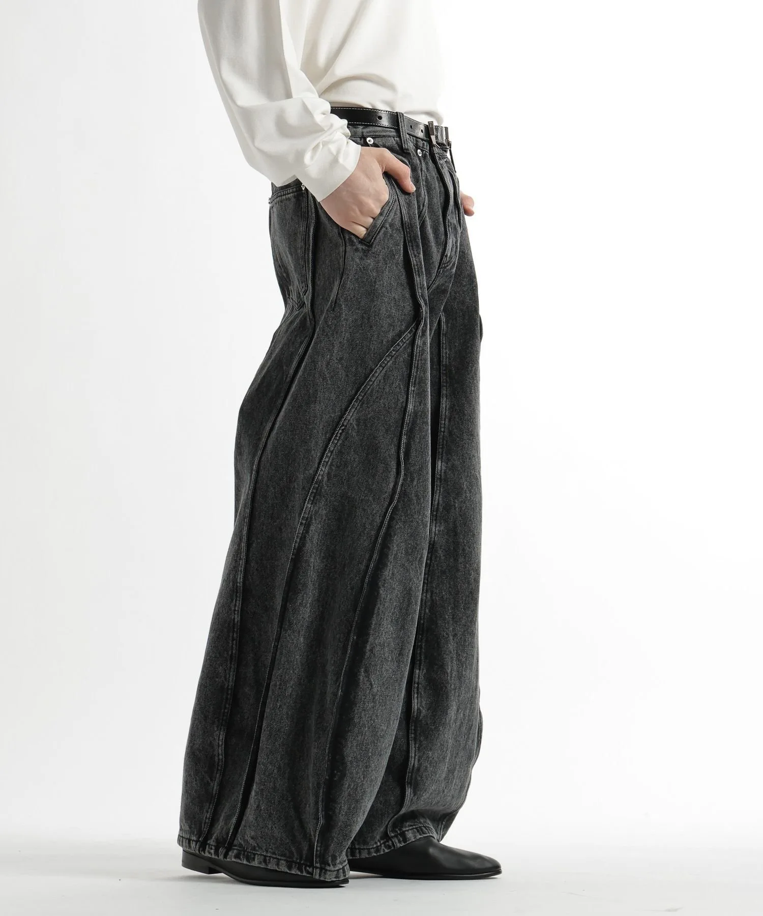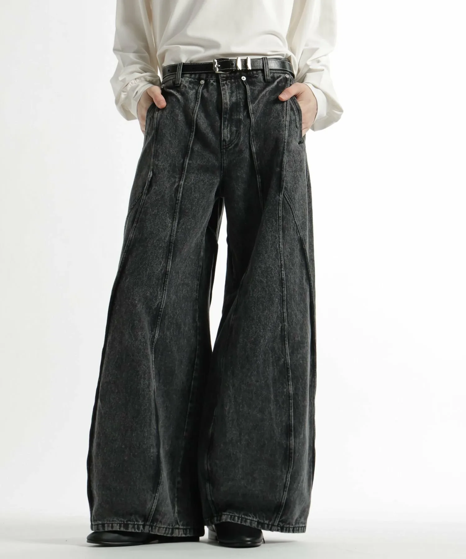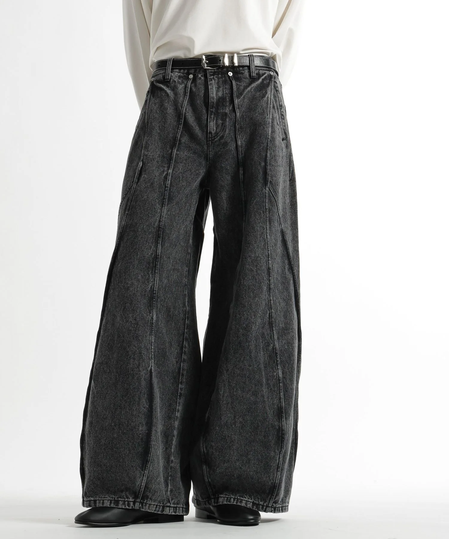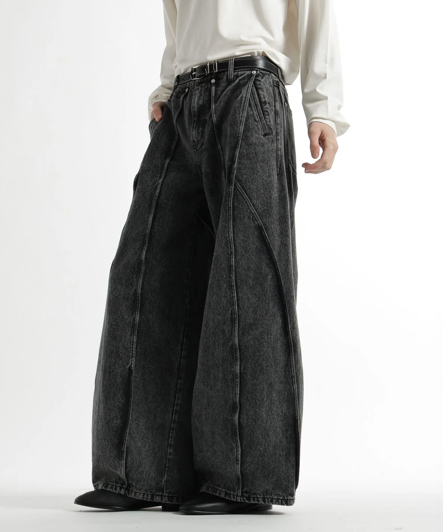 Широкие джинсовые брюки с эффектным современным дизайном, отличающиеся смелыми переходами между панелями и структурированным силуэтом.