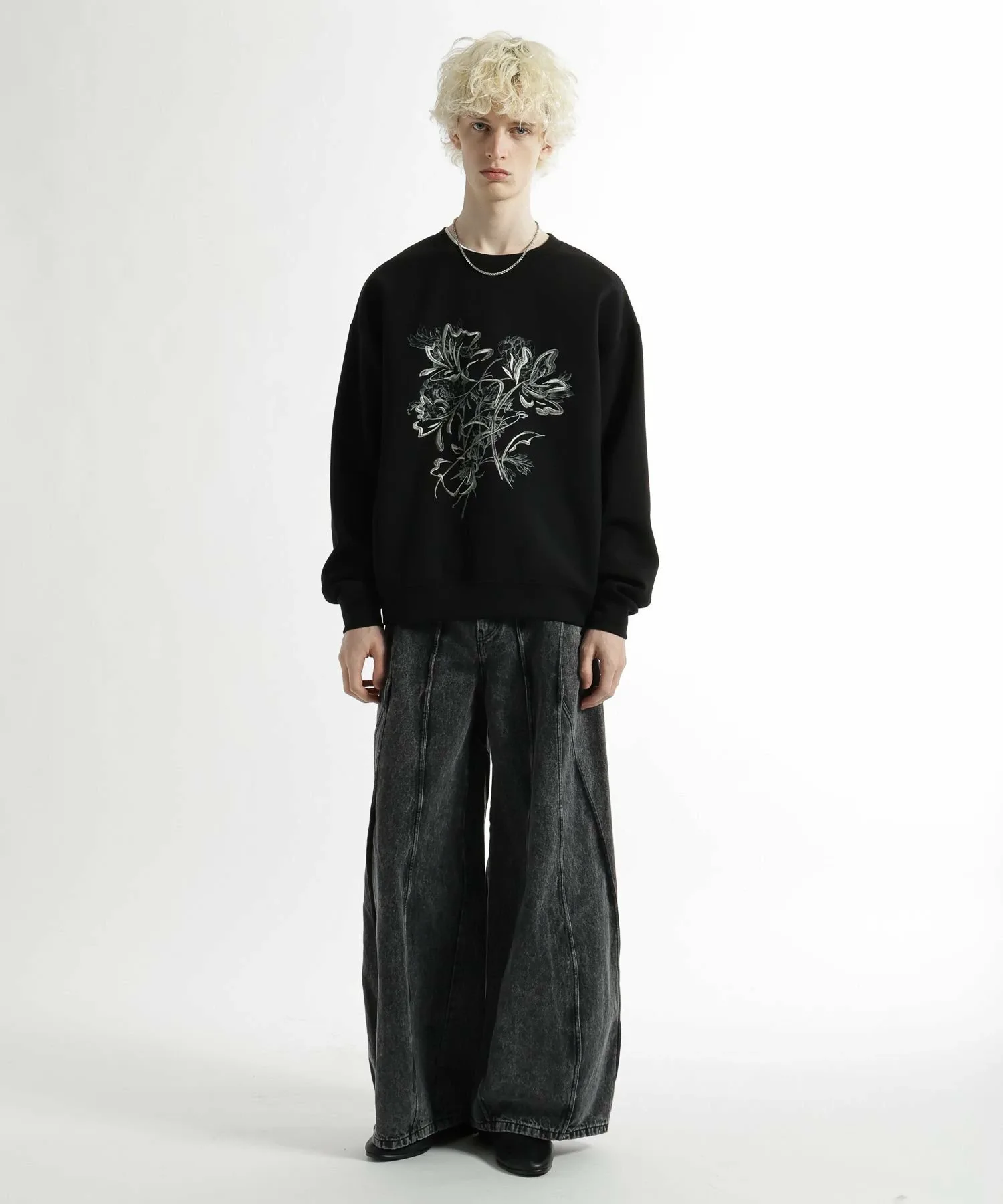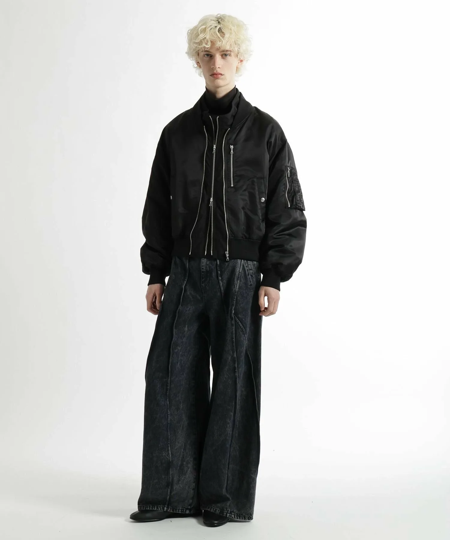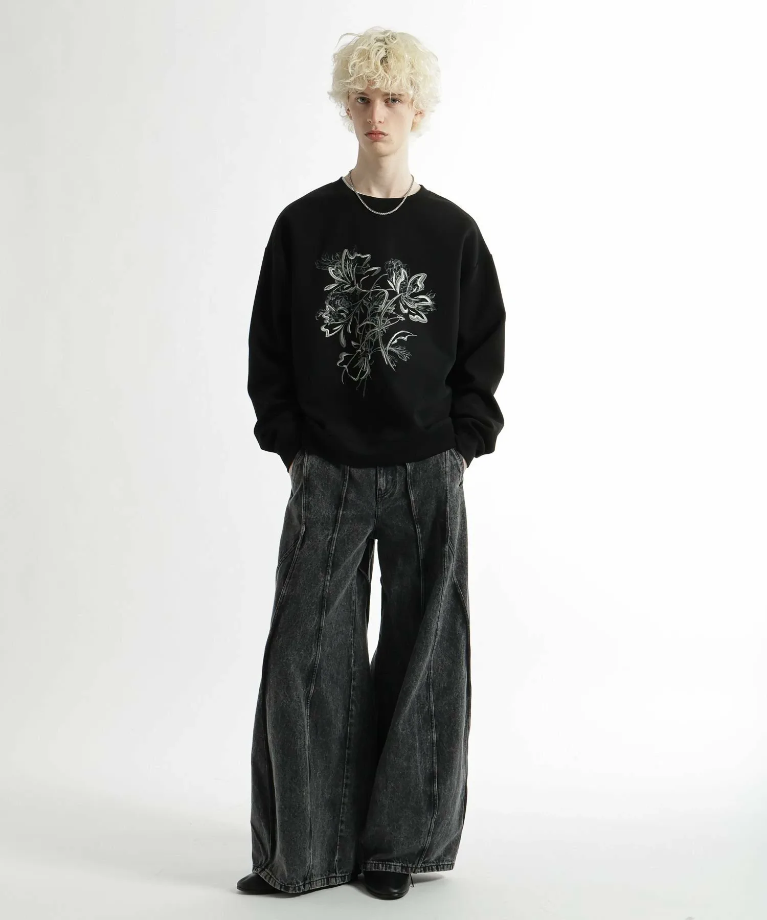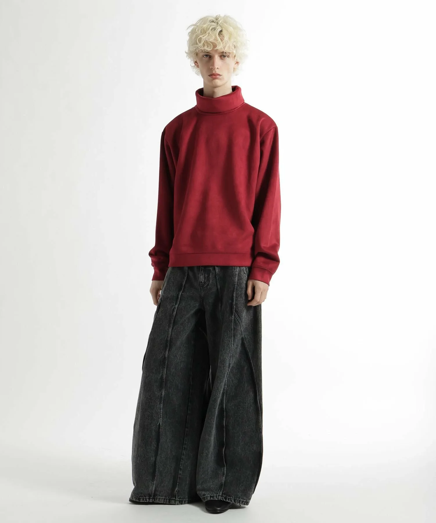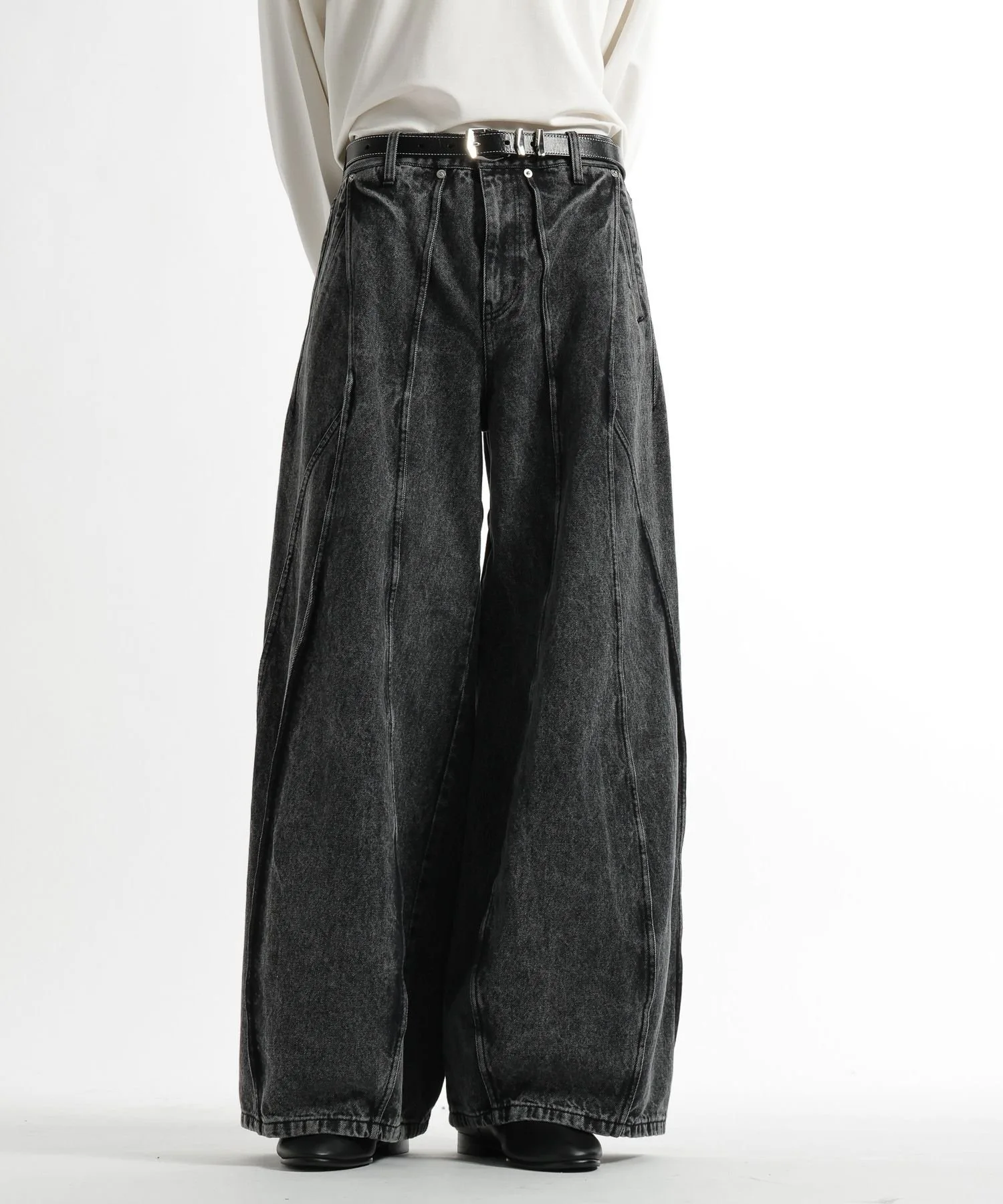 Широкие джинсовые брюки с эффектным современным дизайном, отличающиеся смелыми переходами между панелями и структурированным силуэтом.