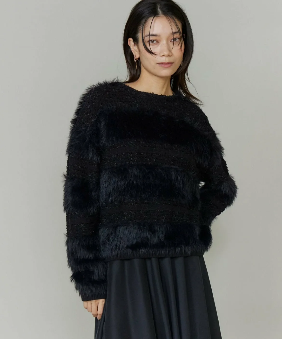 Этот трикотаж отличается великолепным и элегантным узором по краю, выполненным из тонкой пряжи, напоминающей перья, и твидового рисунка. Воротник обработан по краю, что придает изделию изысканный и солидный вид. Использование различных видов пряжи в одном изделии создает трехмерный эффект, делая его отличным акцентным элементом для любого наряда.