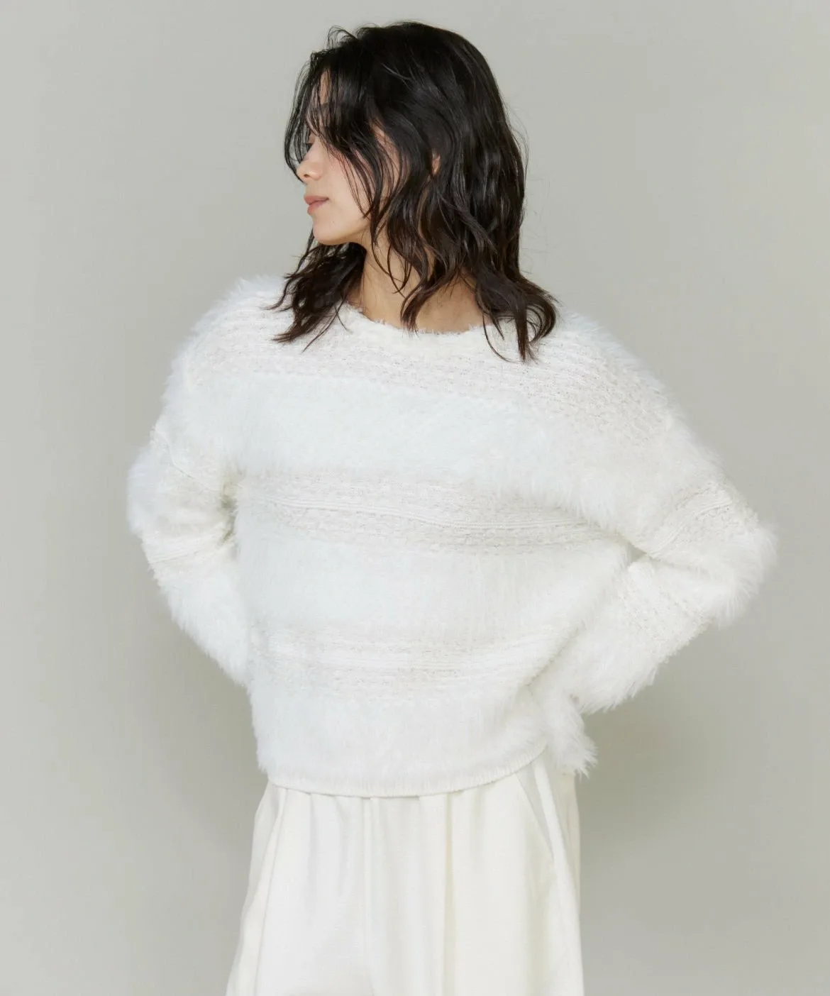 Этот трикотаж отличается великолепным и элегантным узором по краю, выполненным из тонкой пряжи, напоминающей перья, и твидового рисунка. Воротник обработан по краю, что придает изделию изысканный и солидный вид. Использование различных видов пряжи в одном изделии создает трехмерный эффект, делая его отличным акцентным элементом для любого наряда.