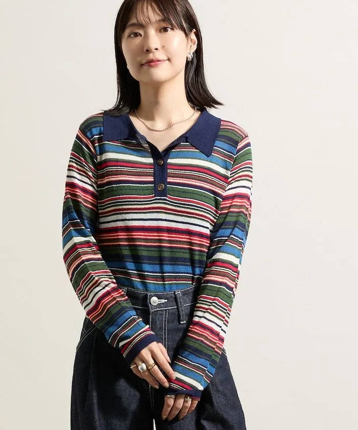 ●Сочетание полосатого трикотажа и рубашки-поло часто выглядит повседневно, но использование прозрачного материала придает ей расслабленный и изысканный вид