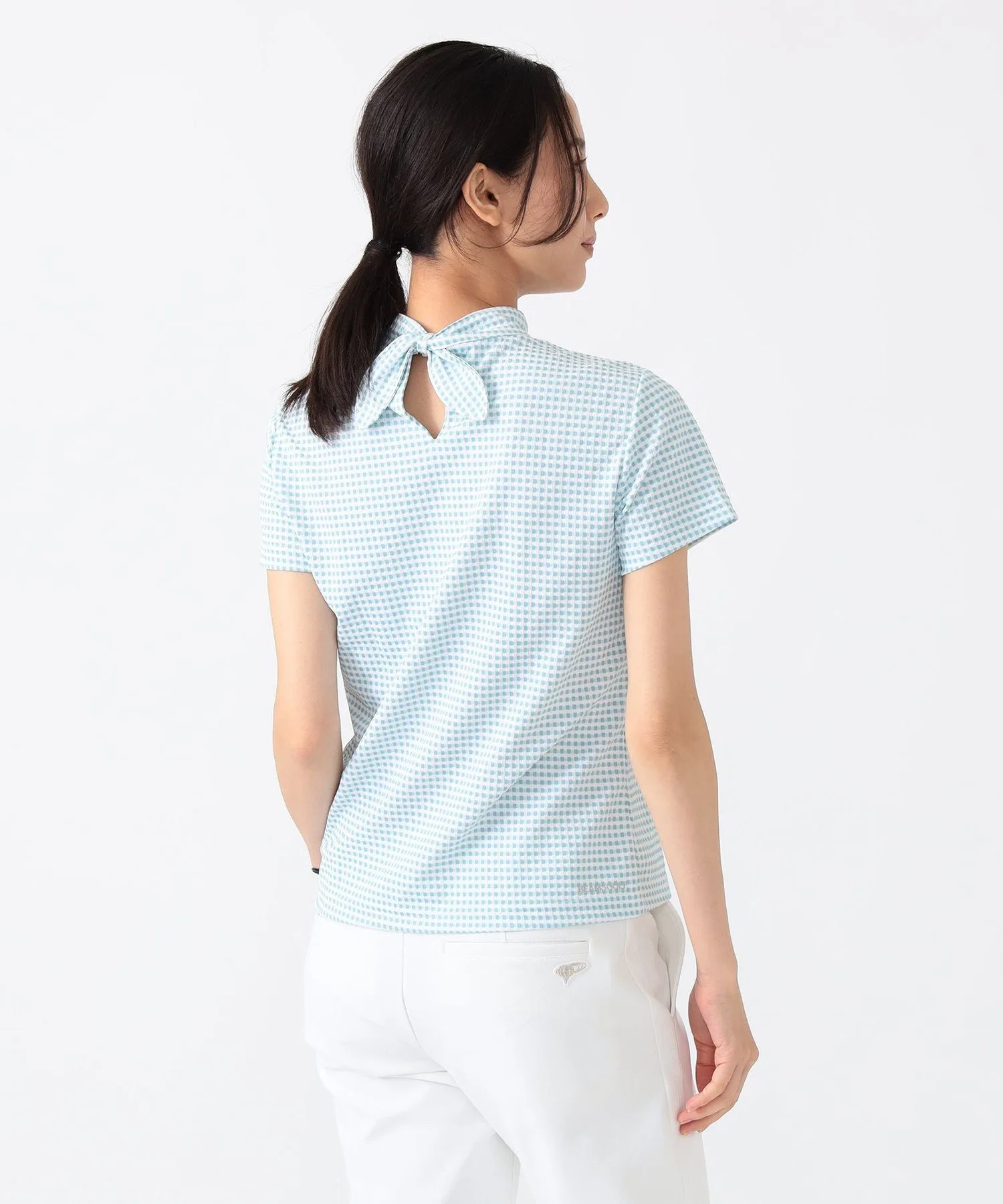Эта простая, но изысканная рубашка с воротником-стойкой выполнена из жаккардовой ткани в клетку. Ее наиболее отличительной чертой являются перекрещивающиеся ленты на воротнике-стойке. Это ненавязчивый акцент, не слишком приторный, создающий тонкий женственный штрих. Доступна в мягких, красивых цветах, легко сочетается с любыми брюками или юбками.