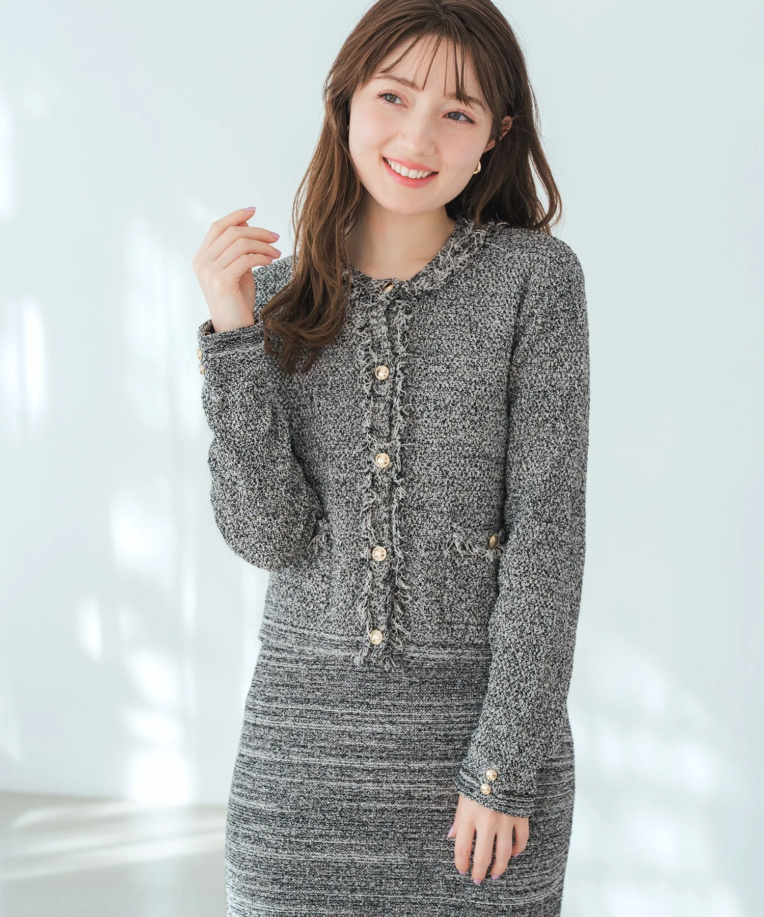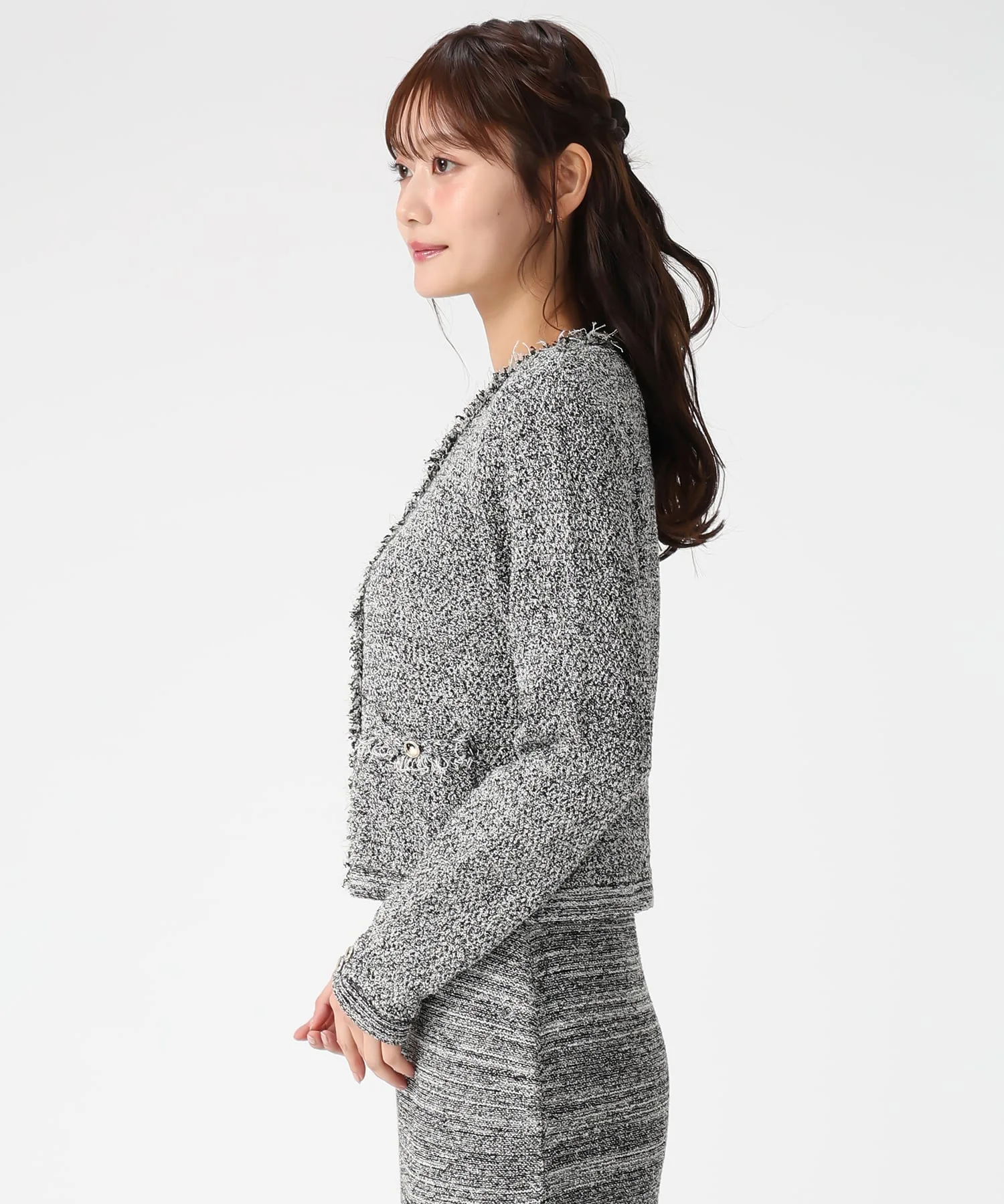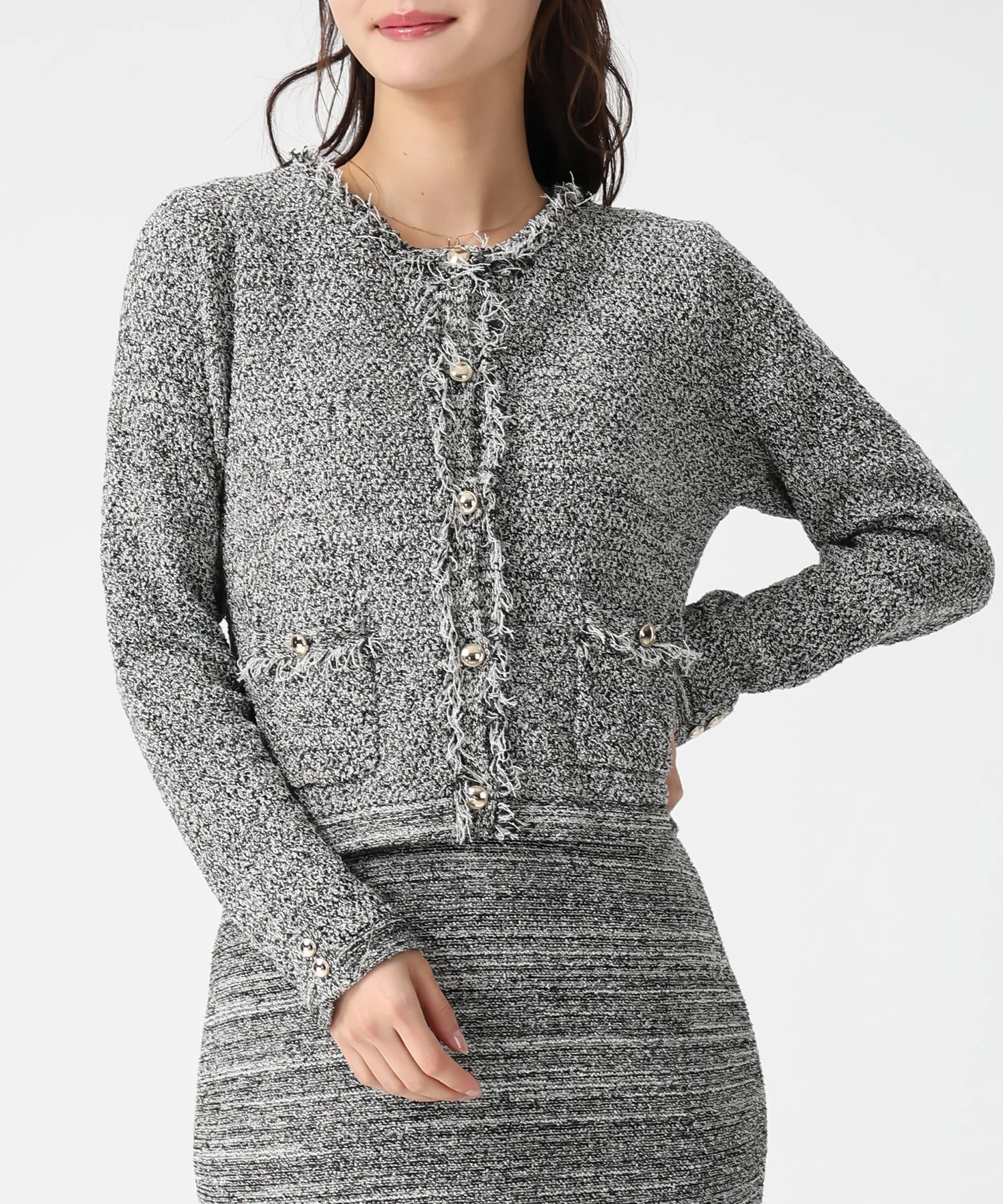 Этот жакет сочетает в себе элегантность и гламур благодаря трикотажной ткани, напоминающей твид, и деталям с бахромой. Мягкая текстура трикотажа делает его удобным в носке, при этом он выглядит стильно. Мы также рекомендуем сочетать его с платьем из того же материала для создания гармоничного образа. Ткань: Прозрачность [Нет]Подкладка [Нет]Эластичность [Да]Толщина ткани [Обычная]