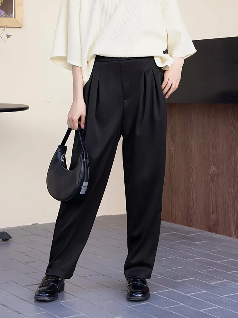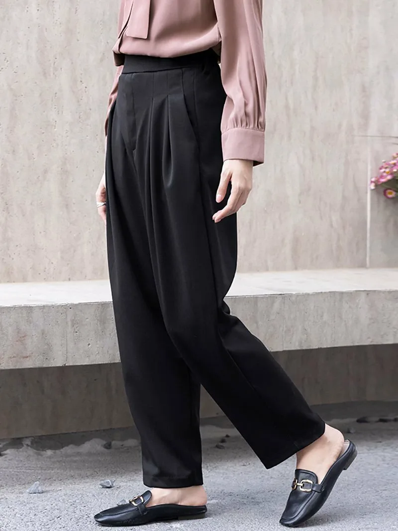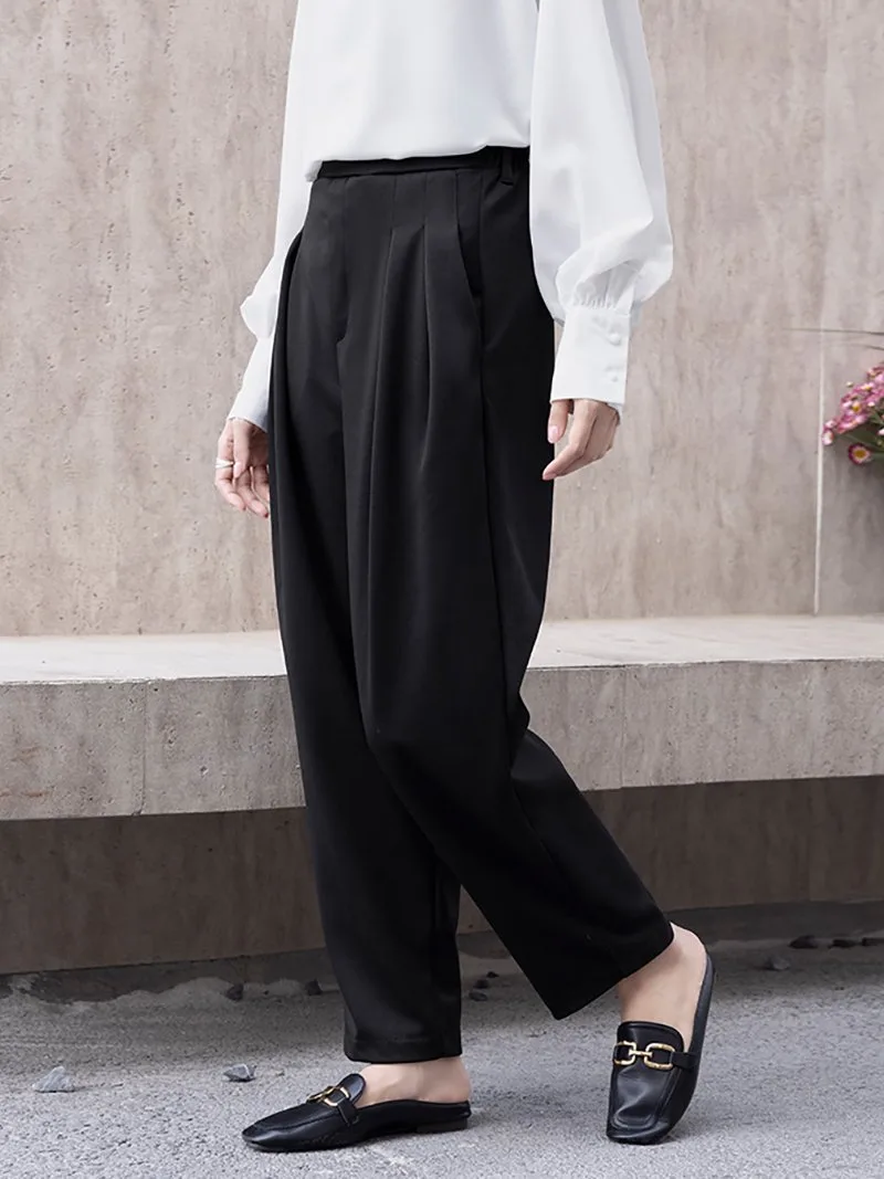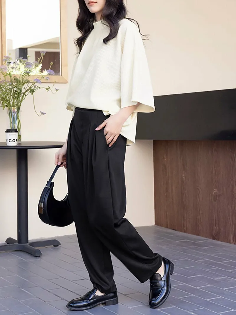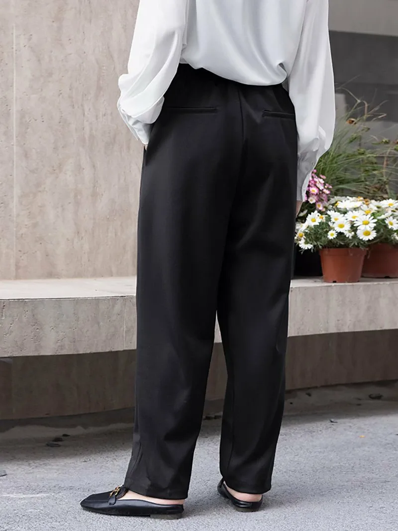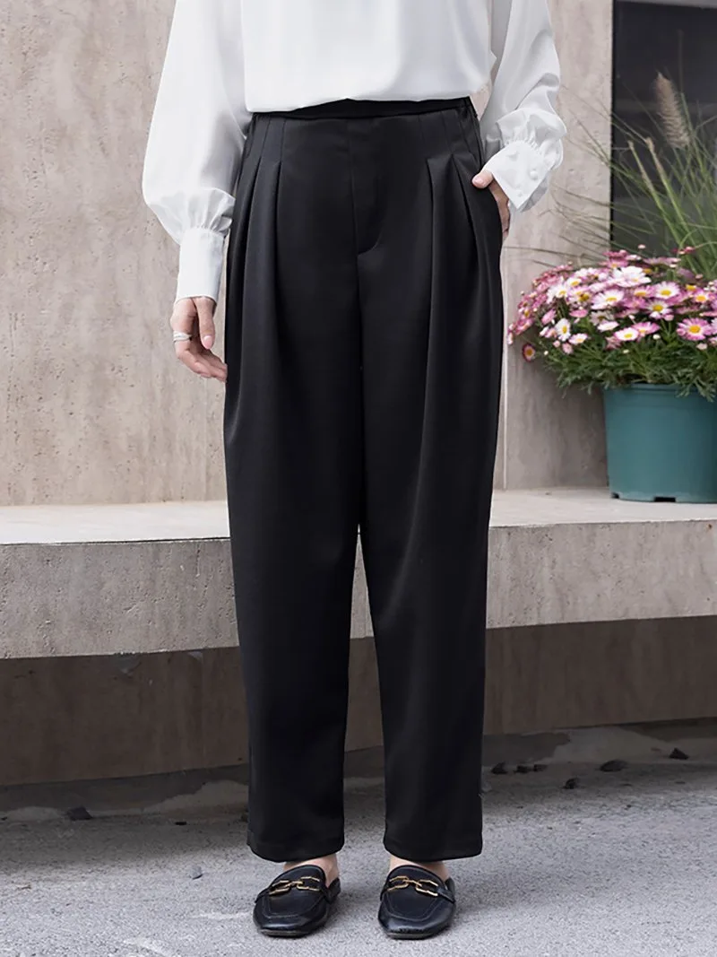 Новые зауженные брюки с заправленными штанинами, изготовленные из мягкого, струящегося материала для комфортной посадки!