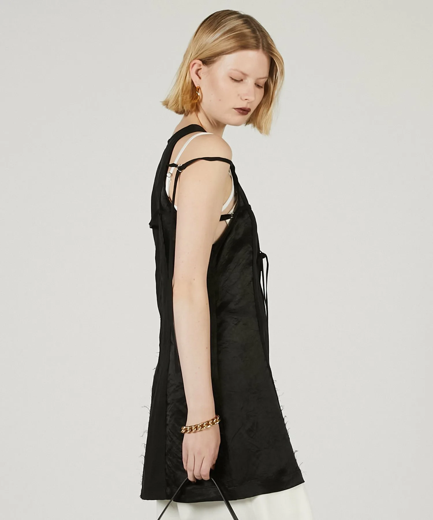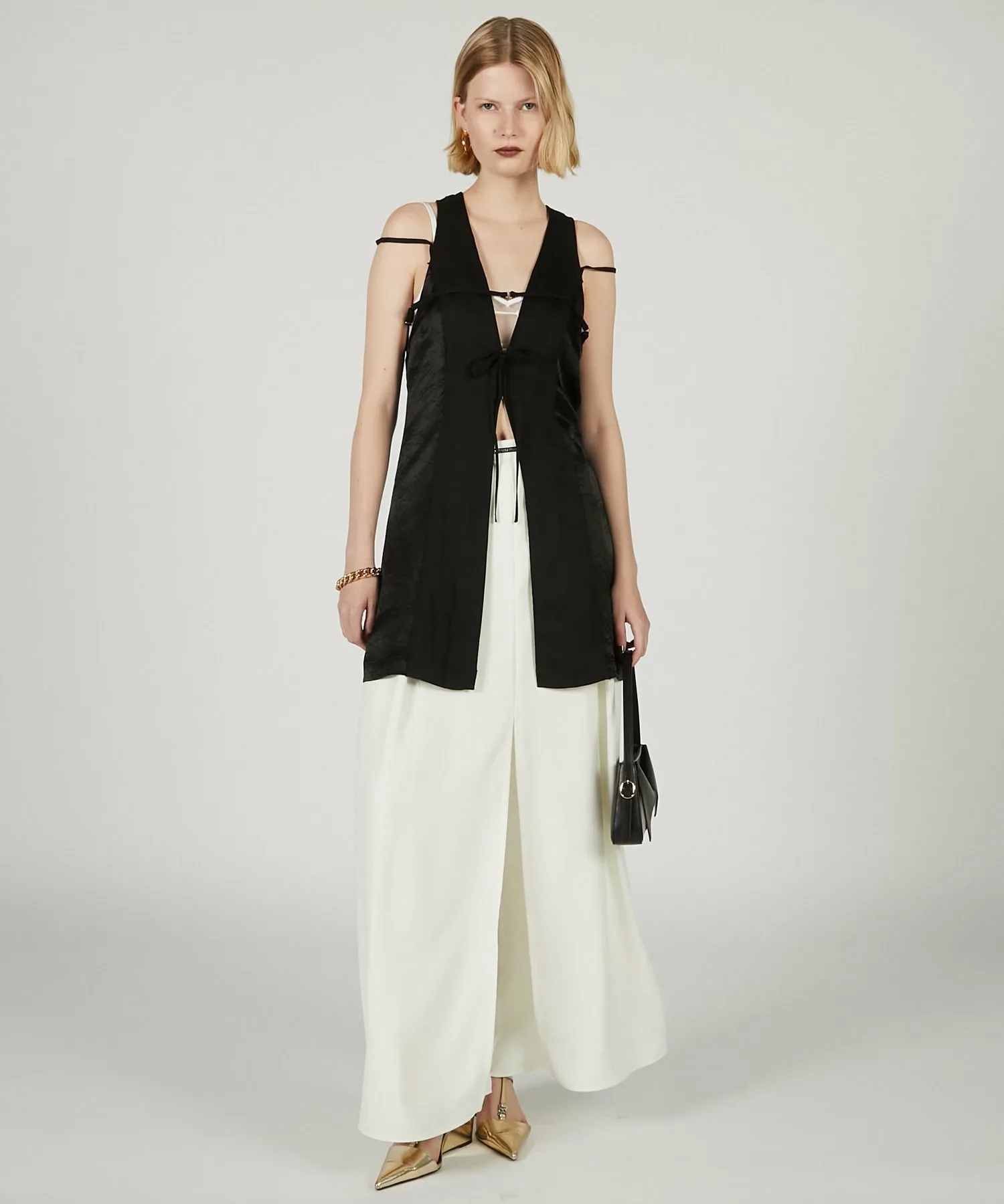 [BLK/IVR] Сочетание плотной саржи из тенселя и ацетатного атласа создает контраст.
