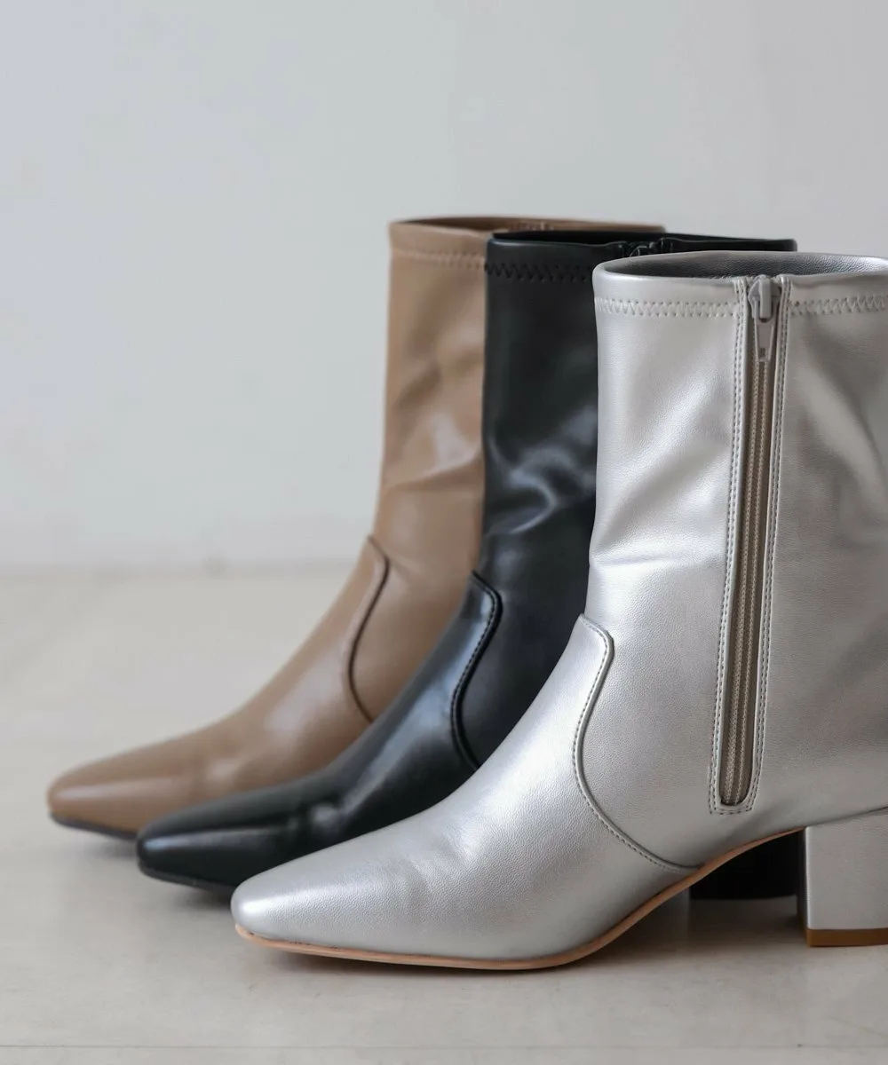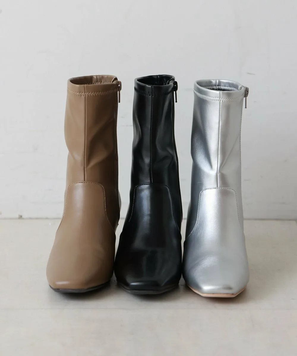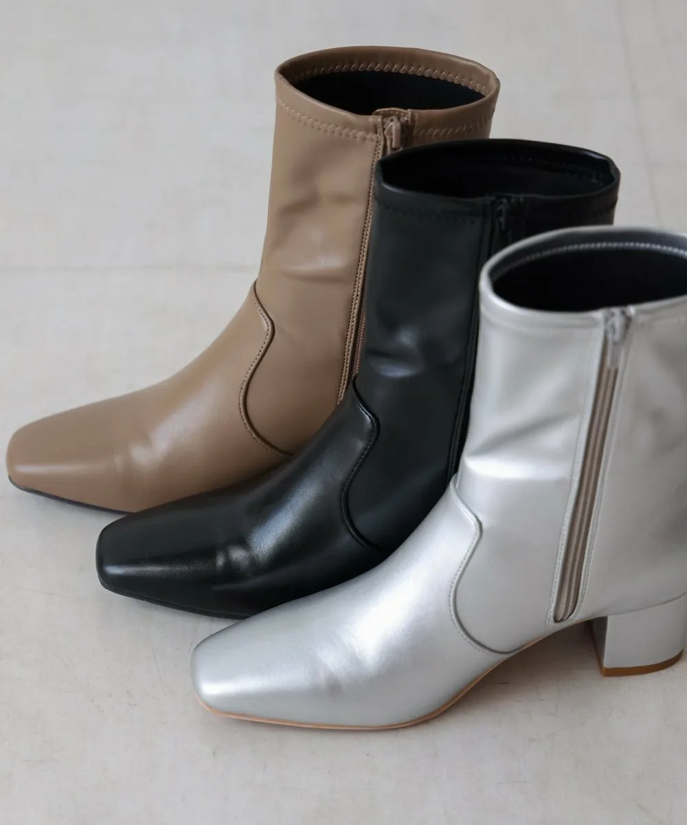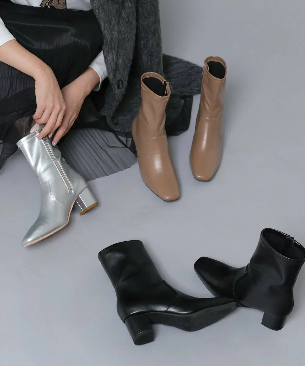 Короткие ботинки с квадратным носком из эластичного материала. Область щиколотки облегает, но эластичность обеспечивает аккуратный вид. Толстый каблук обеспечивает устойчивость и удобную посадку.