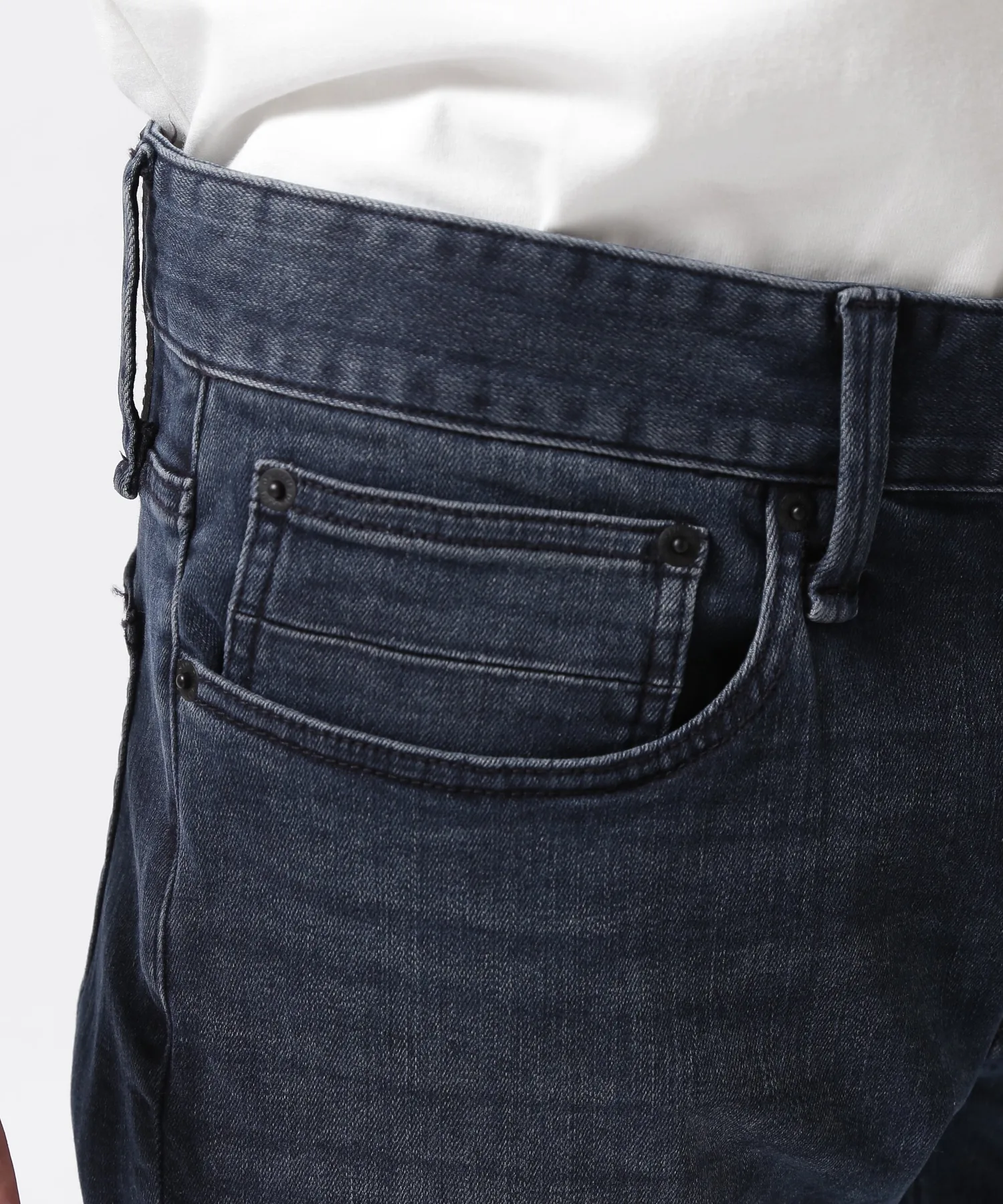 Этот темный деним окрашен в черный и индиго, а затем обработан.
