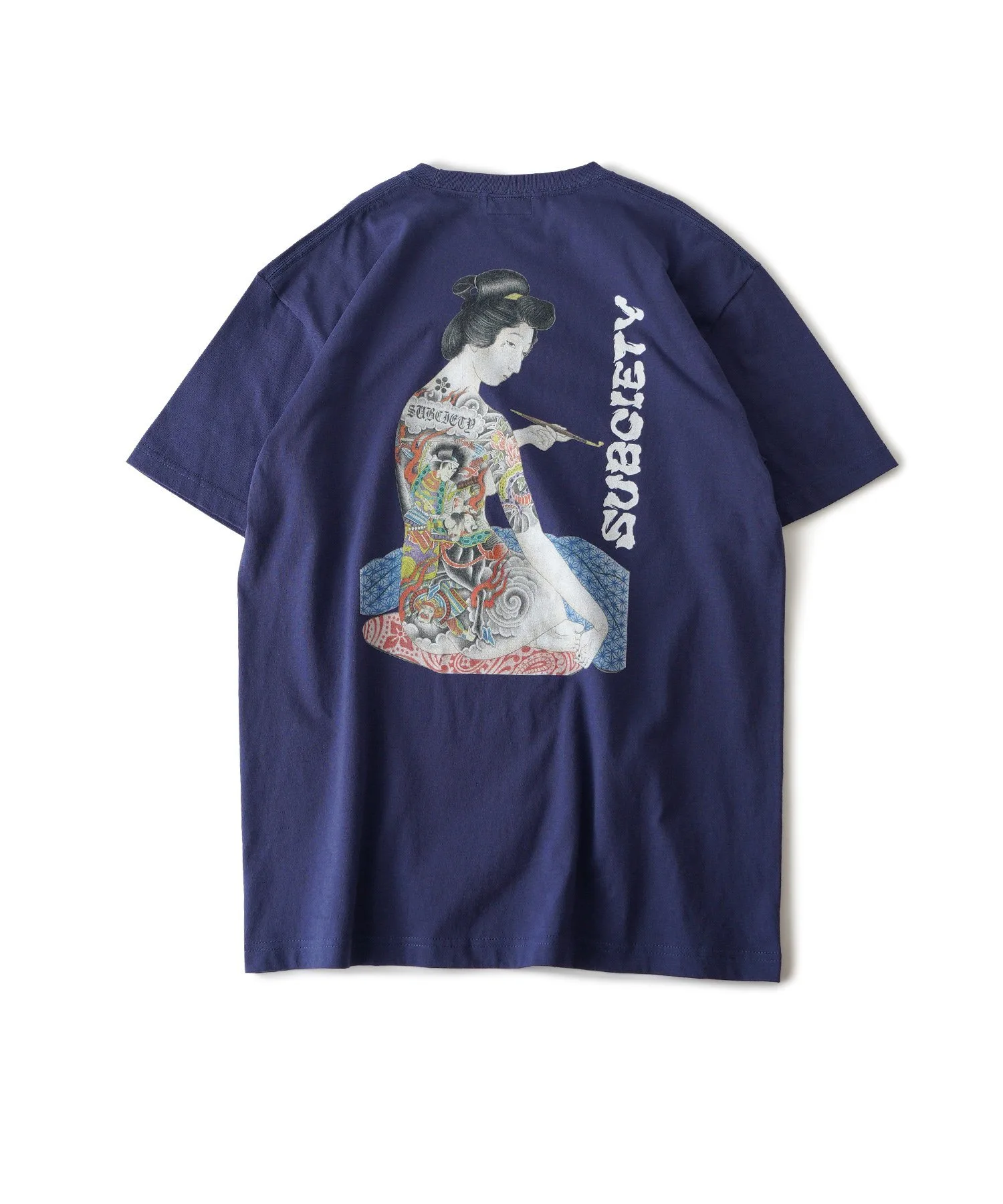 Логотип бренда, словно нарисованный кистью, напечатан на левой стороне груди, а на спине — изображение женщины, курящей трубку после ванны.