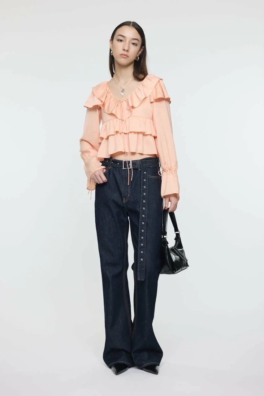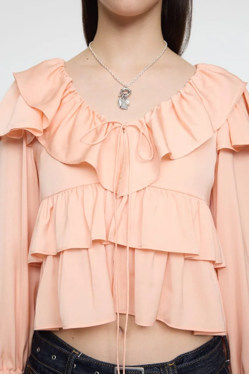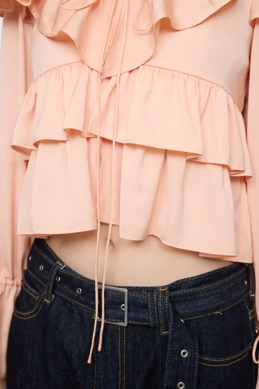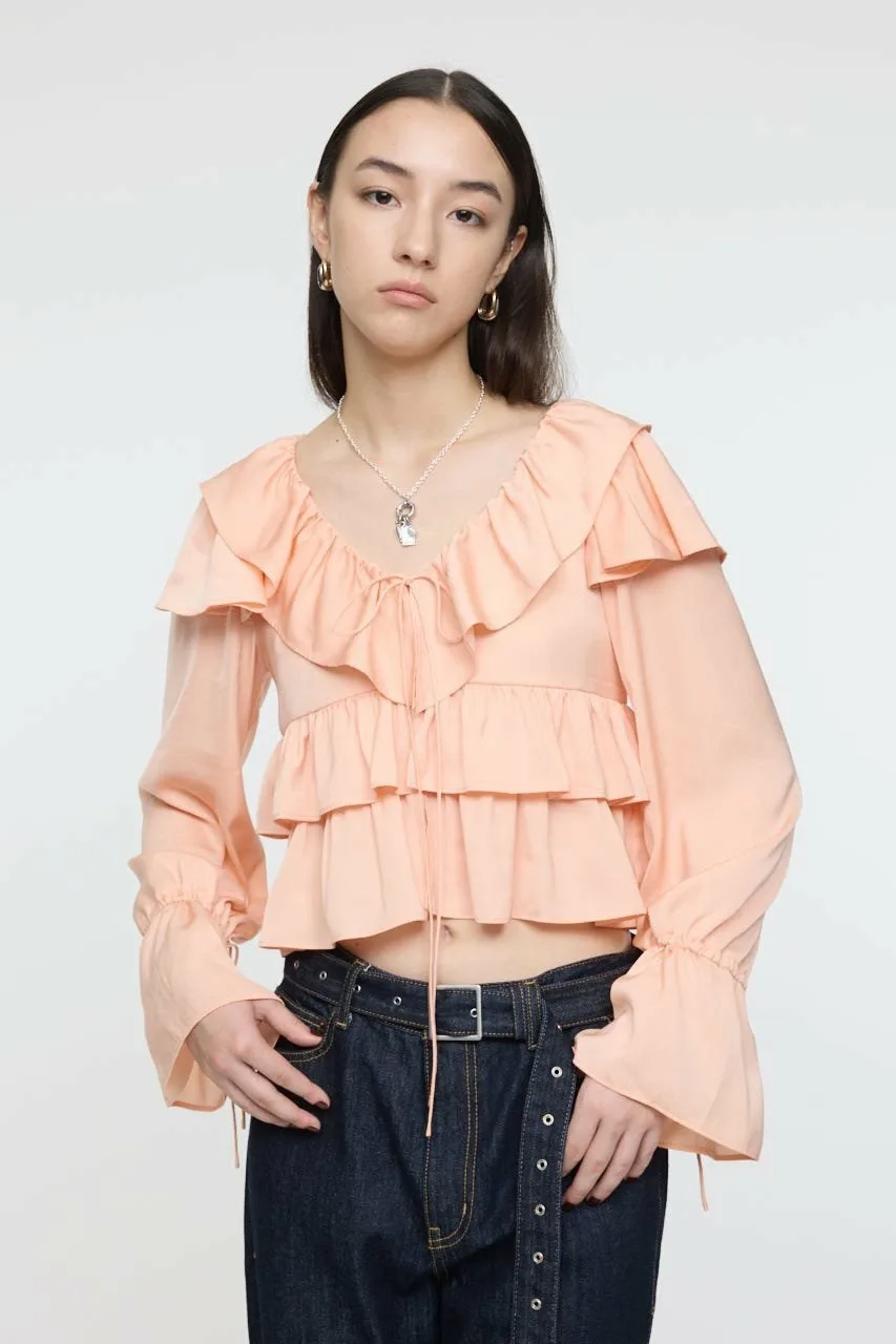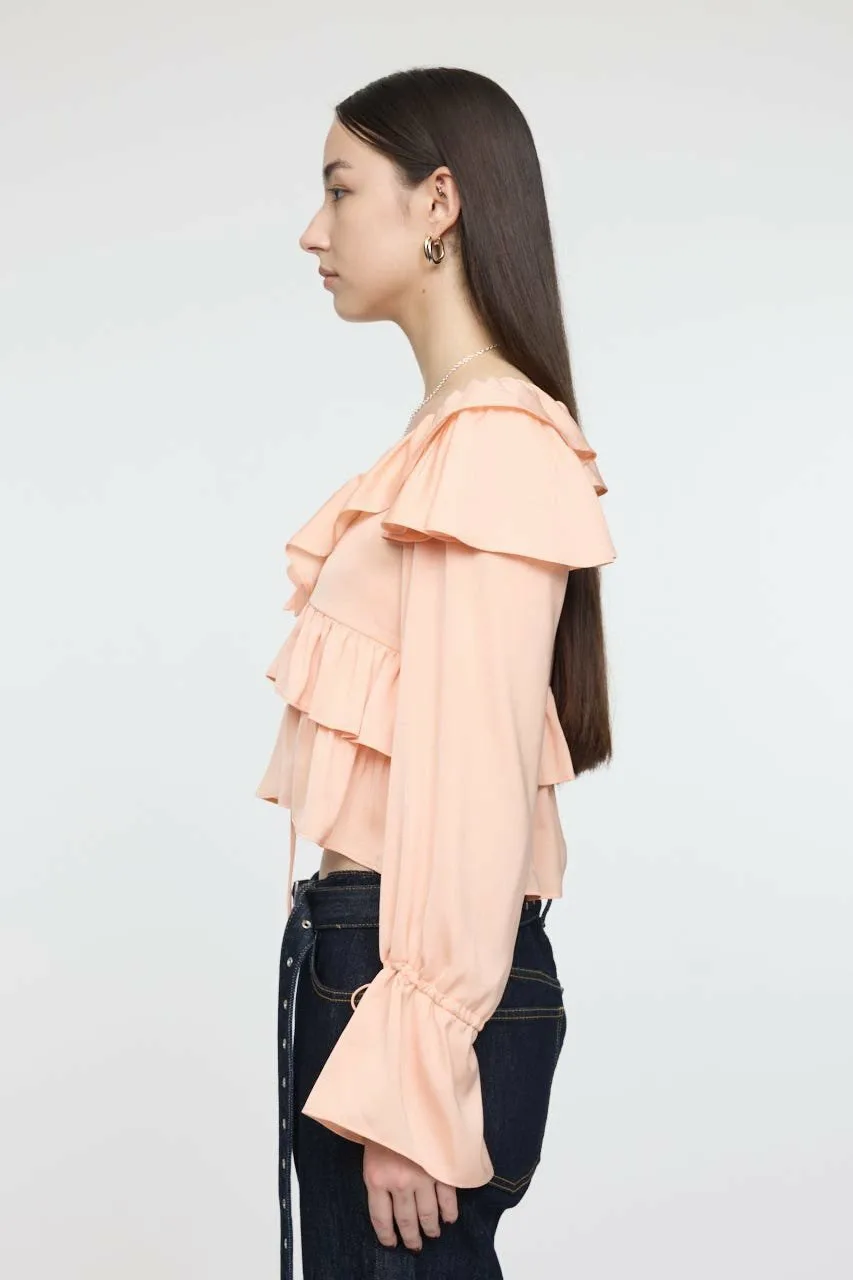 Великолепная модель с оборками на лифе и рукавах.