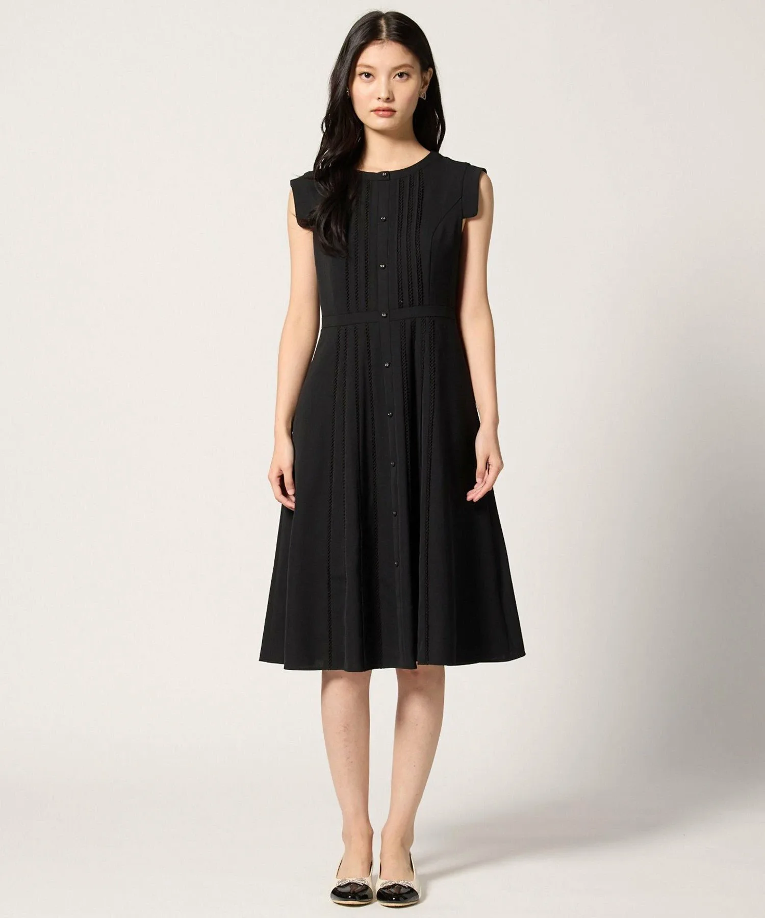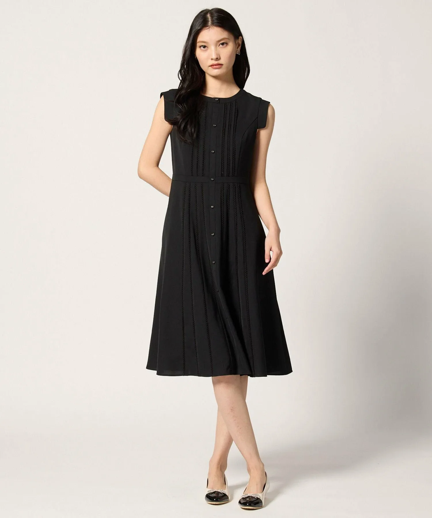 Это платье украшено полосатым кружевом и застежкой на пуговицы спереди, что придает ему элегантный вид.