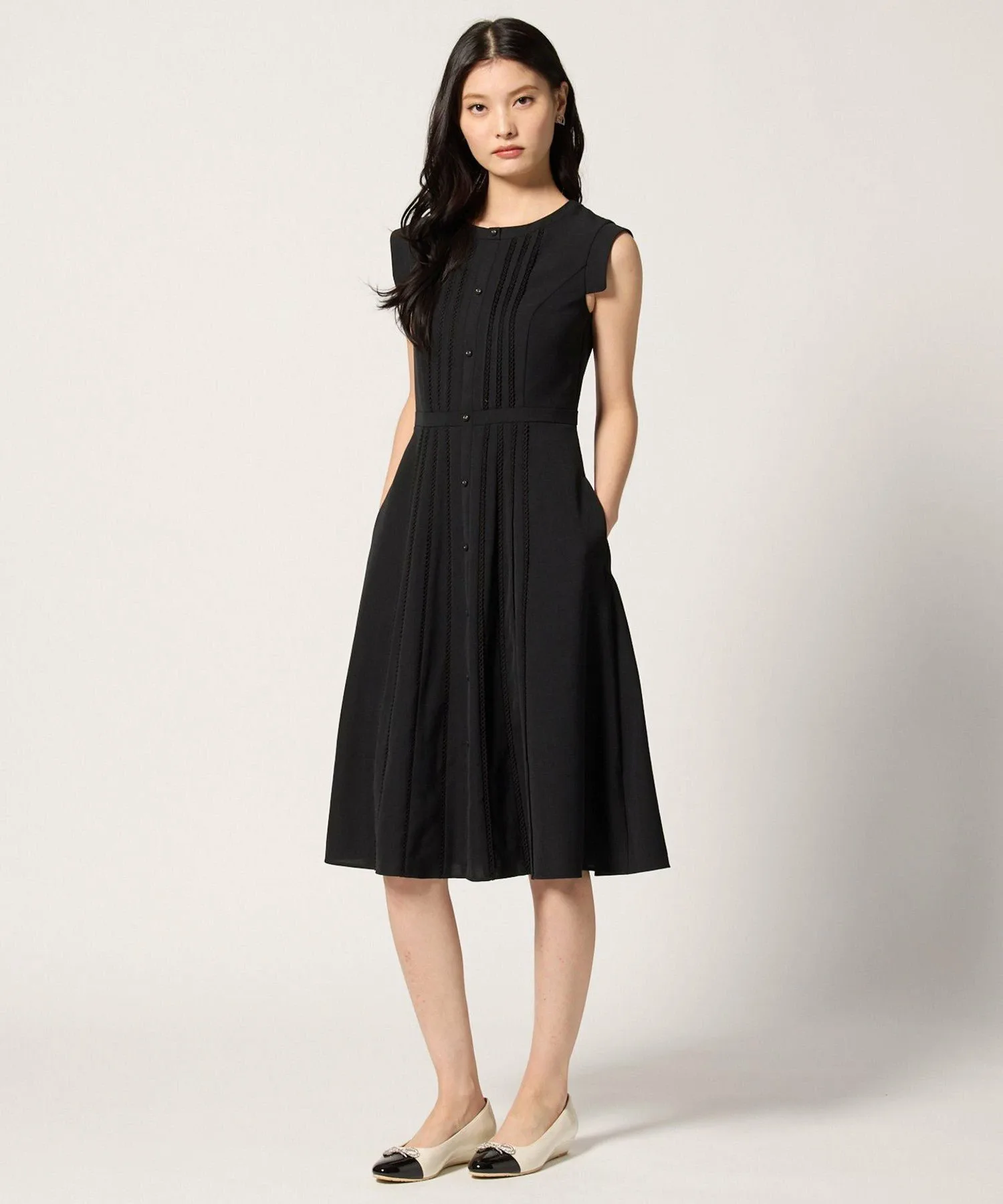 Хотя оно имеет дизайн, напоминающий платье-рубашку, обильное использование кружева и силуэт «приталенное и расклешенное» придают ему женственный вид, не делая его слишком традиционным.