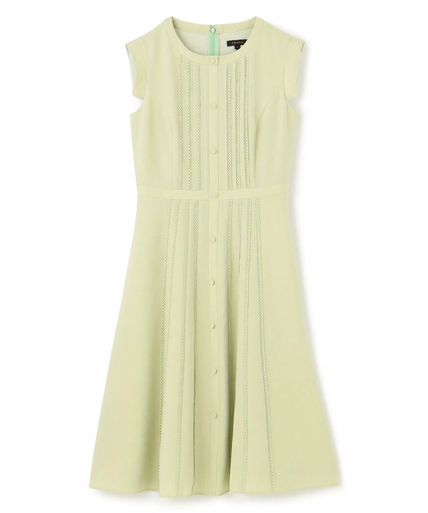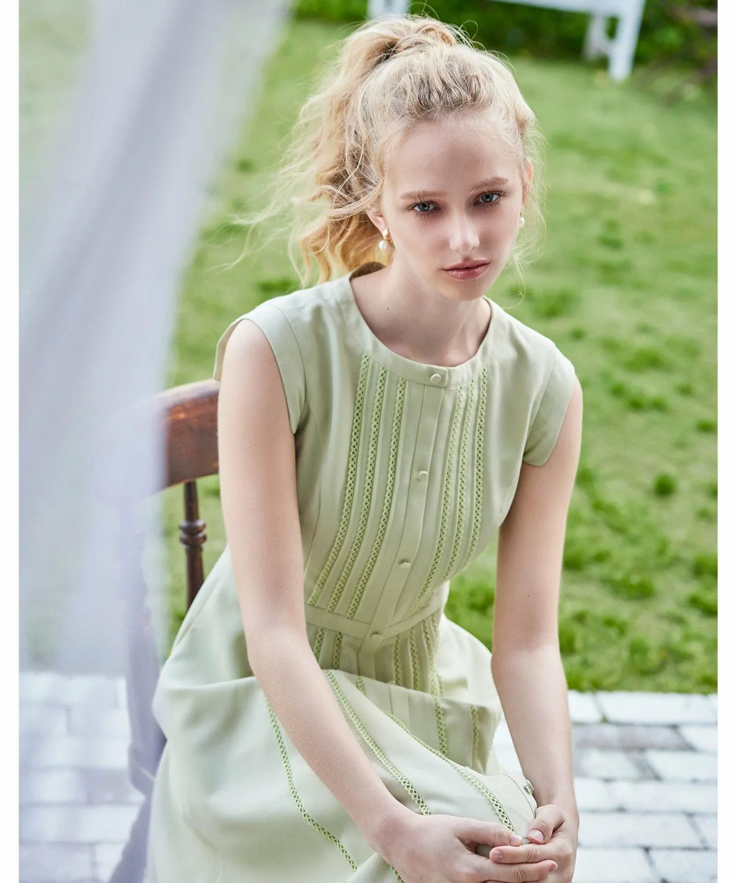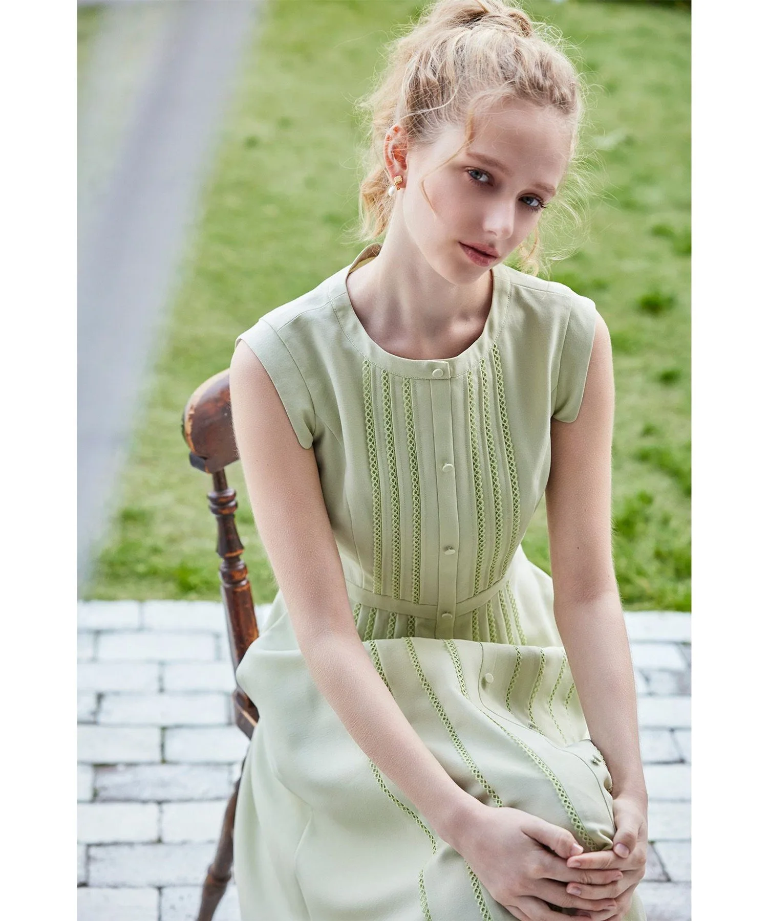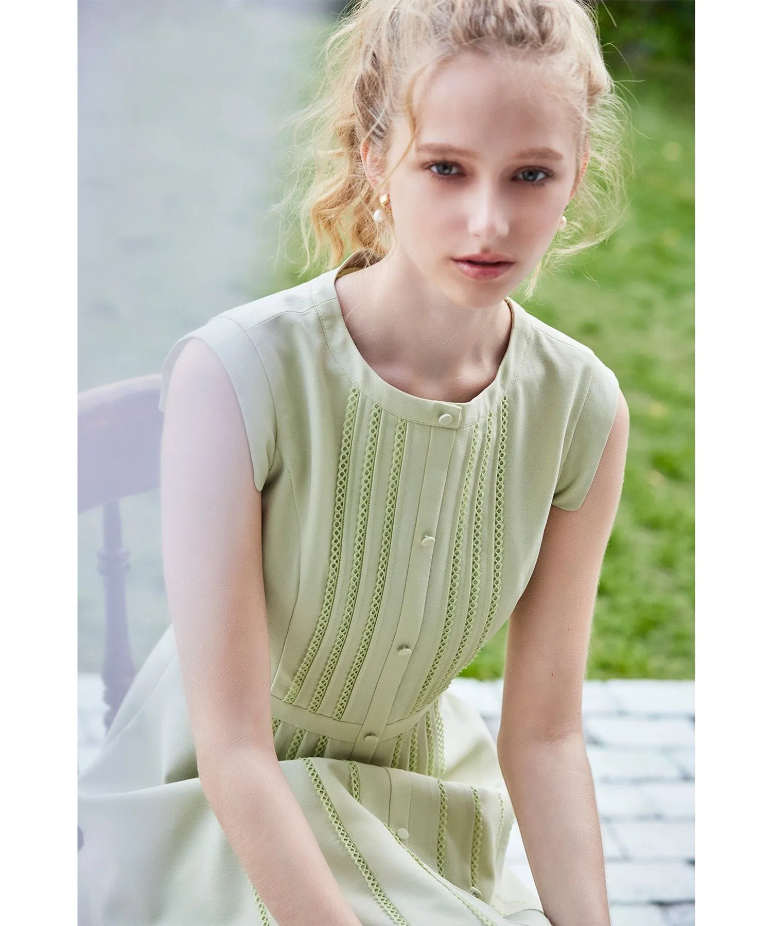 Это платье украшено полосатым кружевом и застежкой на пуговицы спереди, что придает ему элегантный вид.