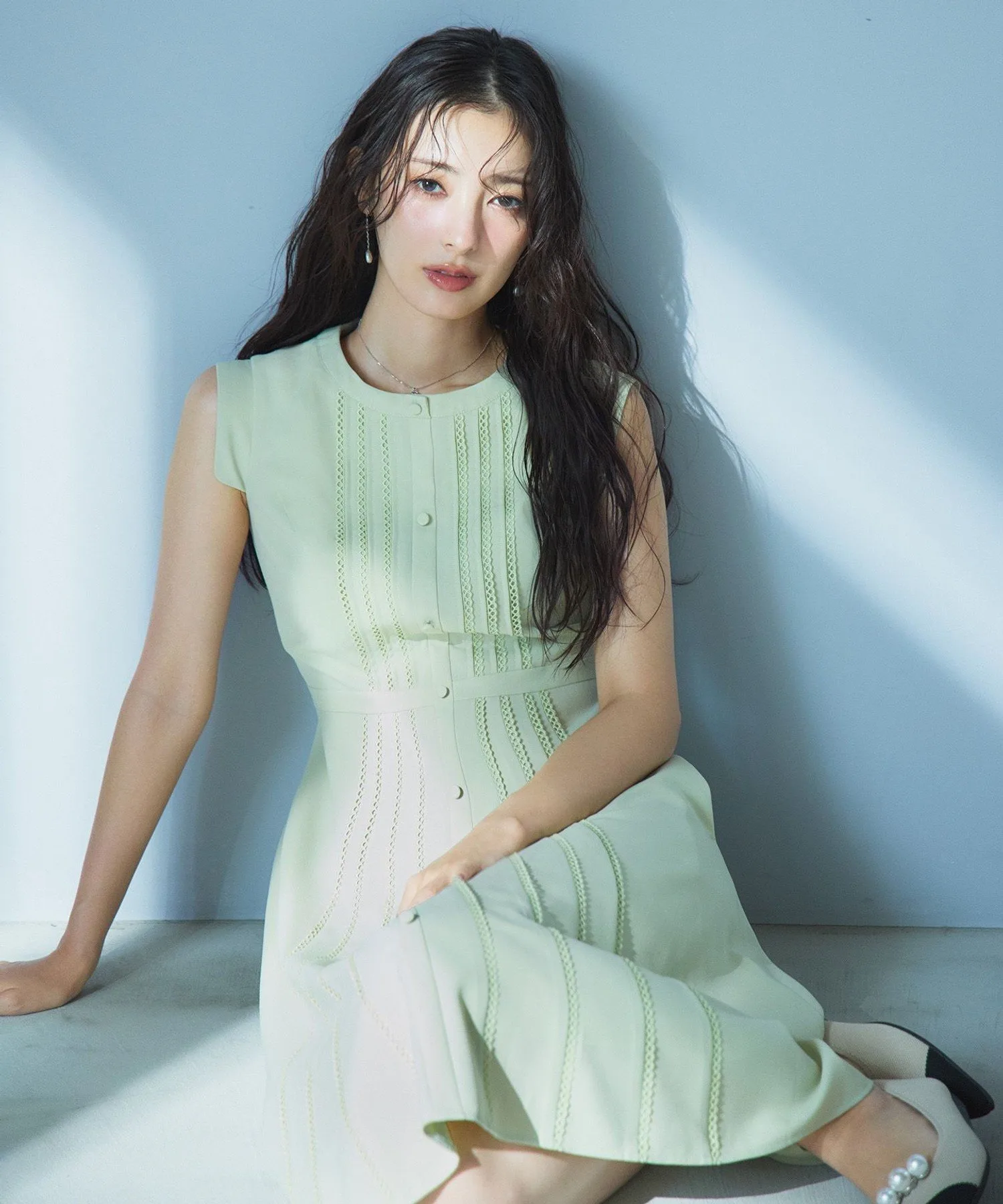 Хотя оно имеет дизайн, напоминающий платье-рубашку, обильное использование кружева и силуэт «приталенное и расклешенное» придают ему женственный вид, не делая его слишком традиционным.