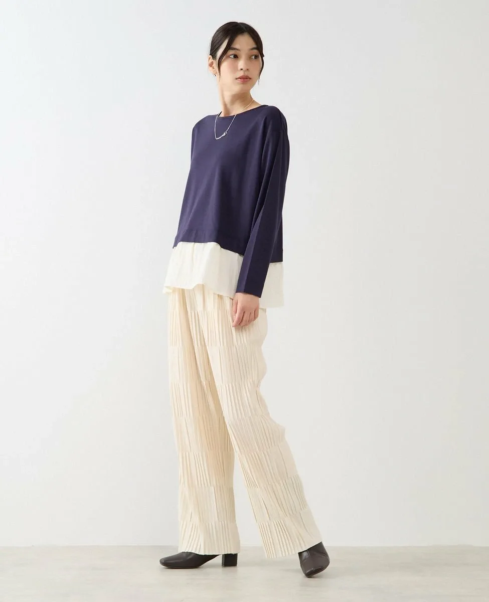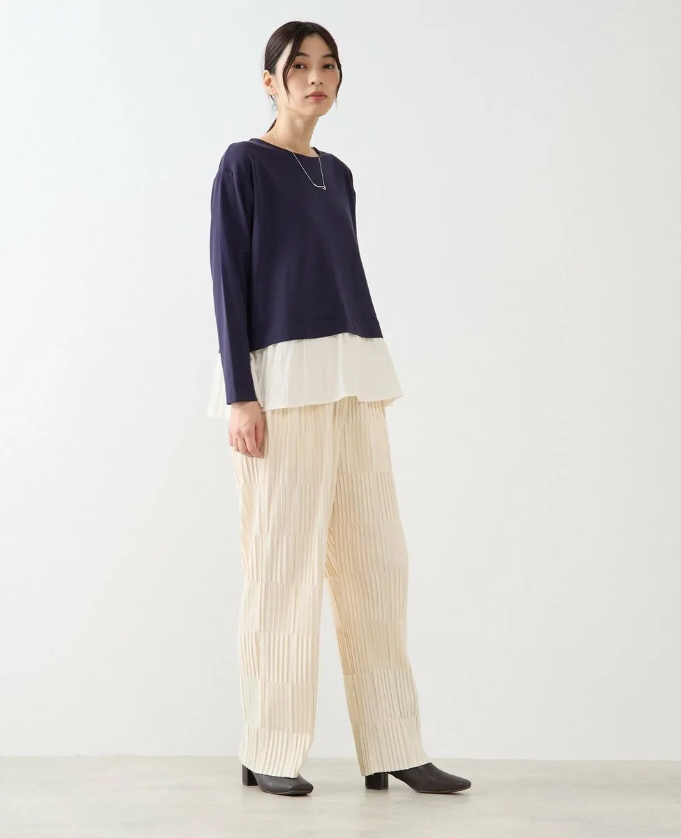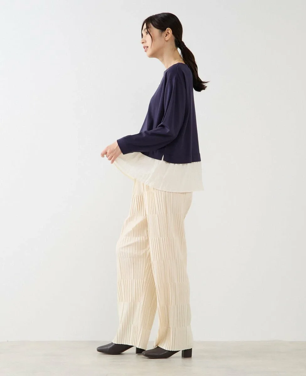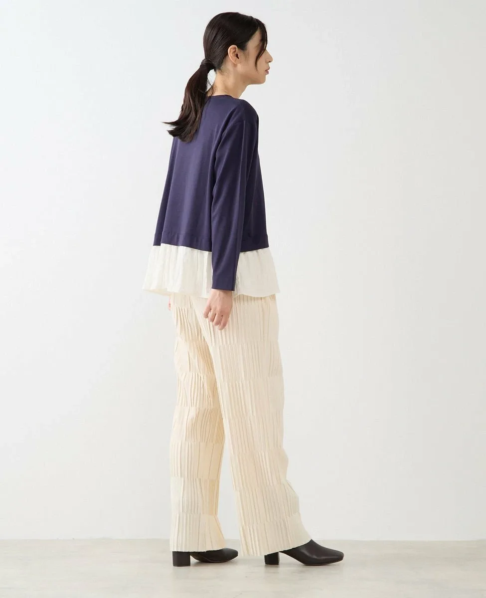 К подолу прикреплена мятая ткань с легким блеском. Это придает изделию слегка элегантный вид, не делая его слишком повседневным, что делает его подходящим для самых разных случаев. Доступен в ассортименте однотонных и полосатых цветов.