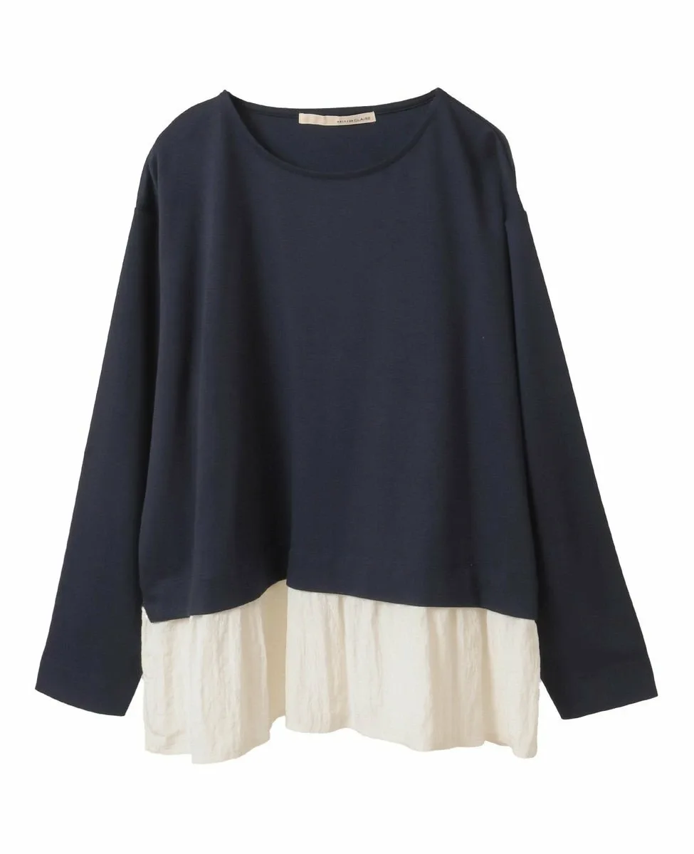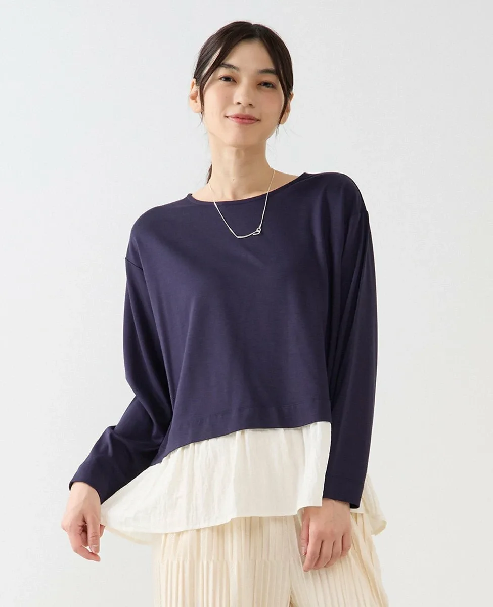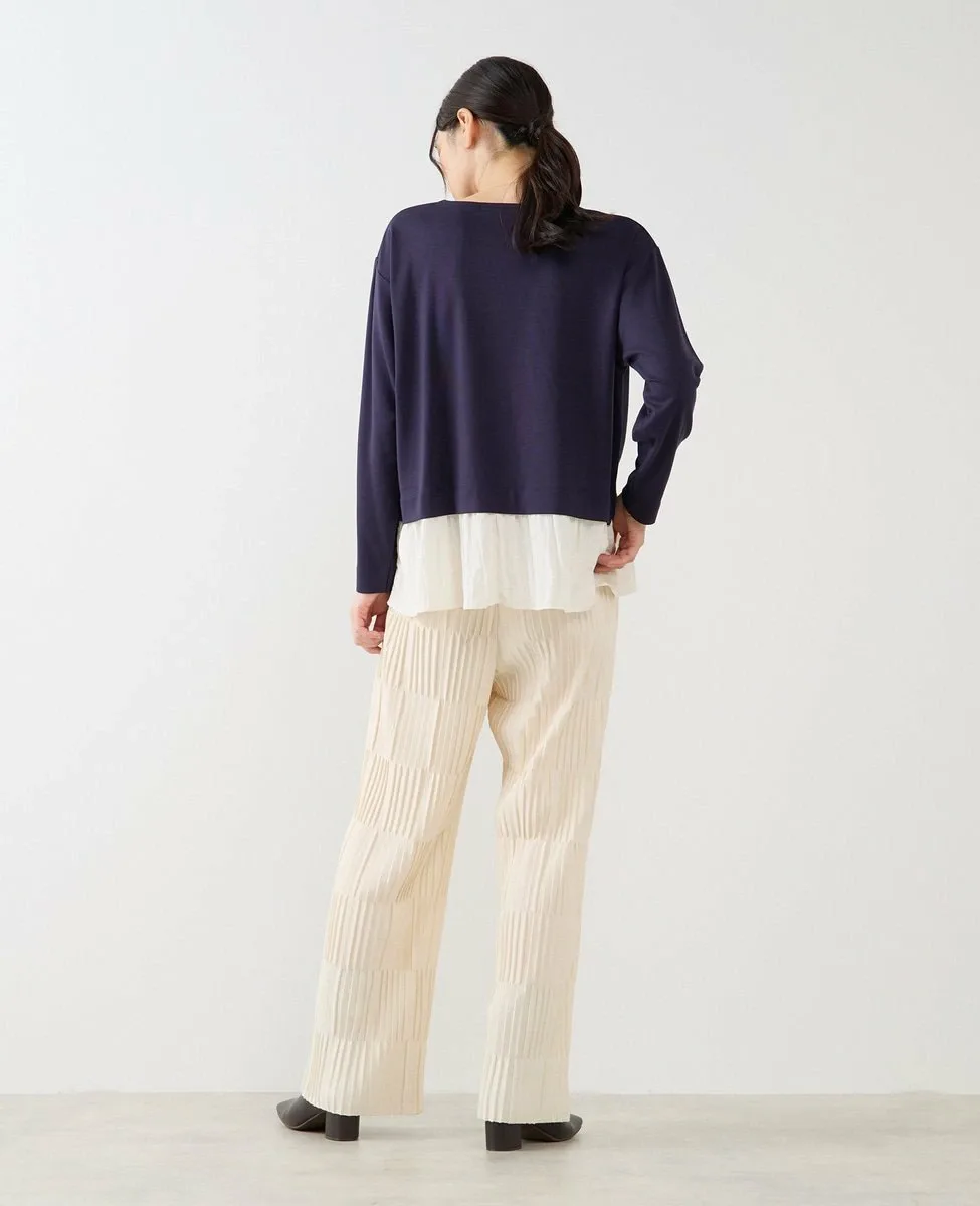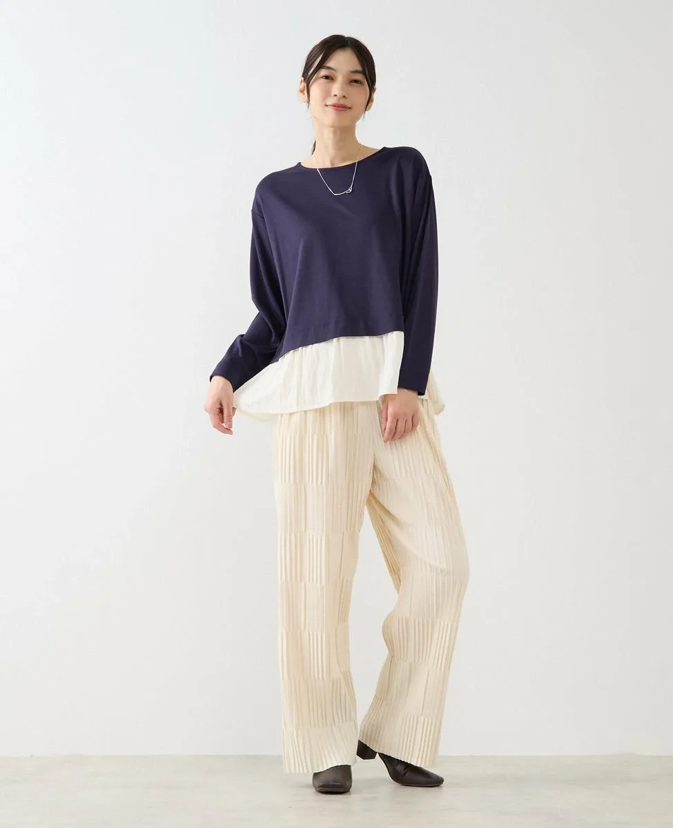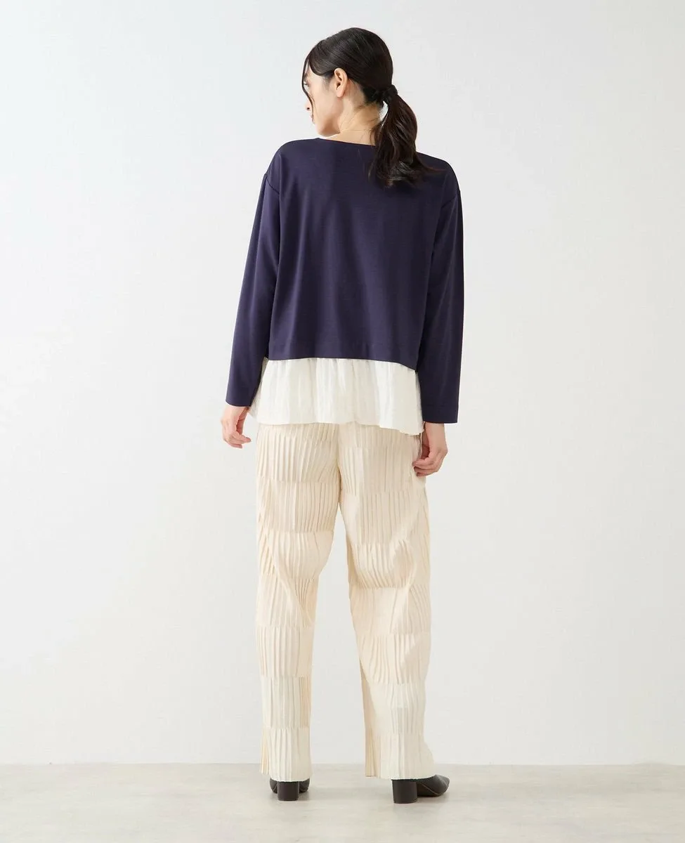 К подолу прикреплена мятая ткань с легким блеском. Это придает изделию слегка элегантный вид, не делая его слишком повседневным, что делает его подходящим для самых разных случаев. Доступен в ассортименте однотонных и полосатых цветов.
