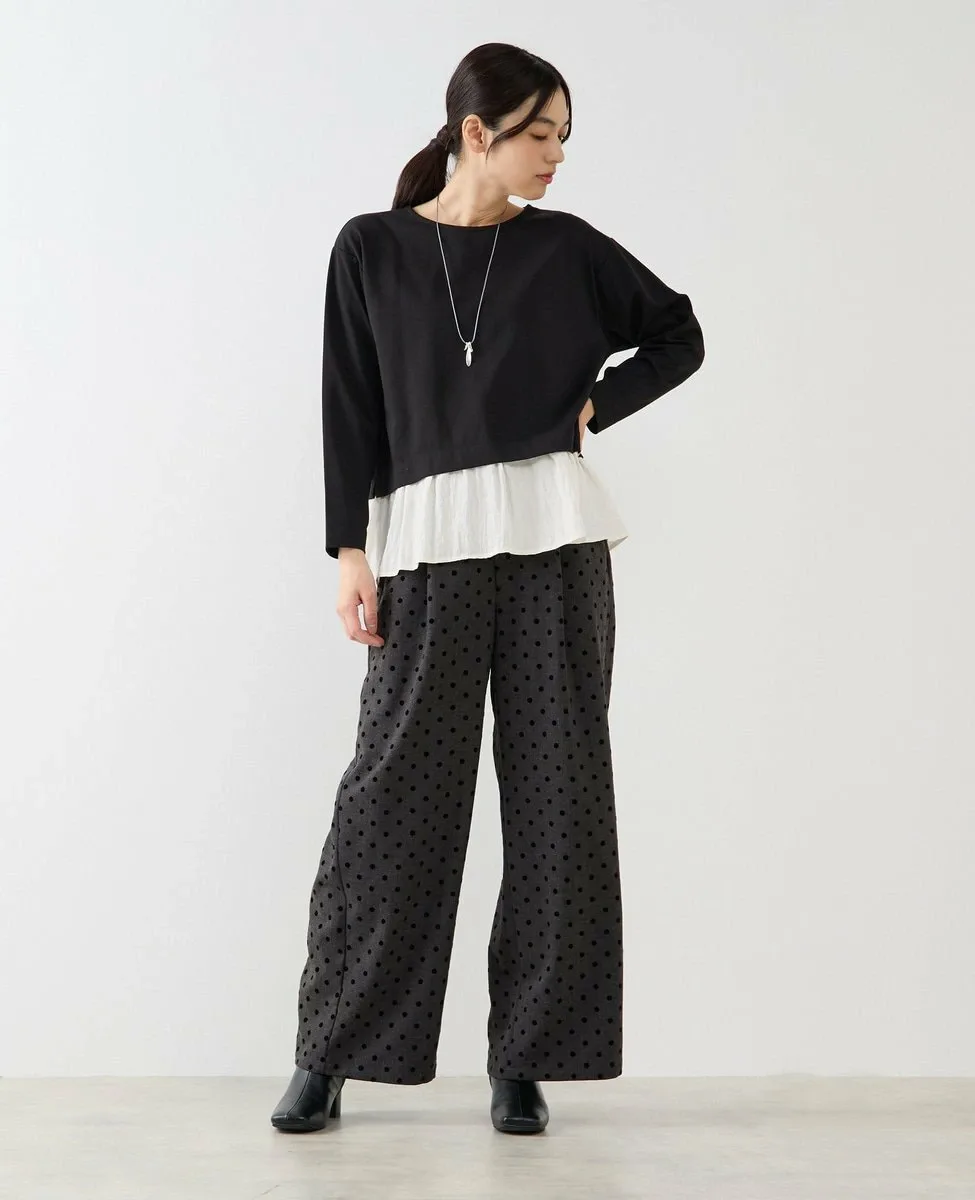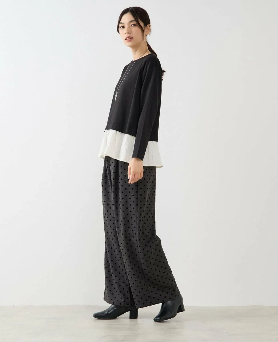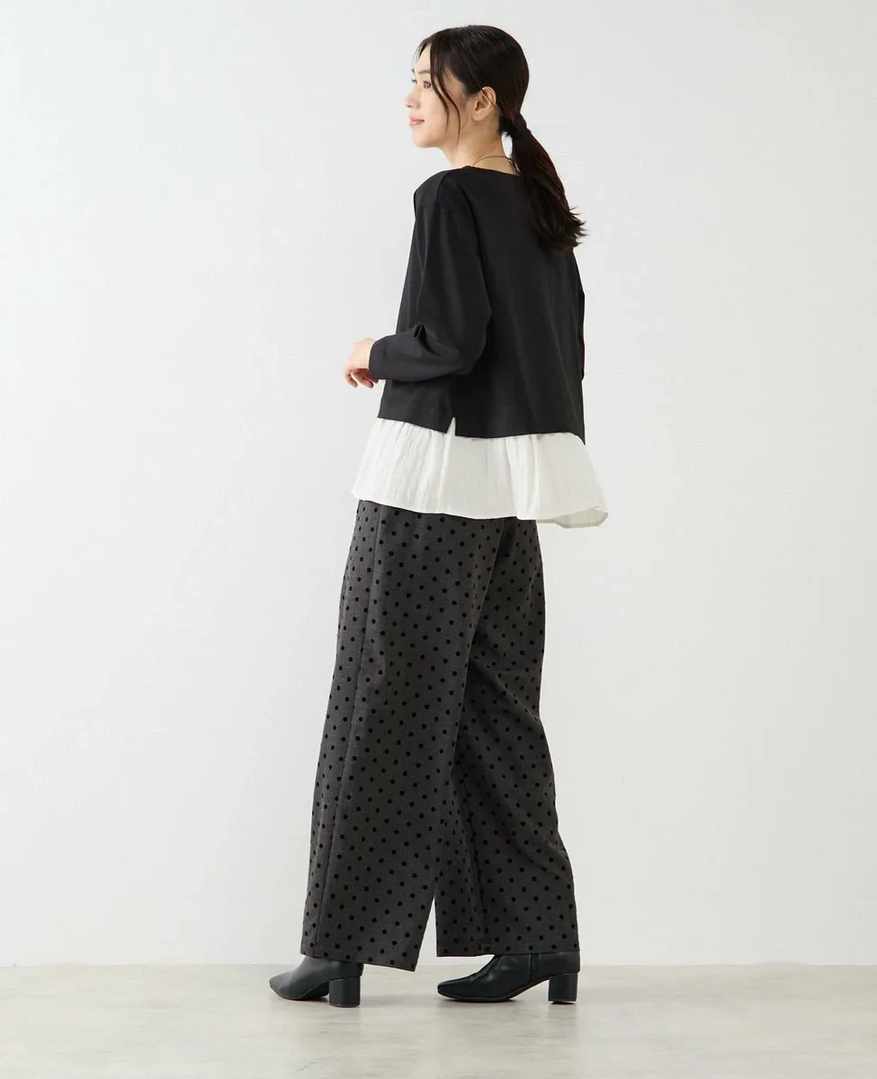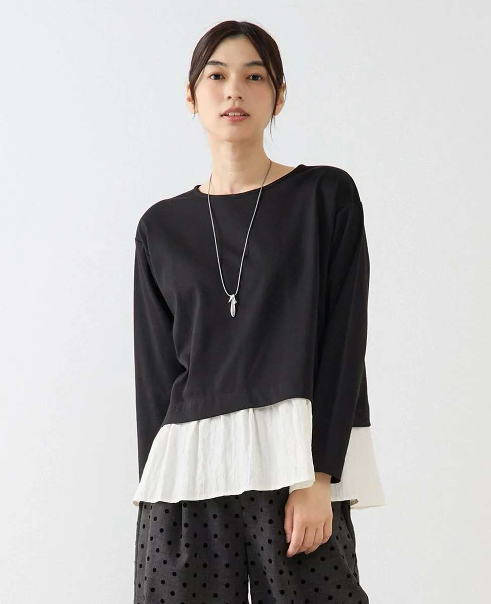 К подолу прикреплена мятая ткань с легким блеском. Это придает изделию слегка элегантный вид, не делая его слишком повседневным, что делает его подходящим для самых разных случаев. Доступен в ассортименте однотонных и полосатых цветов.