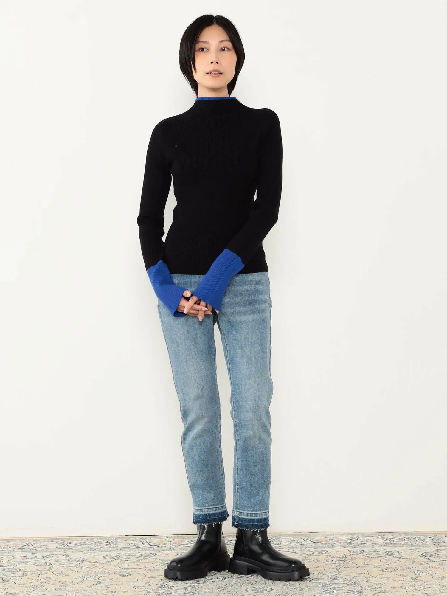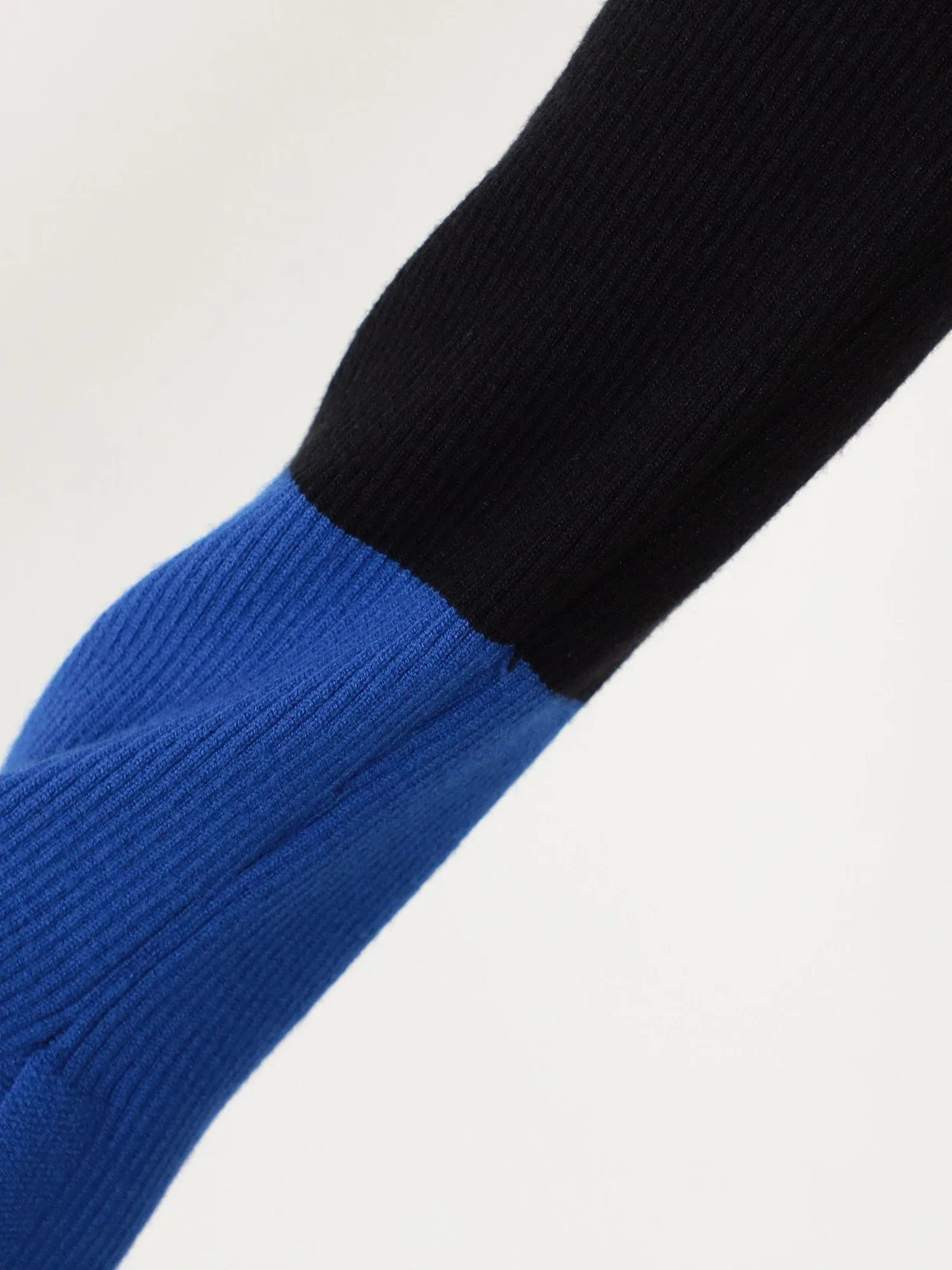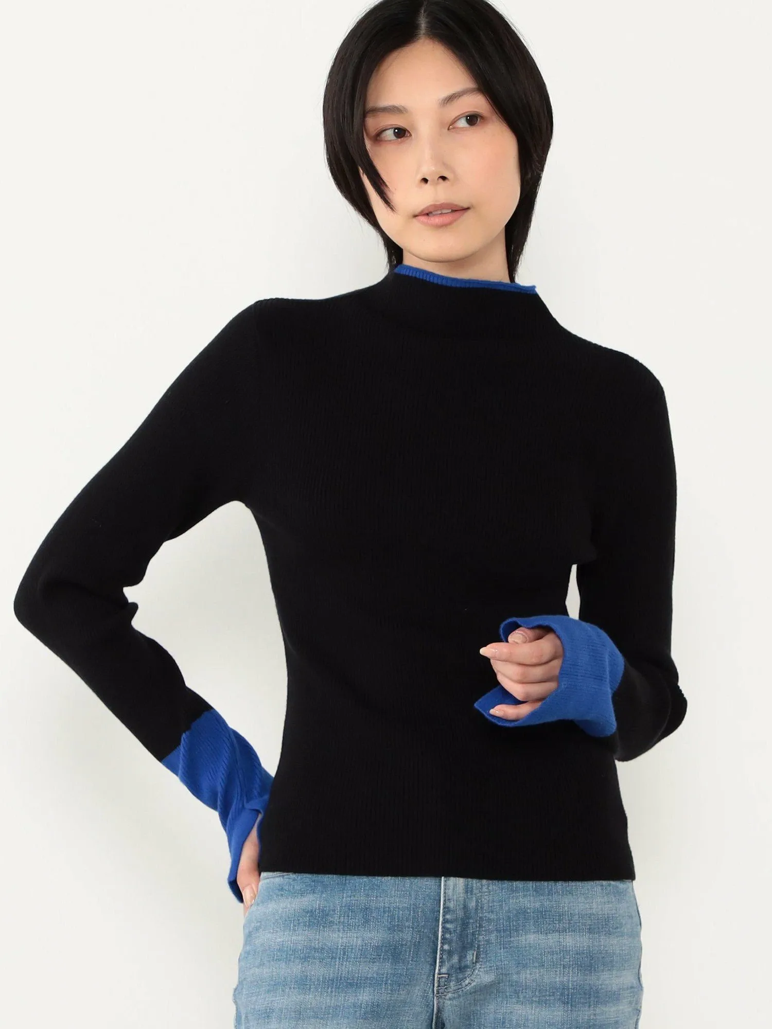 WALDO Это вязаный пуловер с воротником-стойкой, выполненный в контрастных цветах на воротнике и манжетах. Рукава намеренно длиннее, что является еще одной особенностью модели.