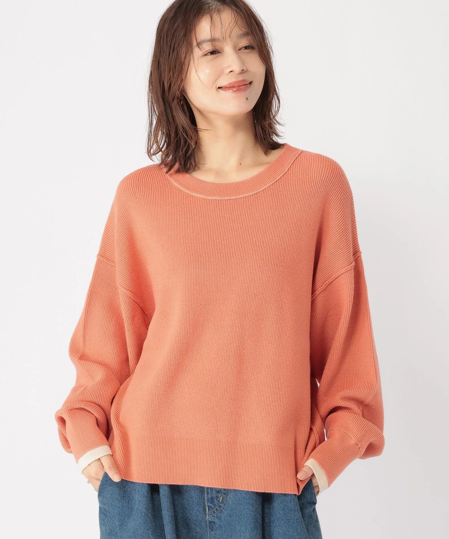 Акцентный цвет вокруг выреза горловины и пройм — отличительная черта этого минималистичного ребристого пуловера.