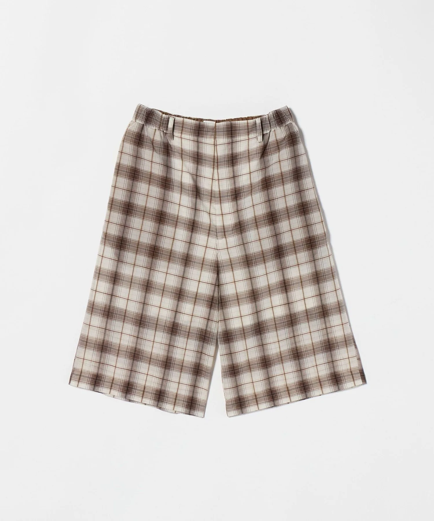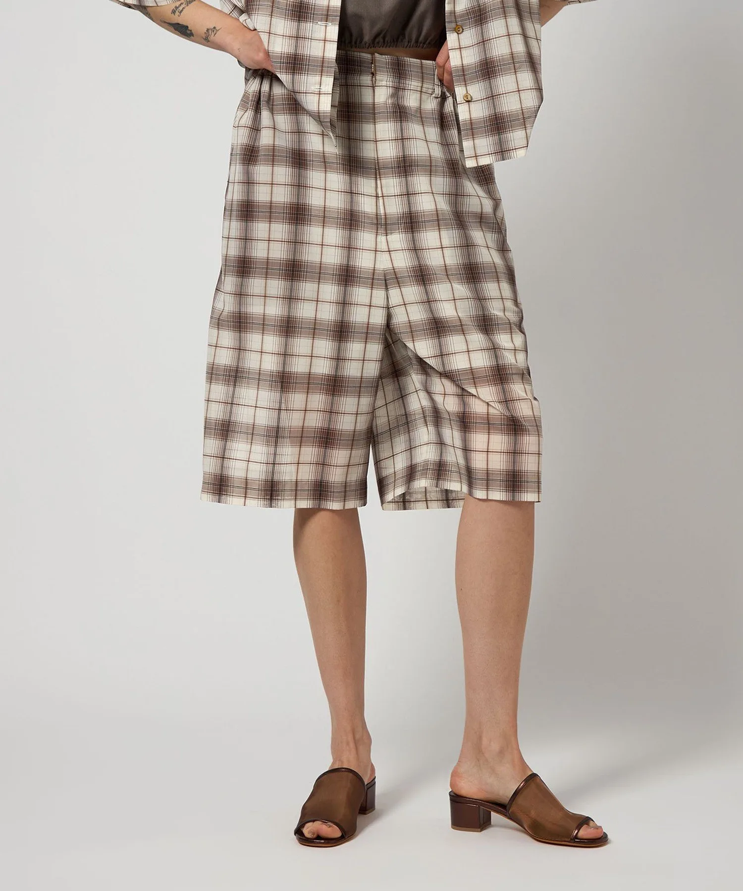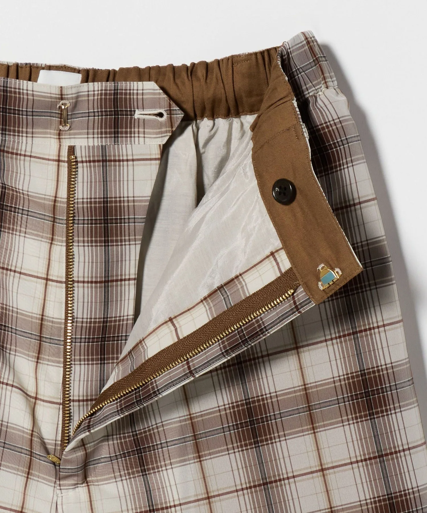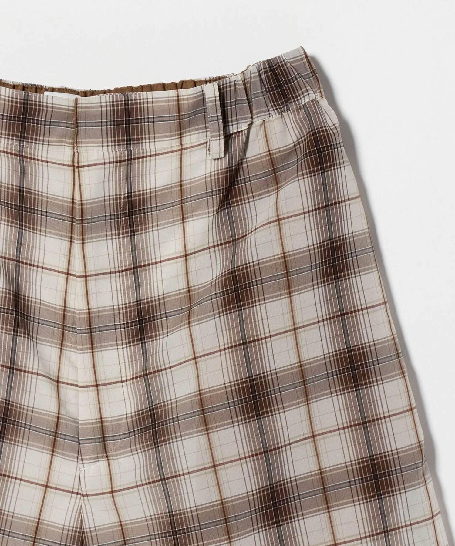 Ретро-шикарные шорты кремового цвета с коричневой клетчатой отделкой.